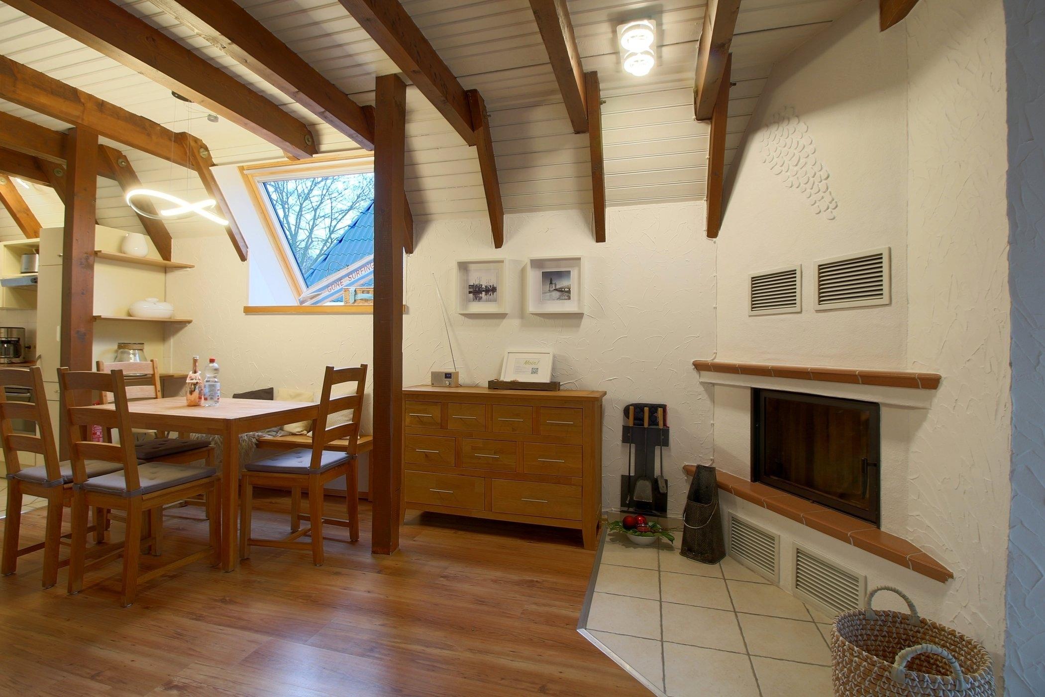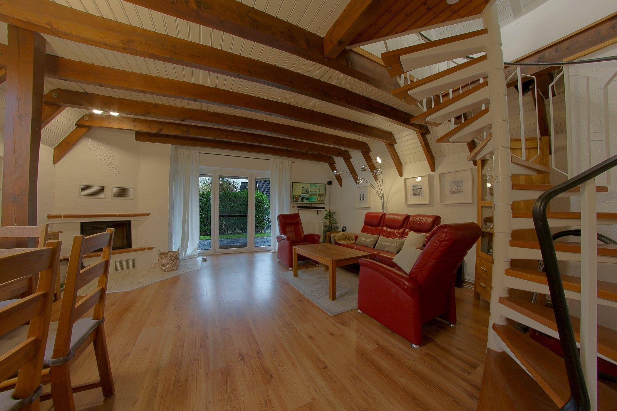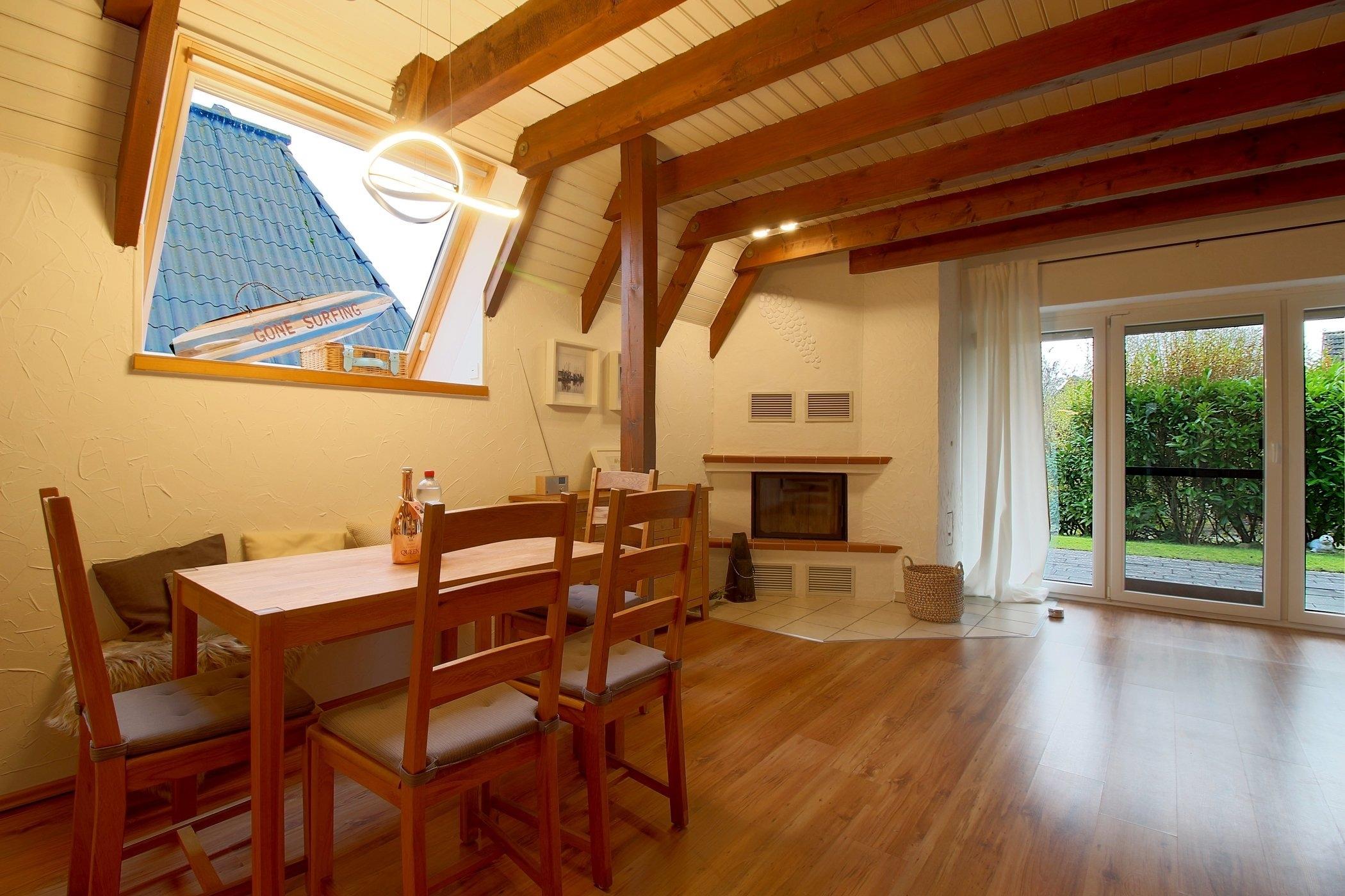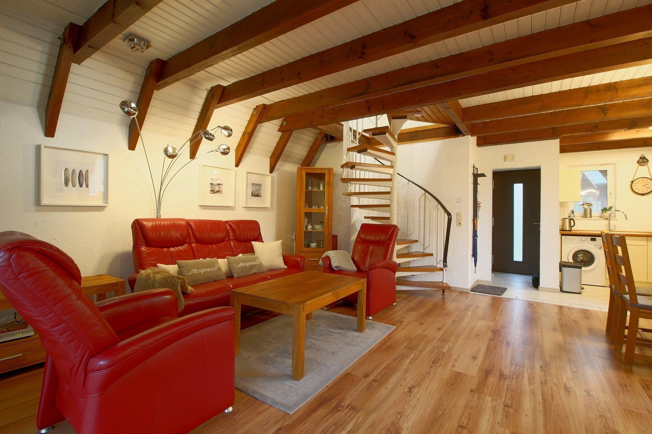 Das Nurdach-Haus befindet sich in einer Sackgasse. Im Erdgeschoß finden Sie einen offenen Wohn-/Ess- und Küchenbereich mit sehr gut ausgestatteter Einbauküche, die keine Wünsche offen lässt und den Smutje allein oder mit seinem Küchenteam zum Kochen einlädt. Die Waschmaschine ist praktischerweise in der Küchenzeile eingebaut.