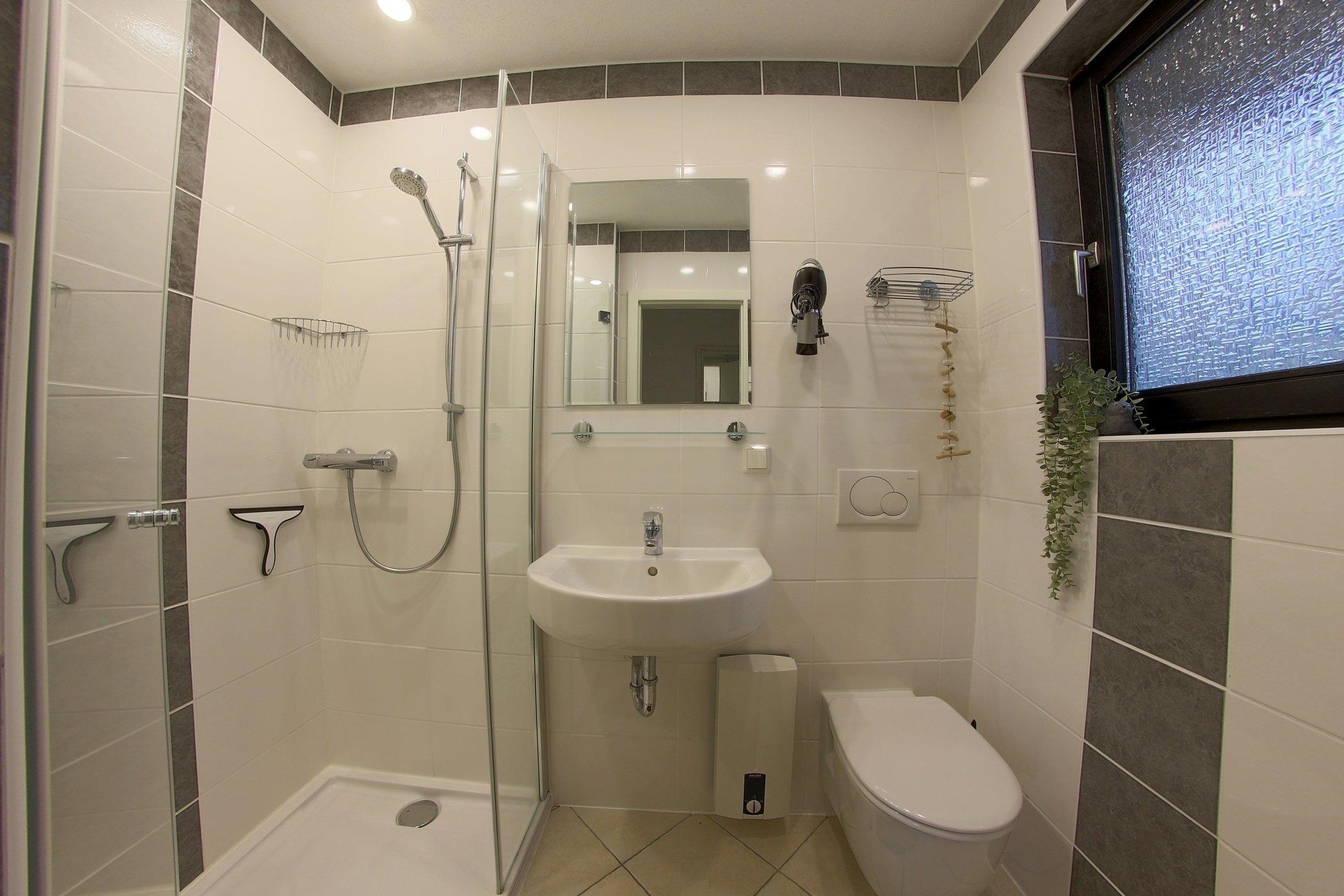 Das Duschbad mit begehbarer großer Dusche und WC liegt ebenfalls im Erdgeschoß.
