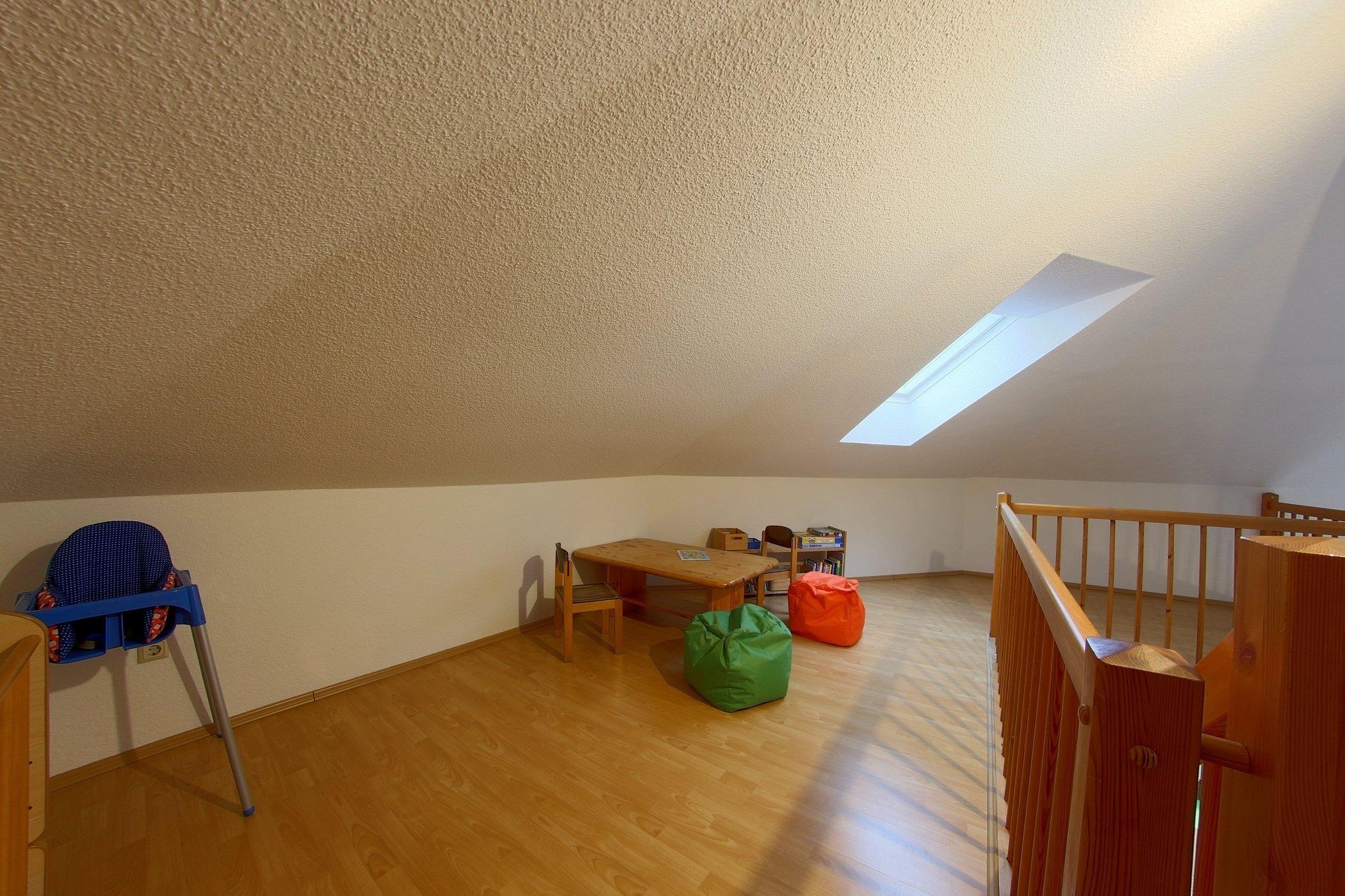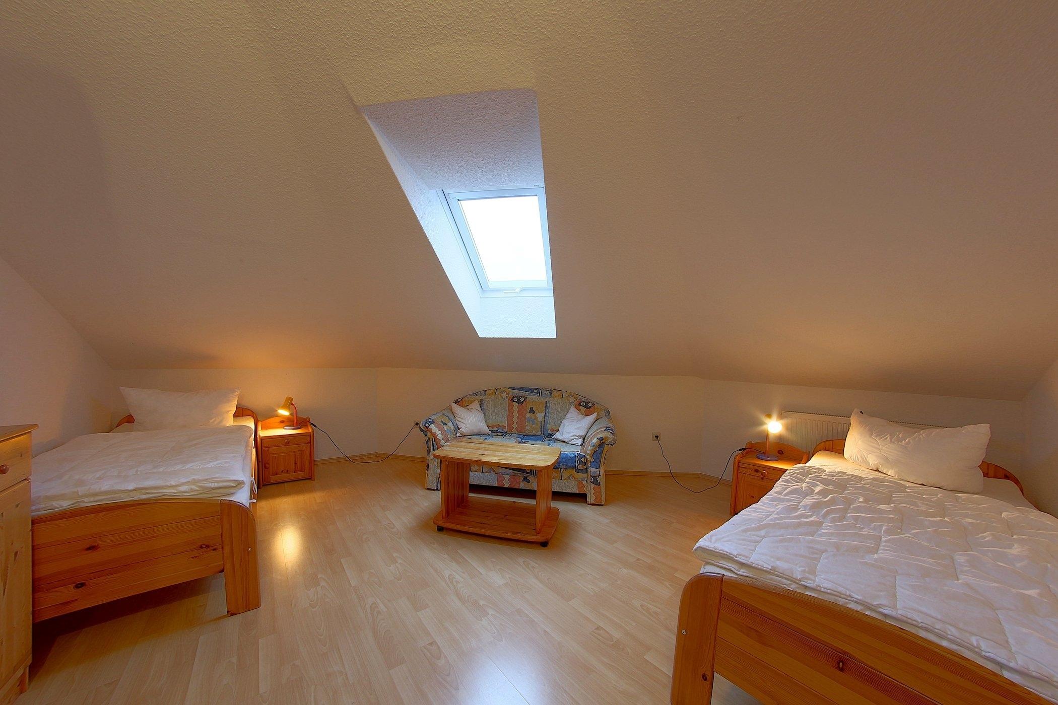 Im Obergeschoss gibt es einen weiteren Schlafraum mit 2 Einzelbetten und einem Gitterbett für Kleinkinder.