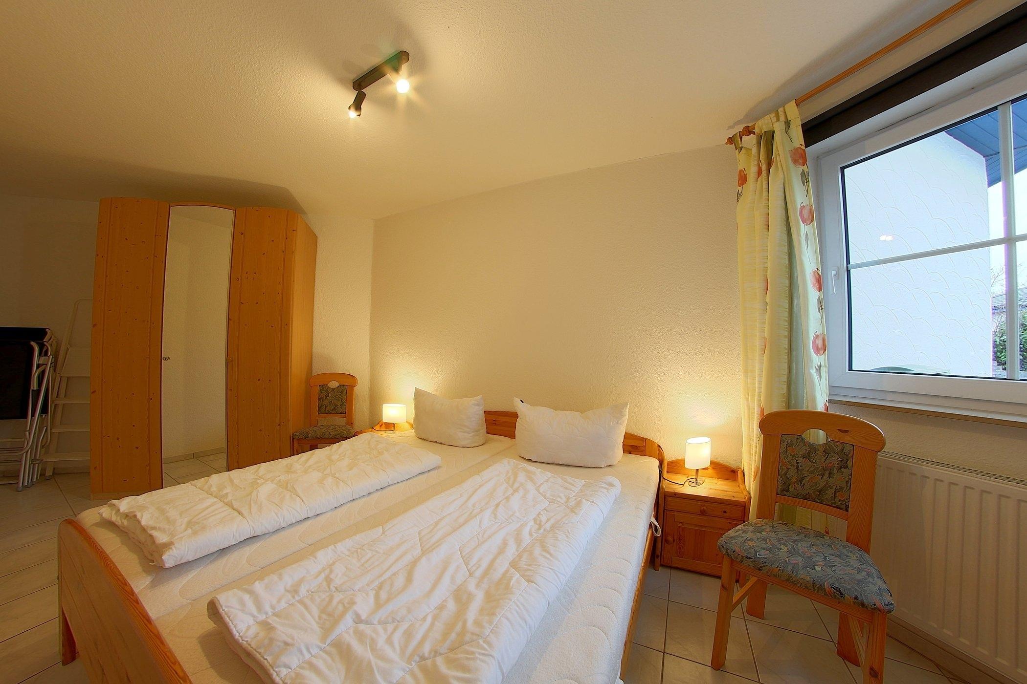 Ein Schlafzimmer mit Doppelbett und geräumigem Kleiderschrank, sowie ein Duschbad mit WC ebenfalls im Erdgeschoss.
