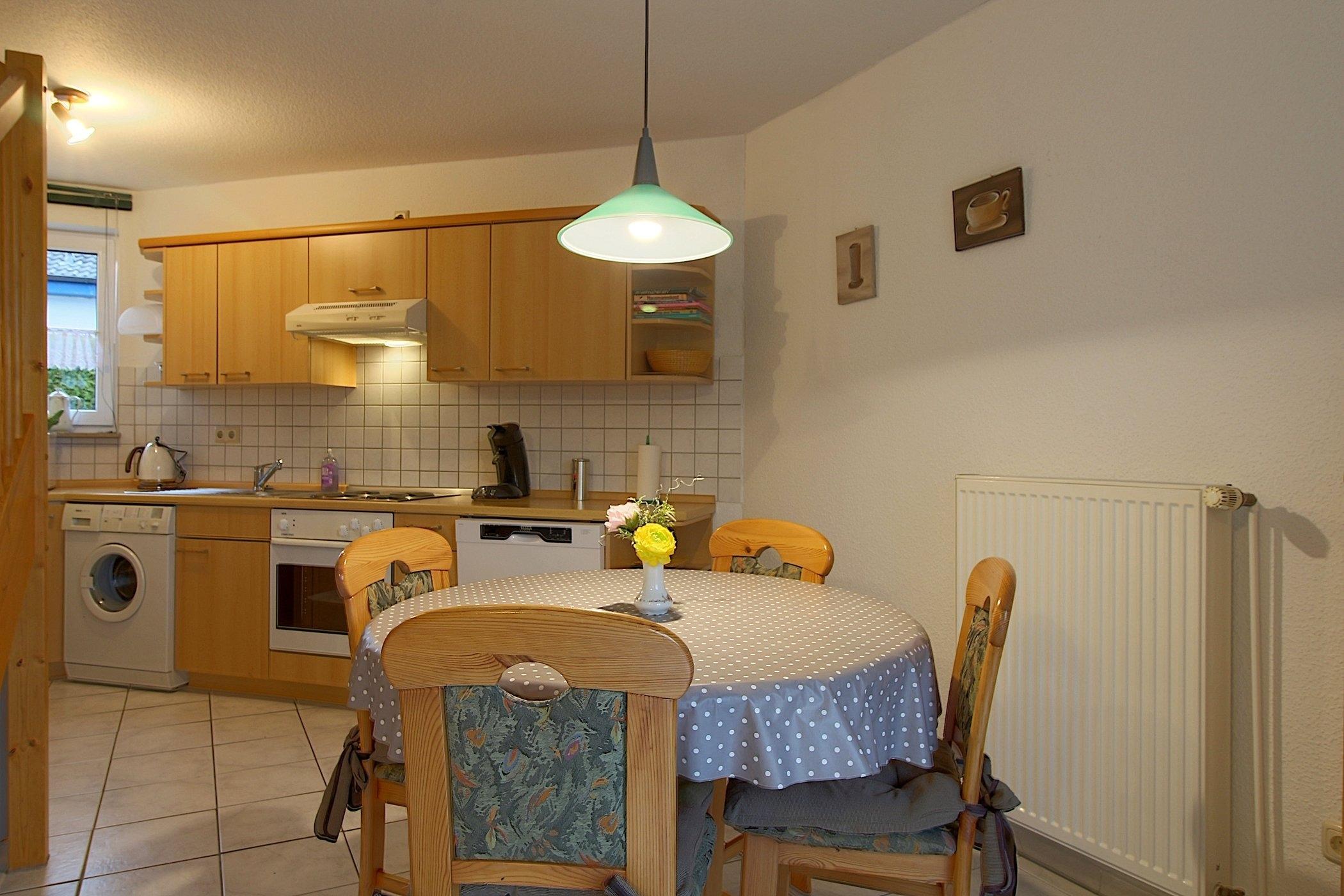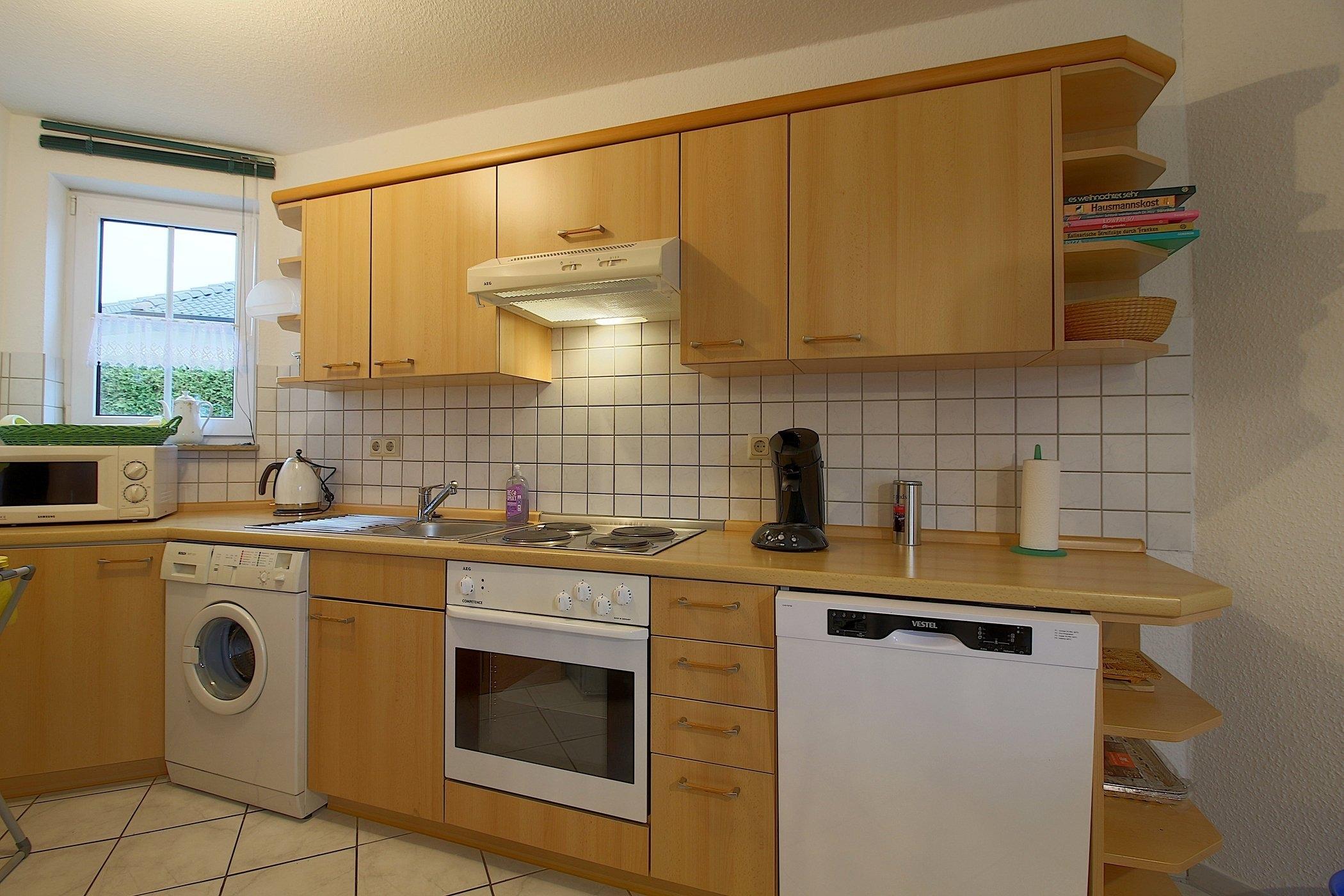 Die offene Küche mit E-Herd mit Backofen, Kühlschrank mit Gefrierfach, Kaffeemaschine, Toaster, Mikrowelle, Geschirrspüler und komplettem Geschirr lädt zum kochen ein.