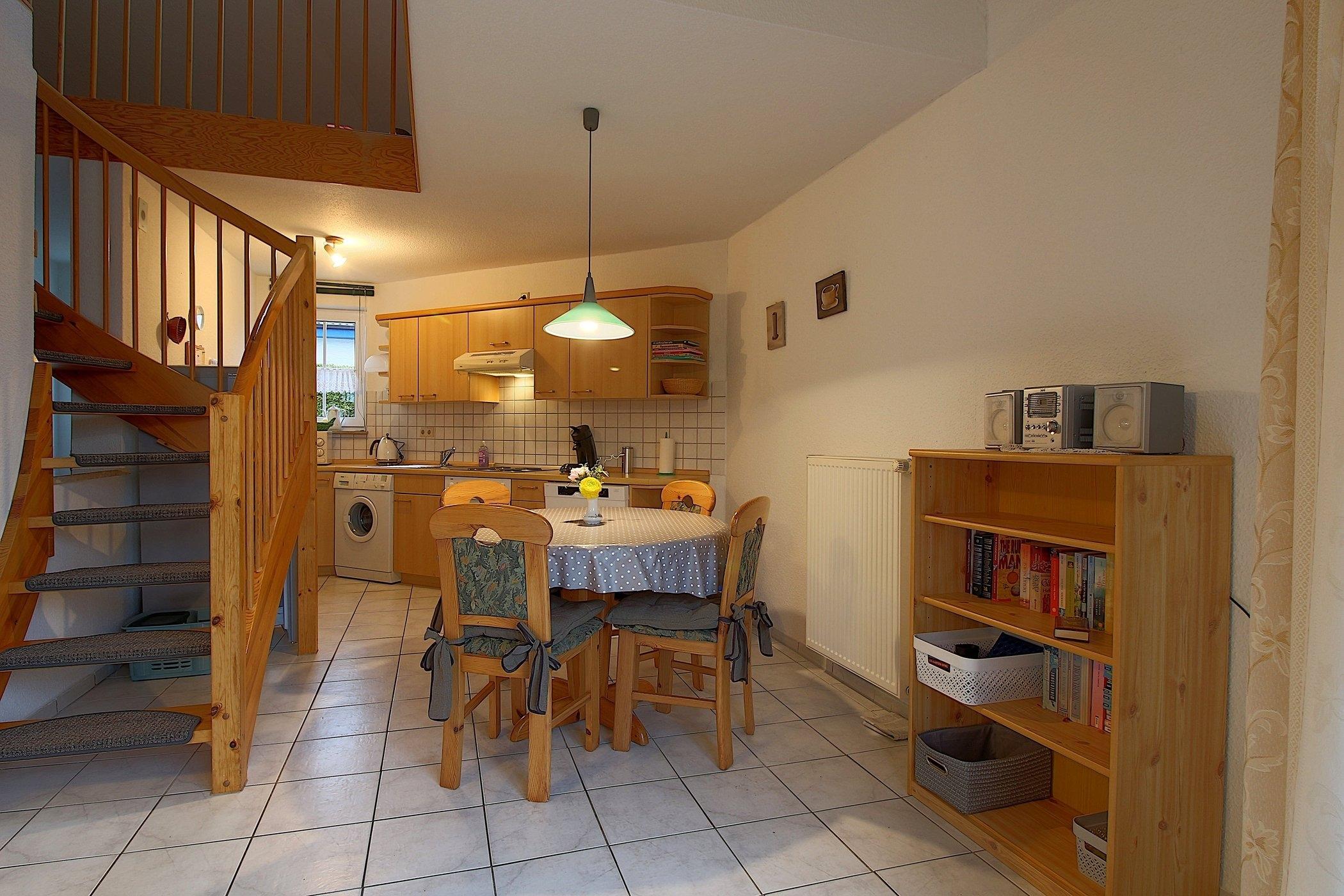 Im Erdgeschoss verfügt das Haus über einen komplett gefliesten Wohnbereich mit Flachbild-TV, Sitzecke, Essplatz für 4 Personen und Ausgang auf die Terrasse.