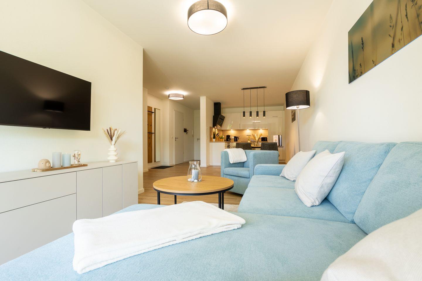 Im Wohnbereich erwartet dich eine bequeme Couch, ein Flachbild-TV sowie ein Essplatz mit Blick ins Grüne. Große Fenster und helle Farben schaffen eine freundliche Atmosphäre – perfekt zum Abschalten nach einem Tag am Meer.