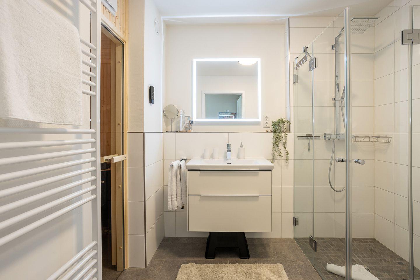 Das moderne Duschbad bietet dir alles, was du für deine tägliche Pflege brauchst: eine komfortable Dusche, Waschbecken, Spiegel und genügend Stauraum für deine Utensilien.