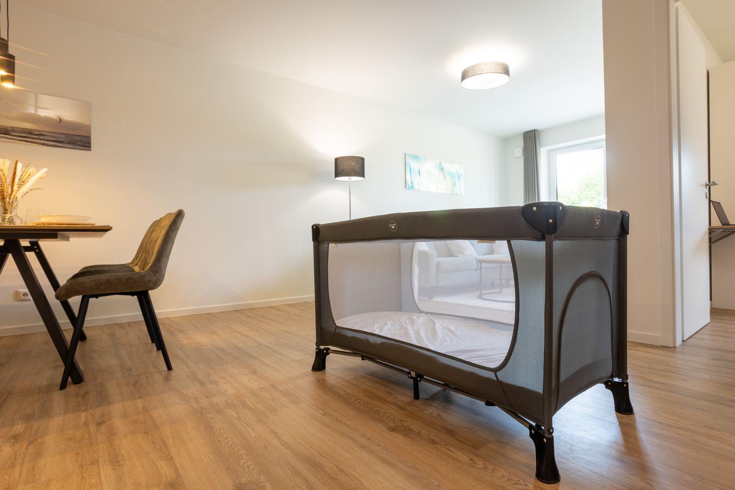 Auch mit Kind bist du hier bestens aufgehoben: Kinderspielplatz in der Nähe, Hochstuhl und Reisebett vorhanden. Die Region lädt zu familienfreundlichen Ausflügen ein – ob Strand, Spielscheune oder Wattwanderung.
