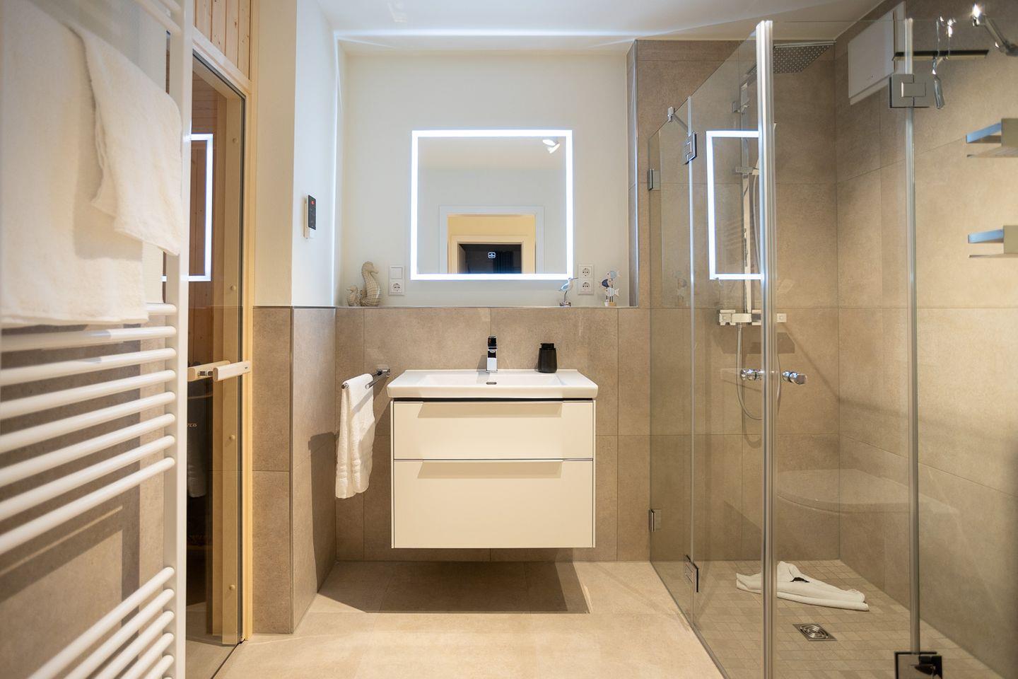 Das moderne Bad punktet mit großer Dusche, Sauna, Tageslichtfenster und Handtuchheizung. Hier startest du frisch in den Tag und lässt ihn entspannt ausklingen.