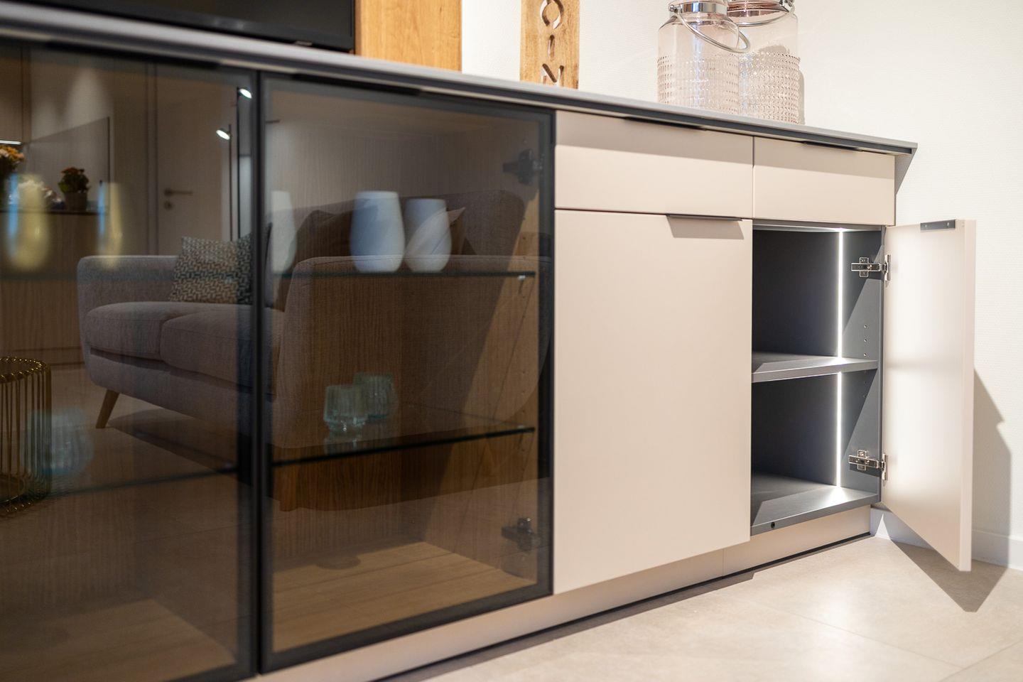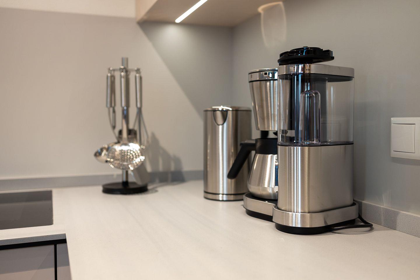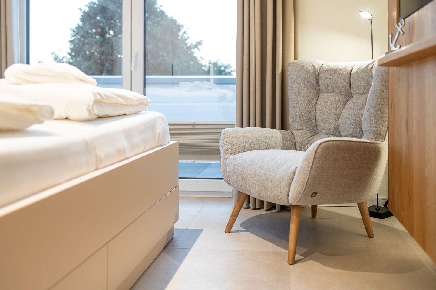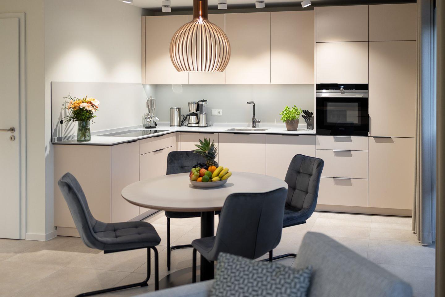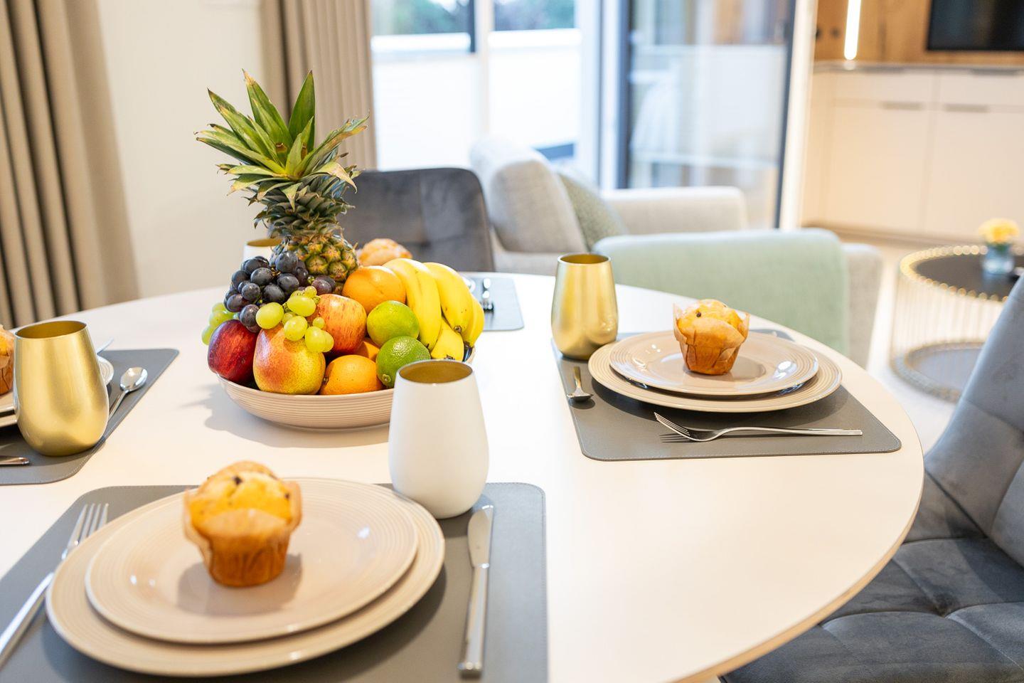 Im offenen Wohnbereich genießt du lichtdurchflutete Räume mit moderner Einrichtung. Ein gemütliches Sofa, Smart-TV, Essbereich und die voll ausgestattete Küche mit Spülmaschine machen es dir leicht, dich wie zuhause zu fühlen. Durch die große Glastür gelangst du direkt auf den Balkon mit herrlichem Blick ins Grüne.