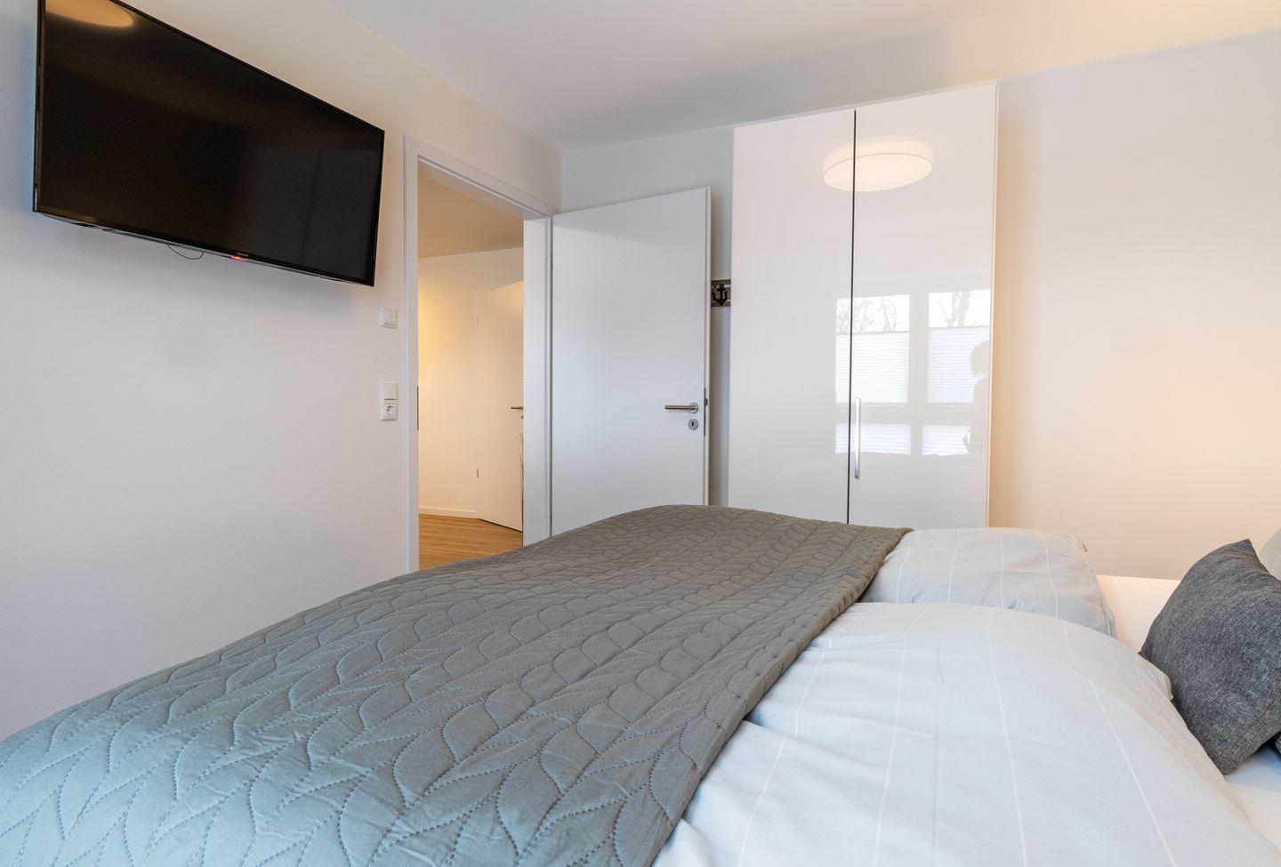 Der offene Wohnbereich lädt mit seinem gemütlichen Sofa, einem Smart-TV und einem Essbereich zum Entspannen ein. Durch die große Fensterfront fällt viel Licht, und die möblierte Terrasse ist direkt zugänglich – hier genießt du die Nordseeluft in vollen Zügen.