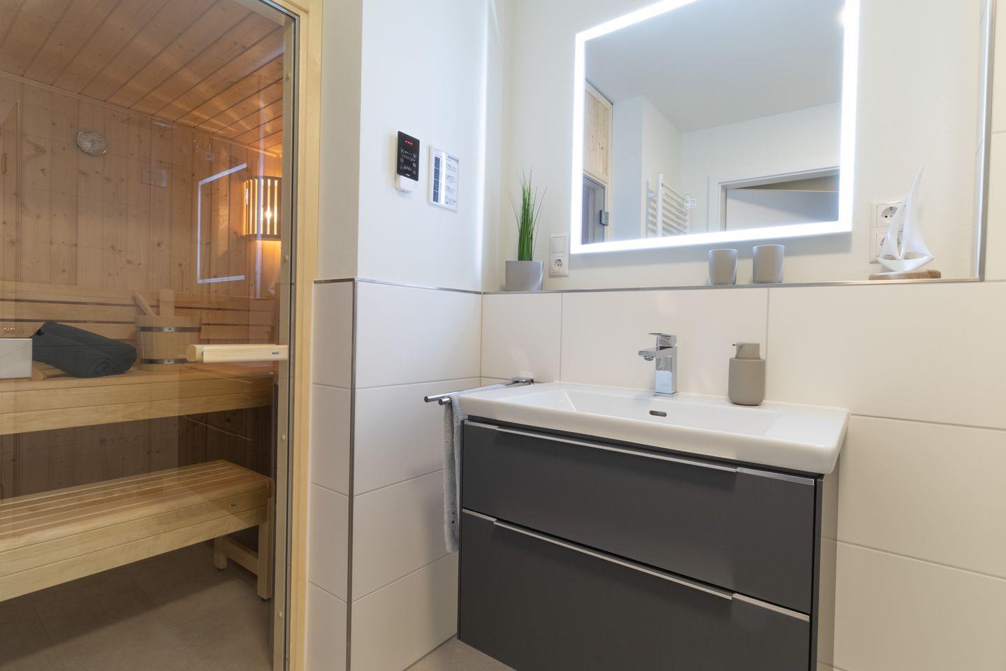 Das moderne Badezimmer bietet dir eine bodengleiche Dusche und eine eigene Sauna. Nach einem Tag am Meer entspannst du hier in deinem privaten Wellnessbereich. Die hochwertige Ausstattung sorgt für Komfort und eine angenehme Atmosphäre.