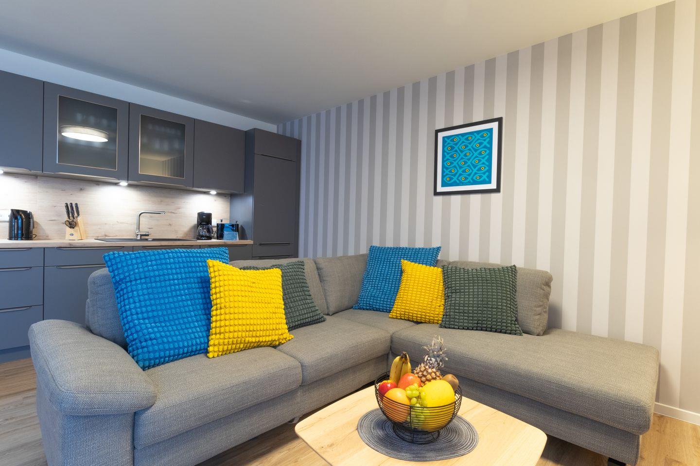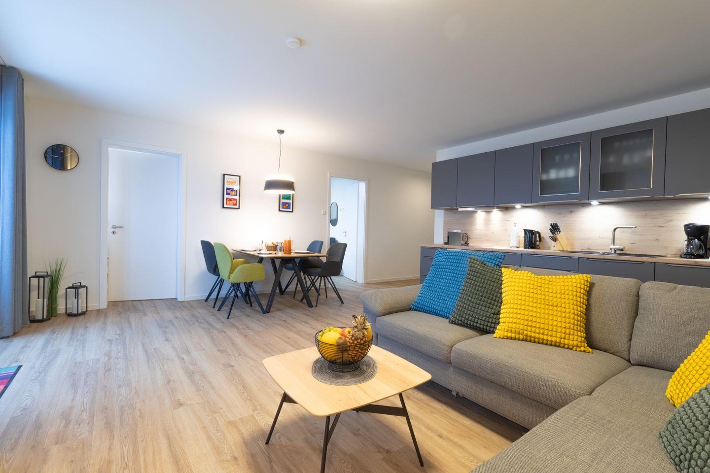Der lichtdurchflutete Wohn- und Essbereich empfängt dich mit viel Raum und direktem Zugang zur großzügigen Dachterrasse. Hier genießt du den weiten Blick und entspannte Stunden an der frischen Nordseeluft. Bequeme Sitzmöbel und der große Esstisch schaffen den passenden Rahmen für gemeinsame Abende. Die offene Küche ist modern ausgestattet und bietet dir alles, was du für deine Mahlzeiten brauchst.