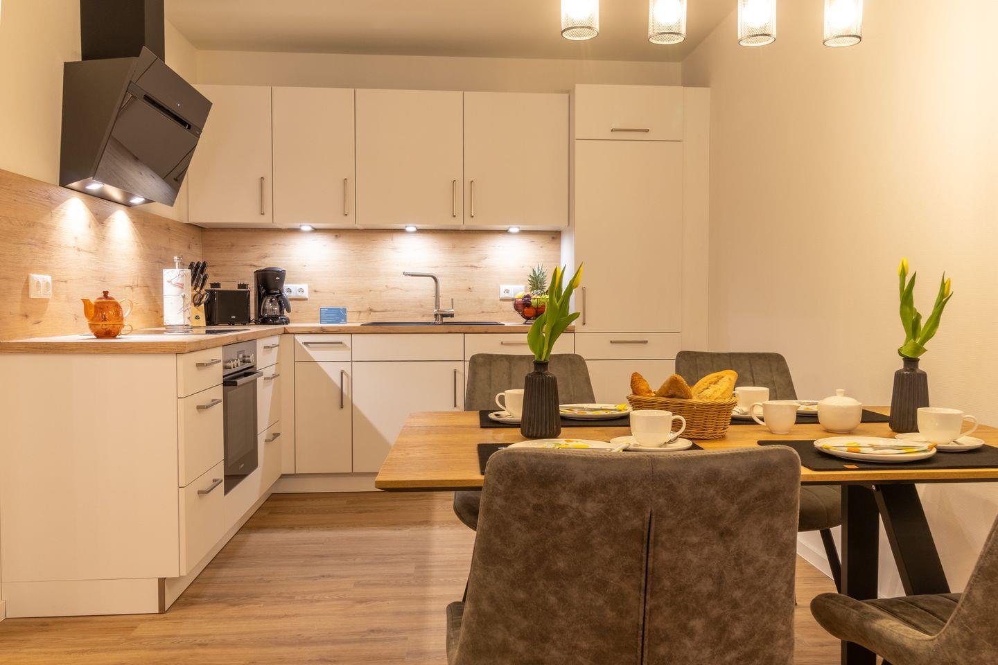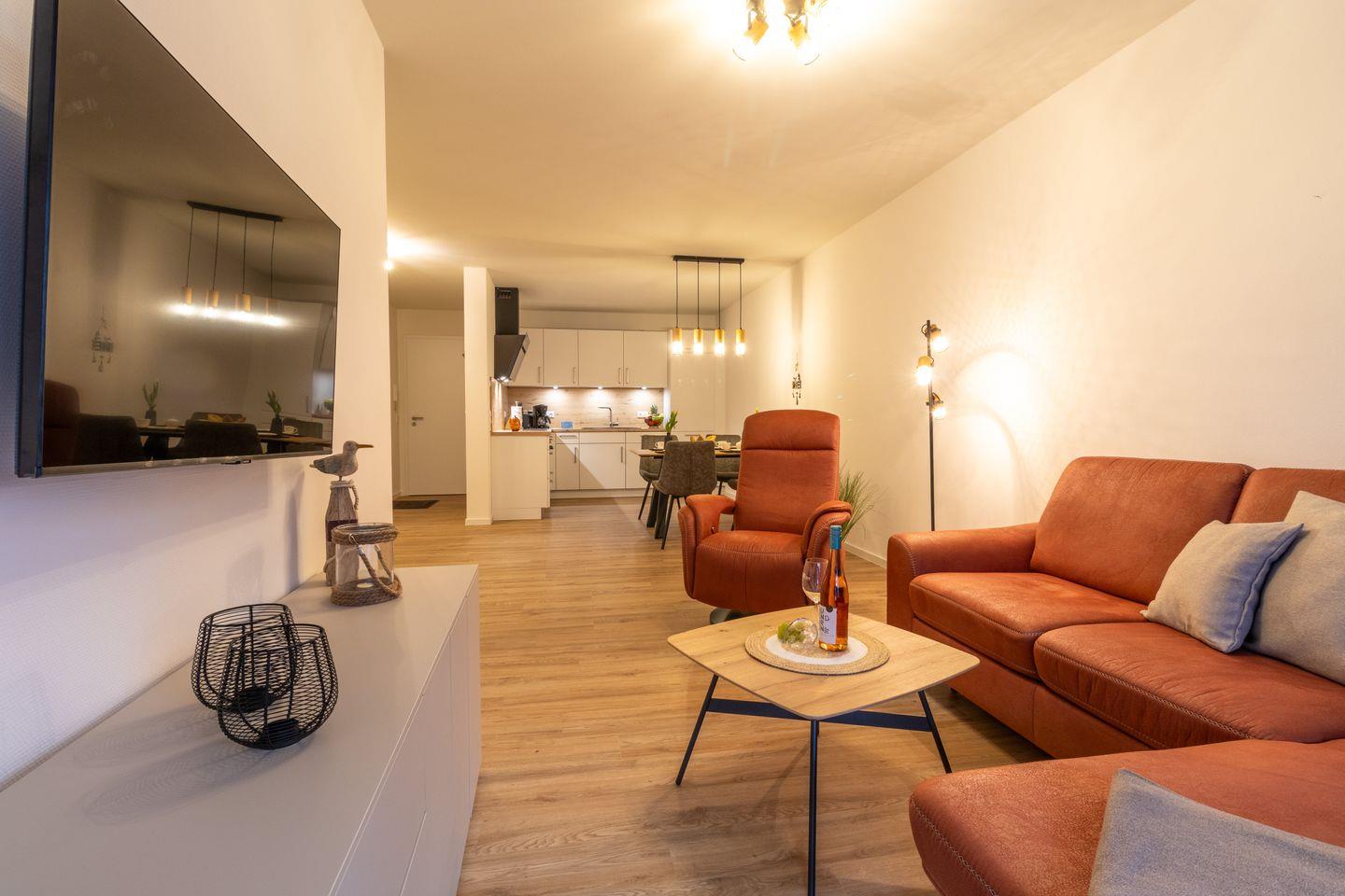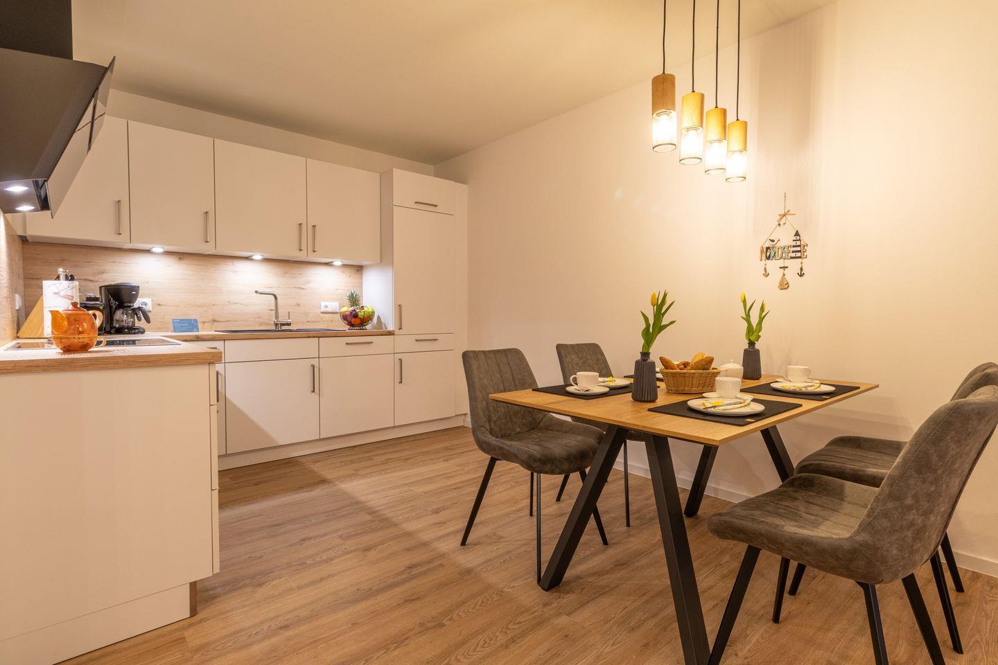 Der offen gestaltete Wohnbereich mit Couch, Essplatz und voll ausgestatteter Küche lädt zum Verweilen ein. Durch die bodentiefen Fenster gelangst du direkt auf die private Terrasse – ideal für ein Frühstück an der frischen Luft oder einen Sonnenuntergang bei Nordseewind.