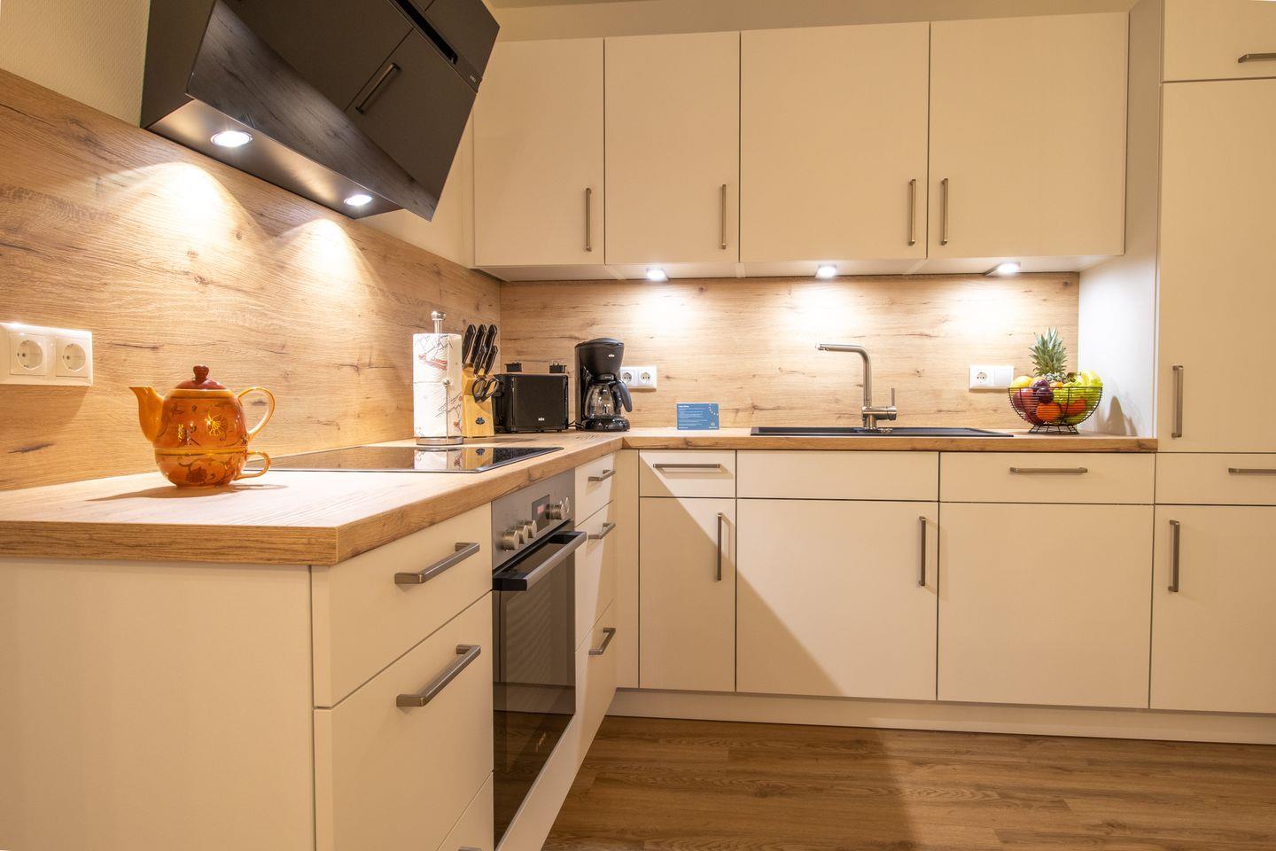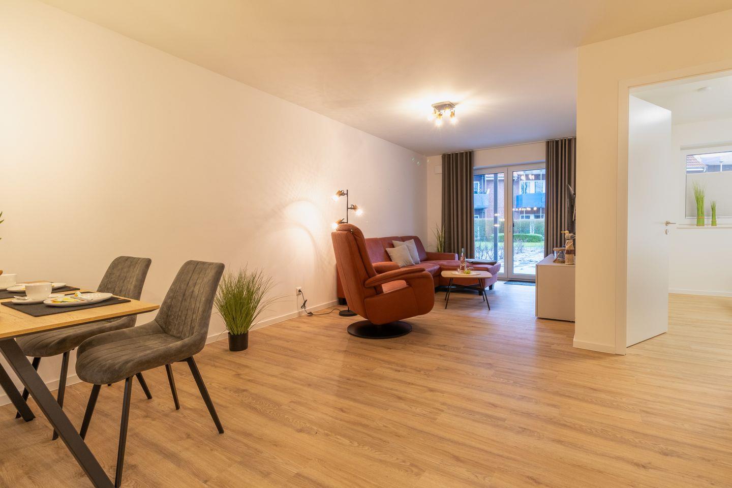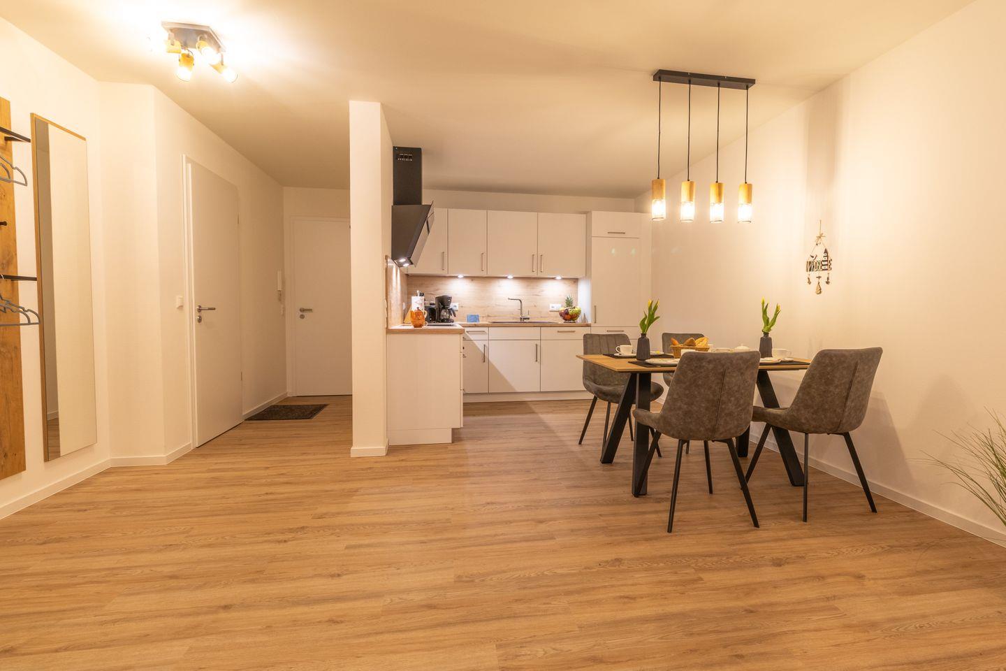 Der offen gestaltete Wohnbereich mit Couch, Essplatz und voll ausgestatteter Küche lädt zum Verweilen ein. Durch die bodentiefen Fenster gelangst du direkt auf die private Terrasse – ideal für ein Frühstück an der frischen Luft oder einen Sonnenuntergang bei Nordseewind.
