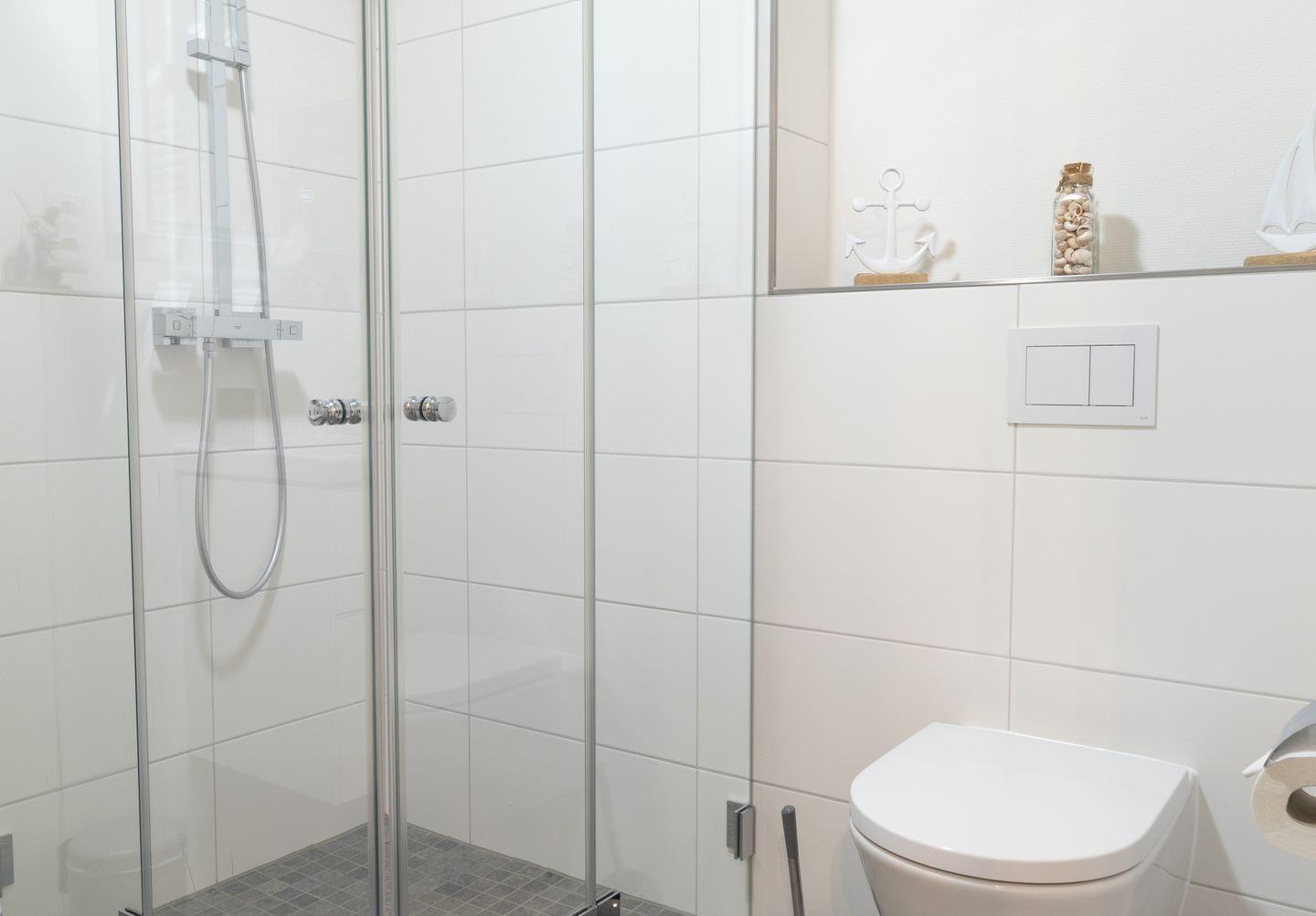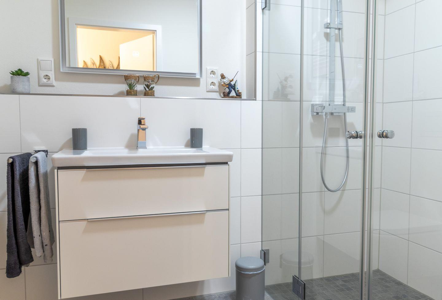 Das moderne Tageslichtbad ist mit einer bodengleichen Dusche, Sauna, Waschbecken, Spiegel und WC ausgestattet – hell, gepflegt und komfortabel.