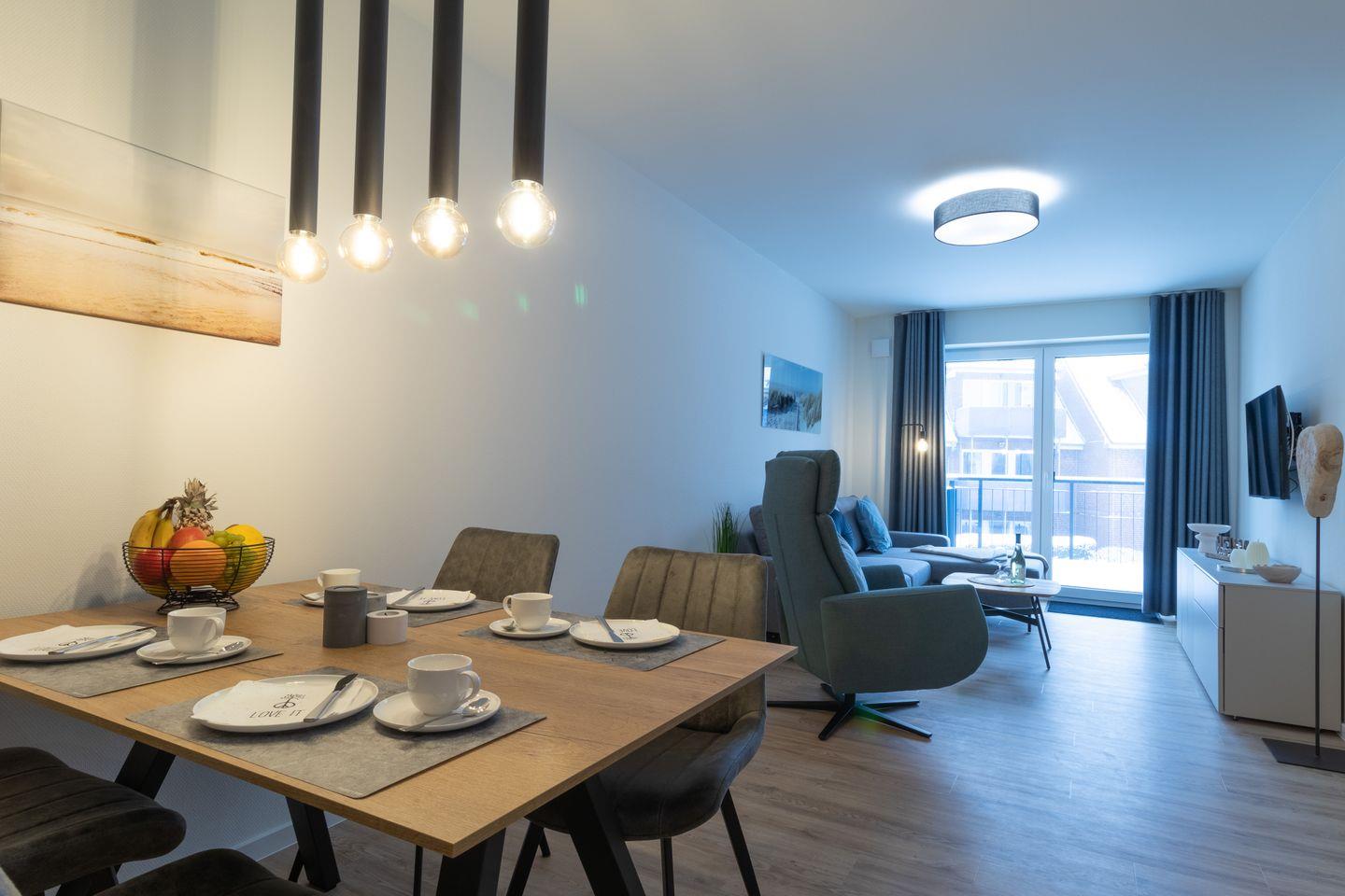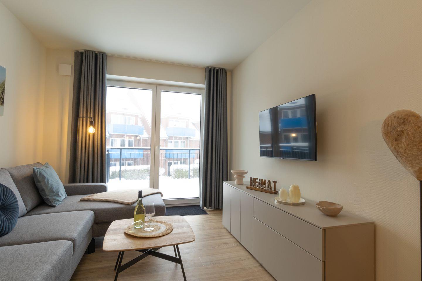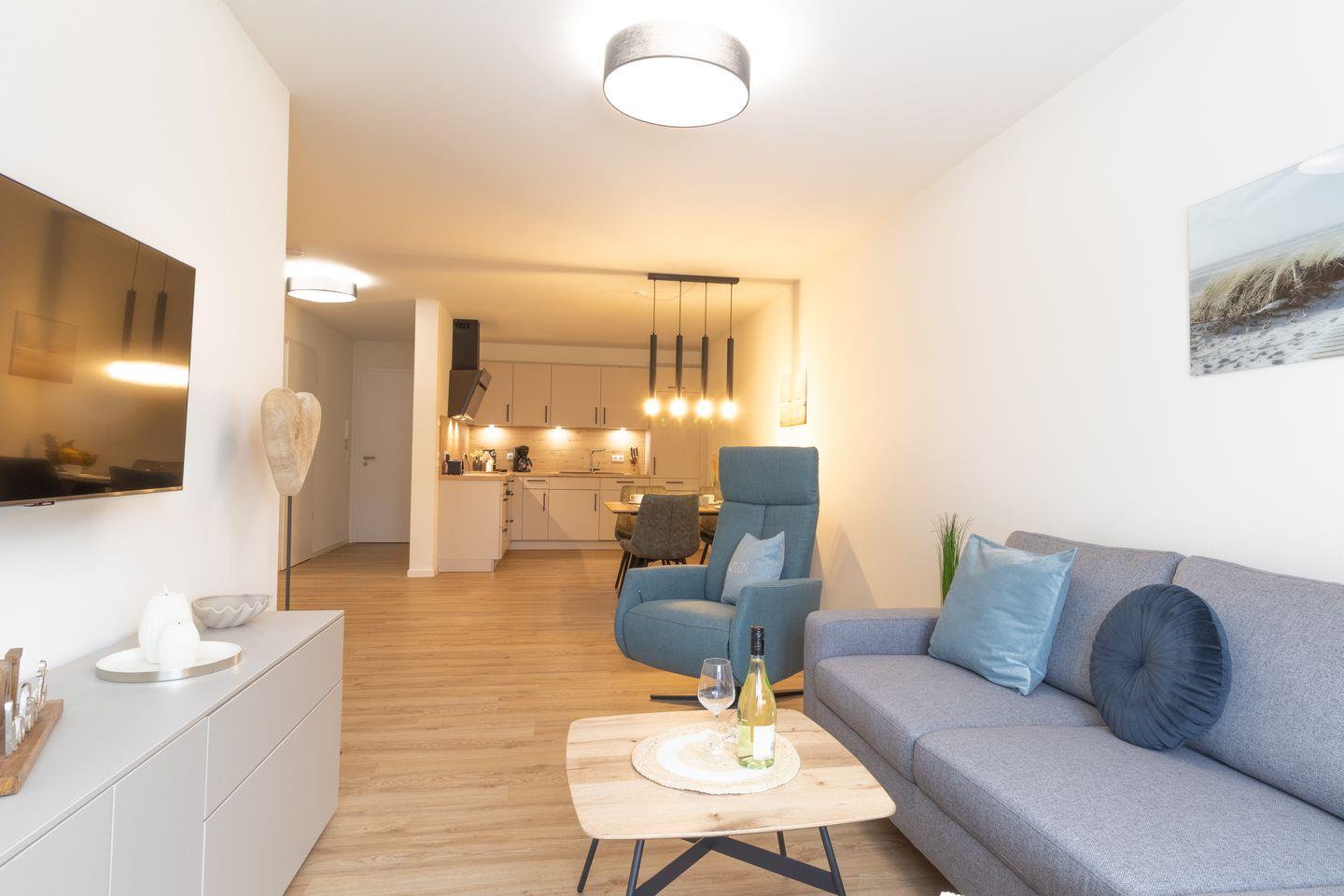 Im offenen Wohn- und Essbereich erwarten dich eine komfortable Couch, ein Flachbild-TV sowie ein heller Essplatz mit Blick in den Außenbereich. Durch die große Fensterfront gelangst du direkt auf die windgeschützte Terrasse – perfekt zum Entspannen bei Sonne und frischer Brise.