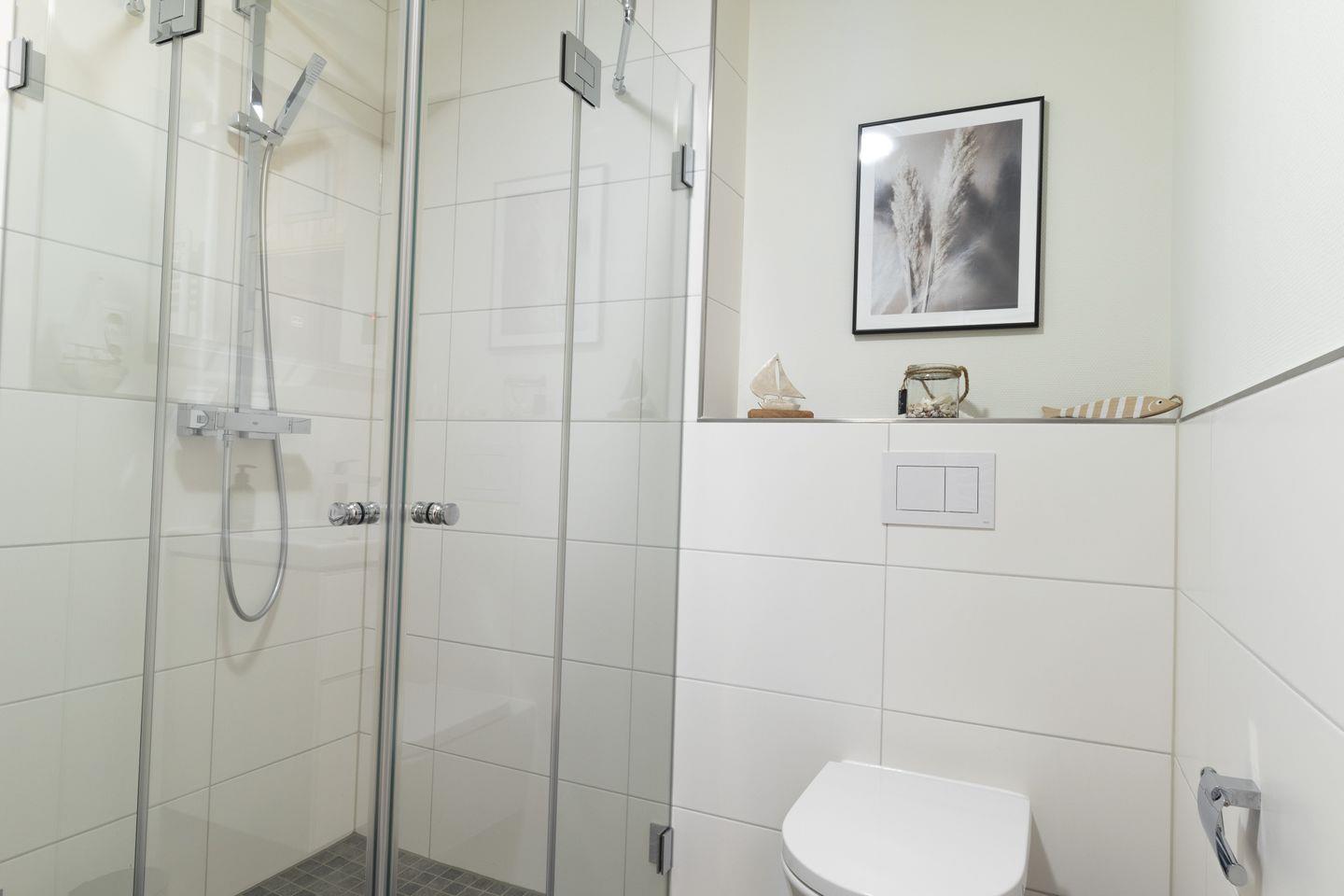Das Tageslichtbad punktet mit einer ebenerdigen Dusche, Sauna, modernem Waschtisch, WC und Handtuchheizung – hier startet dein Urlaubstag frisch und angenehm.