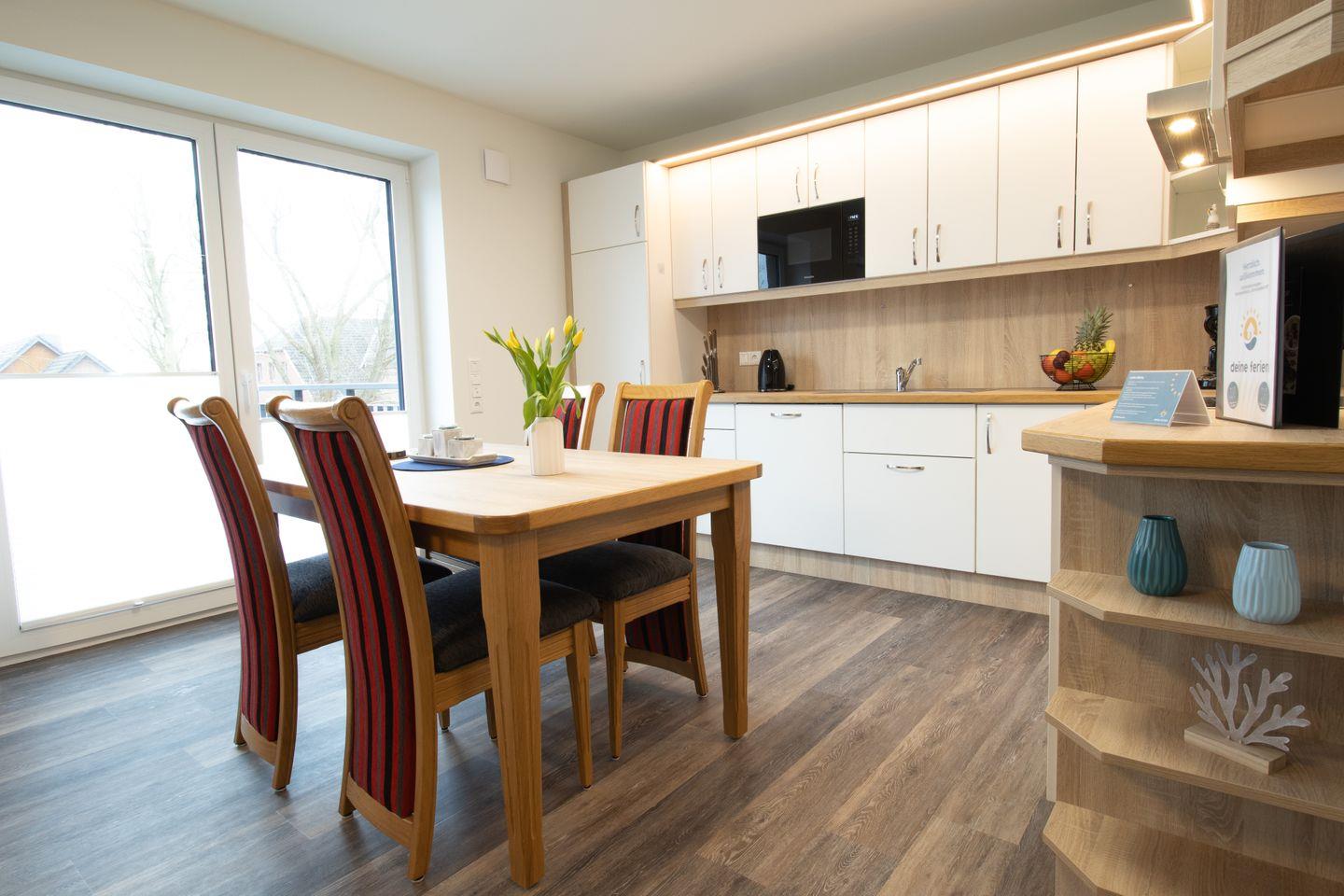 Der offene Wohnbereich ist lichtdurchflutet und stilvoll eingerichtet – mit gemütlicher Sofaecke, bodentiefen Fenstern und Zugang zum Balkon. In der voll ausgestatteten Küche mit großem Esstisch kannst du gemeinsam kochen, essen oder Spieleabende genießen. Eine Waschmaschine sowie ein separater Abstellraum sorgen für zusätzlichen Komfort.