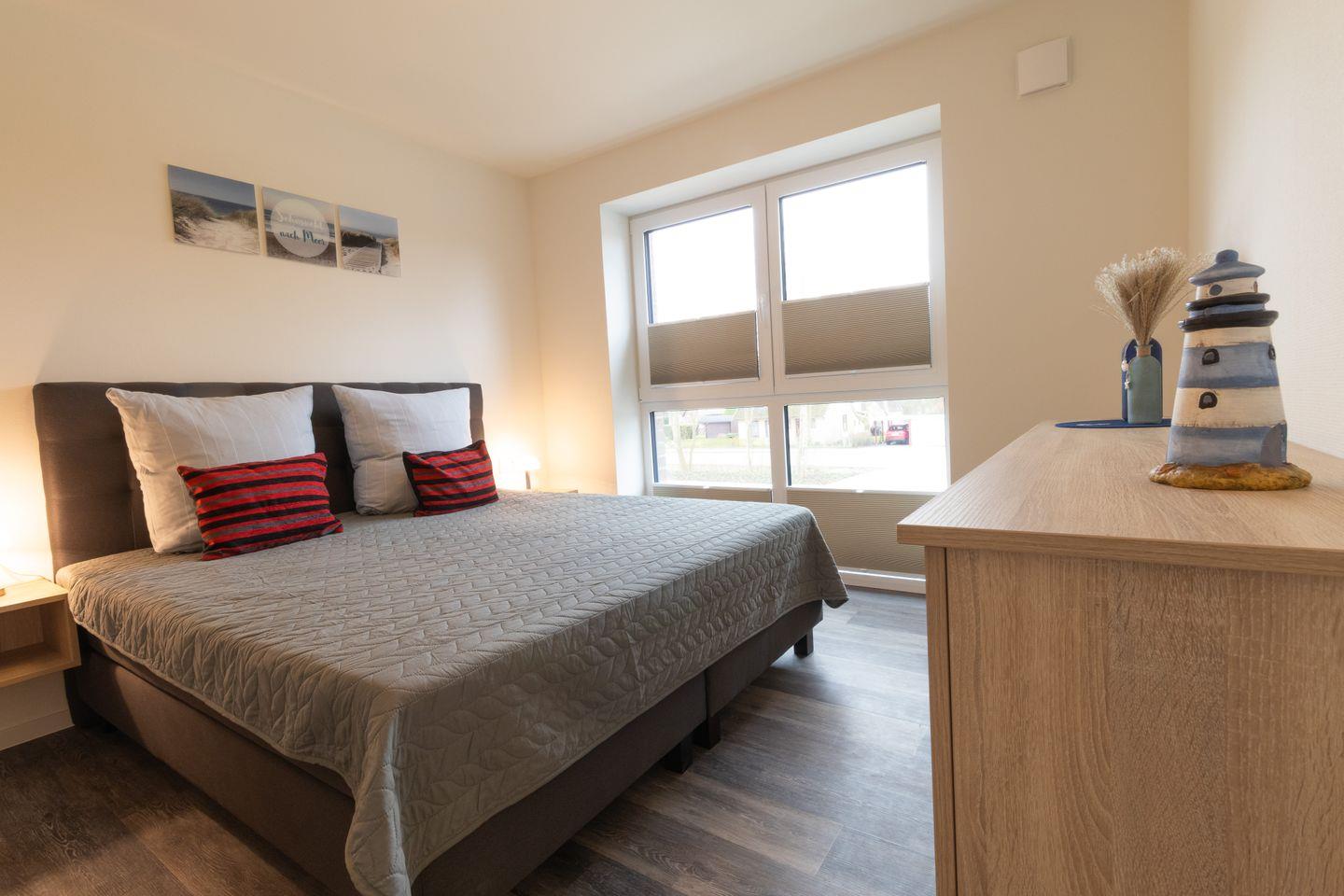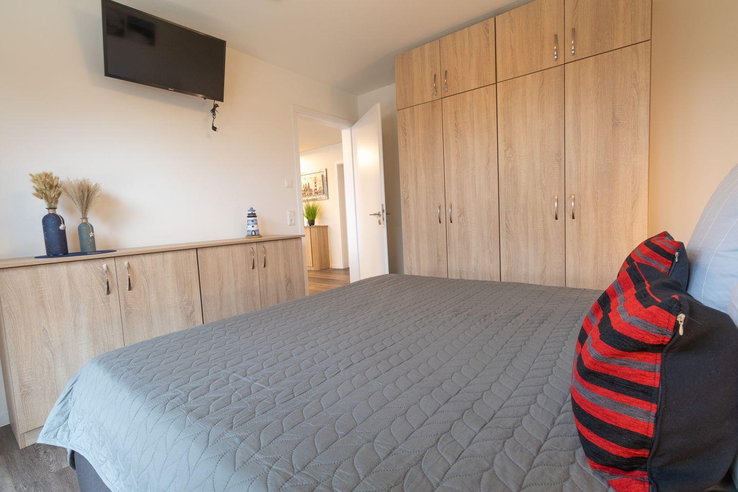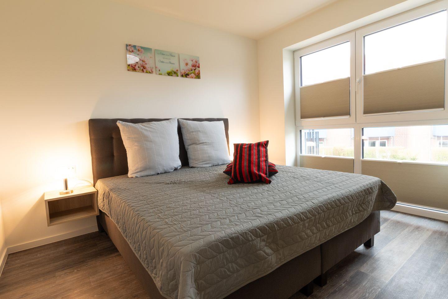 Zwei Schlafzimmer mit hochwertigen Boxspringbetten und Fernsehern bieten dir Ruhe und Erholung. Verdunkelungsplissees sorgen für angenehme Nächte. Ideal für vier Gäste – jedes Zimmer ist ein Ort zum Wohlfühlen und Rückziehen.