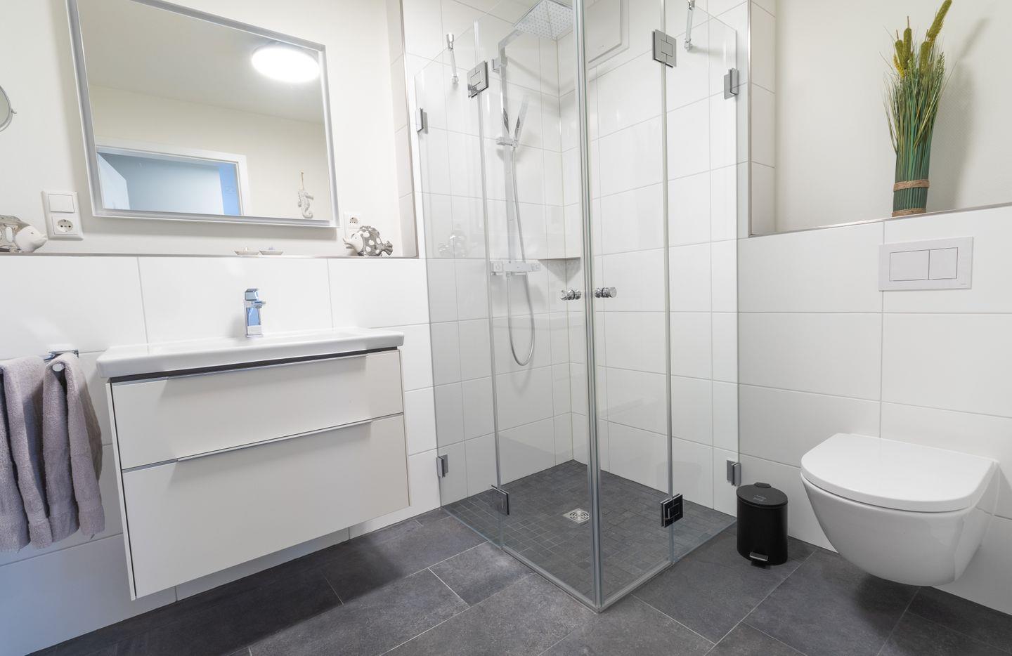 Deine persönliche Auszeit beginnt im modernen Badezimmer mit bodentiefer Dusche und eigener Sauna. Perfekt für gemütliche Winterabende oder nach einem aktiven Tag am Strand – hier findest du Entspannung pur.