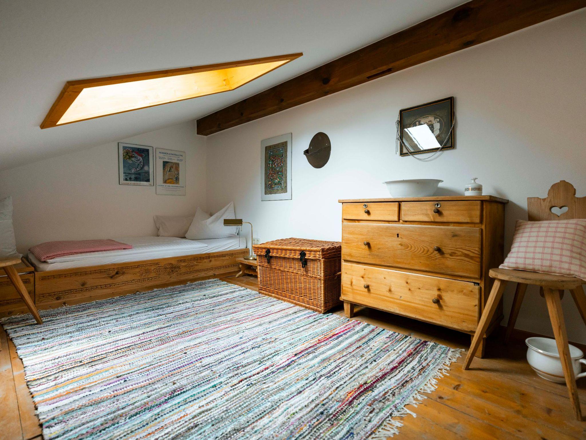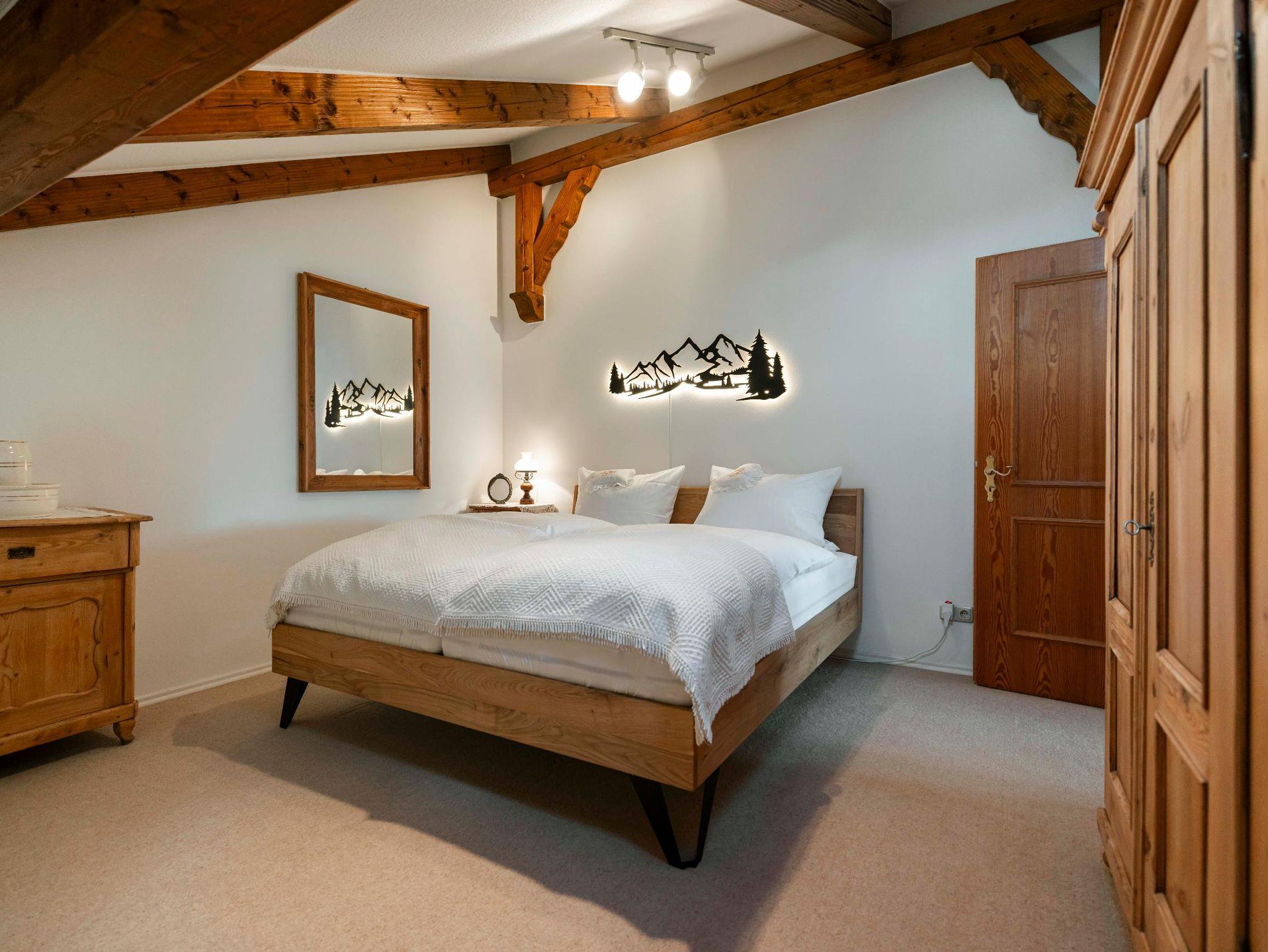 Ein separates Schlafzimmer mit Doppelbett, sowie zusätzliche Schlafmöglichkeiten (1 Einzelbett und 1 Zustellbett) für weitere Personen im Galeriebereich.