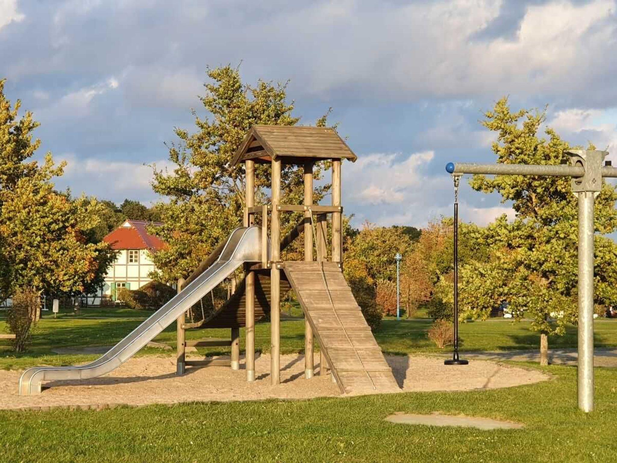 Die weitläufig angelegten Außenanlagen können mit genutzt werden. Spielplätze, Bolzplatz, Volleyballfeld, Tischtennisplatten, Minigolf, Fahrradverleih und Restaurant sind in der Ferienanlage vorhanden, ein Dorfladen mit Brötchenverkauf ist in wenigen Gehminuten erreichbar.