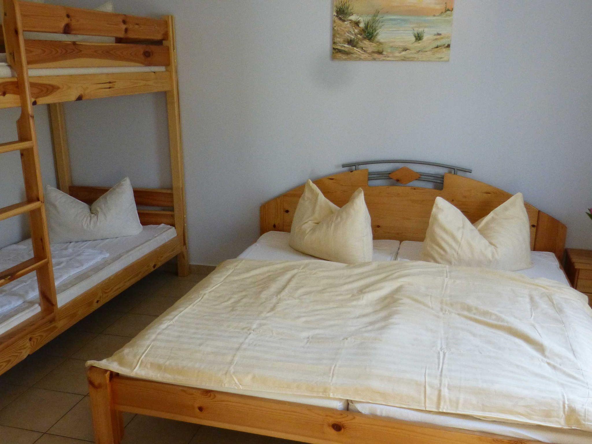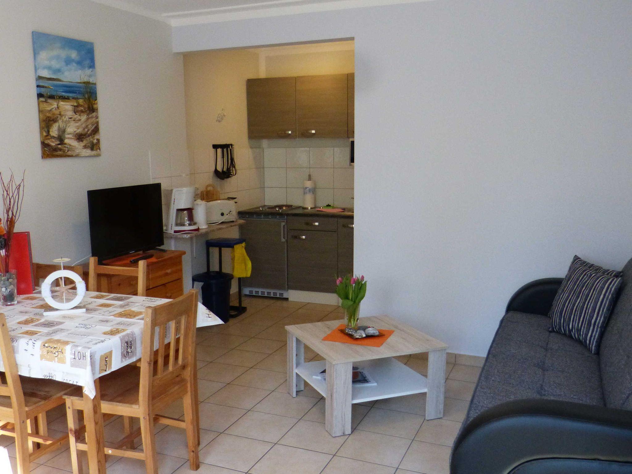 Die Ferienwohnung liegt im Erdgeschoß, hat eine Größe von 38 m² und verfügt über einen Wohnraum mit Pantry, ein Schlafzimmer mit einem Doppel- und einem Etagenbett, ein Badezimmer und eine Terrasse. Im Wohnzimmer befindet sich ein weiteres Einzelbett, zudem ist eine Aufbettung möglich (Schlafsofa). In der Miniküche befinden sich zwei Kochplatten, eine Kaffemaschine, ein Wasserkocher, ein Toaster, ein Kühlschrank mit Gefrierfach sowie eine Mikrowelle. Wäsche kann zugebucht werden (Handtuch- Bettwäschepaket 25,00 pro Person). Im Ferienpark kann ein Grill gemietet werden, ebenso ist die Nutzung einer gemeinschaftlichen Waschmaschine möglich (gegen Gebühr).