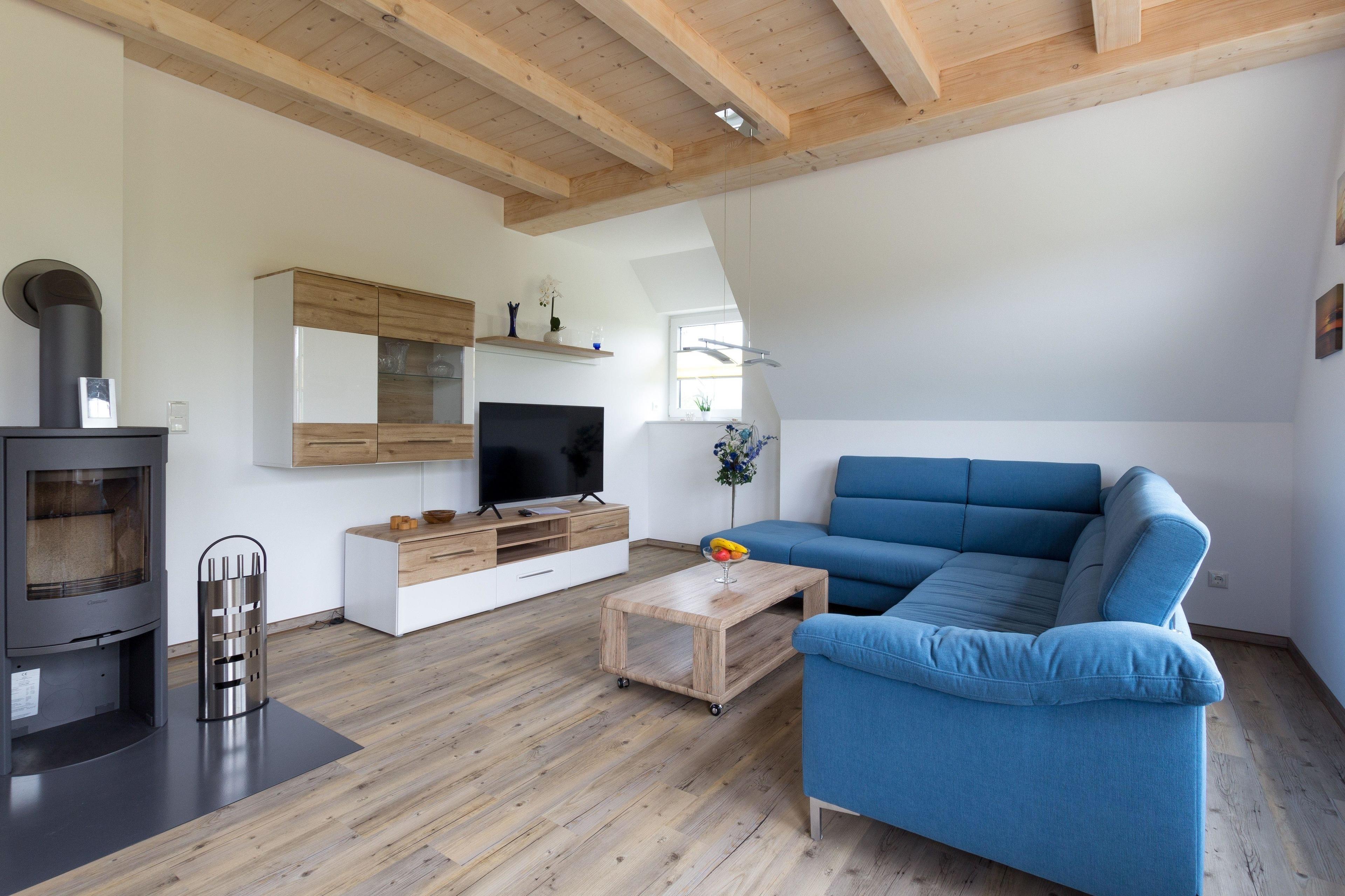 Die Wohnbereiche sind modern und freundlich eingerichtet. Hier befinden sich je eine großzügige Couch, welche als Aufbettung genutzt werden kann. Zur Ausstattung gehört je ein Smart-TV mit Internetverbindung. Um den Abend so richtig gemütlich zu gestalten, kann ein Feuer in den Kaminöfen angezündet werden.