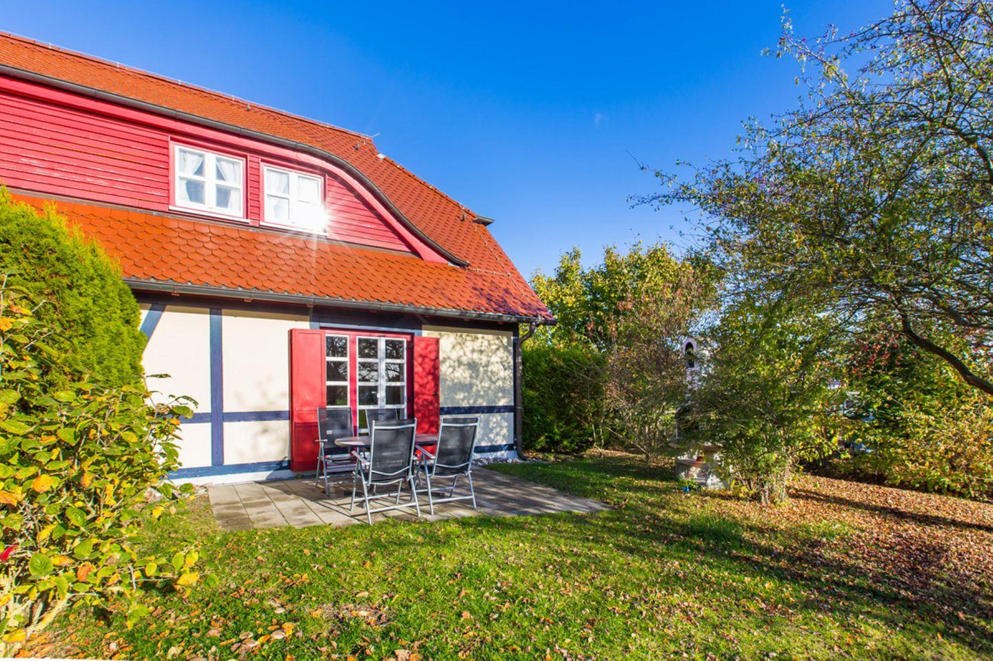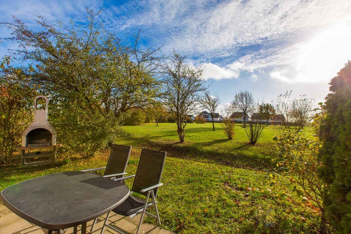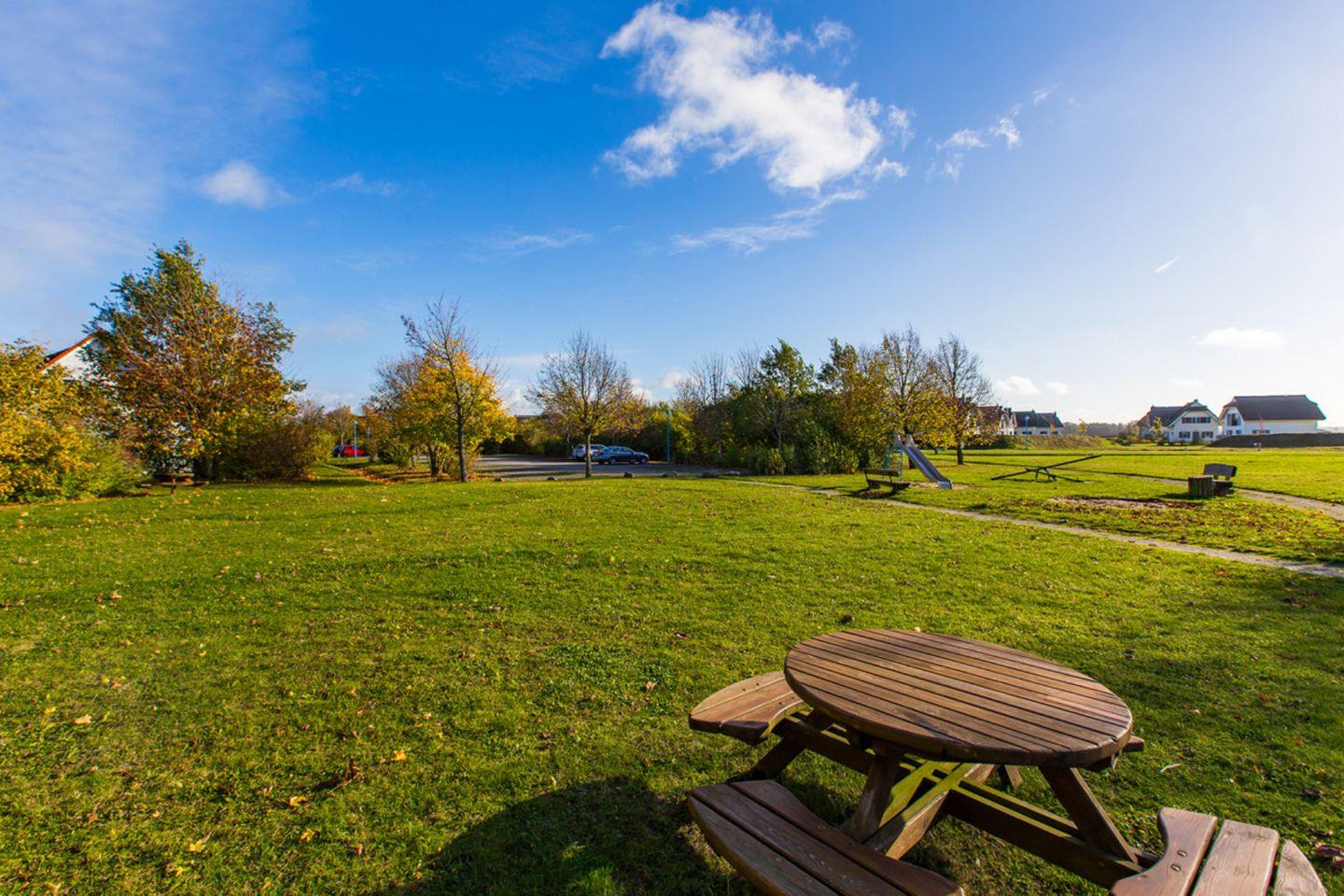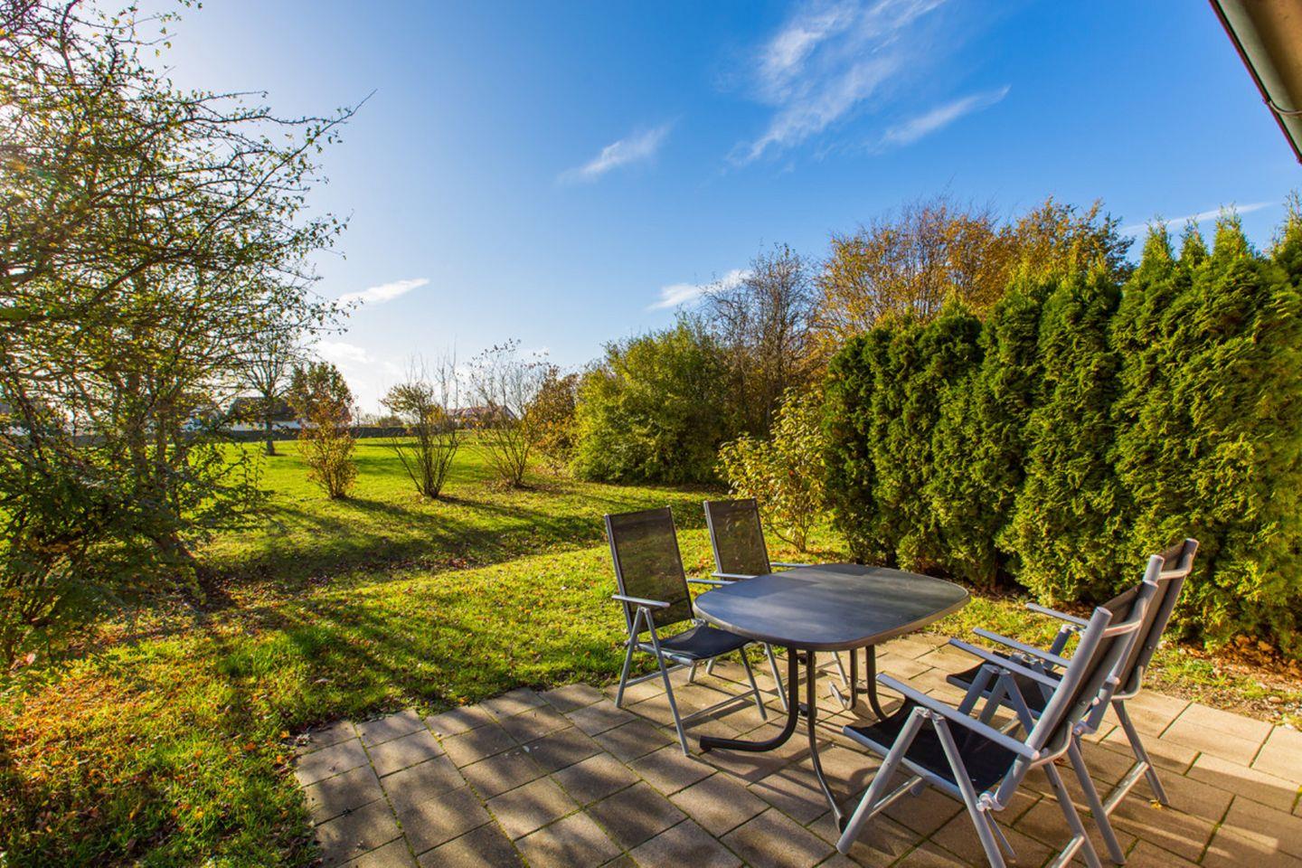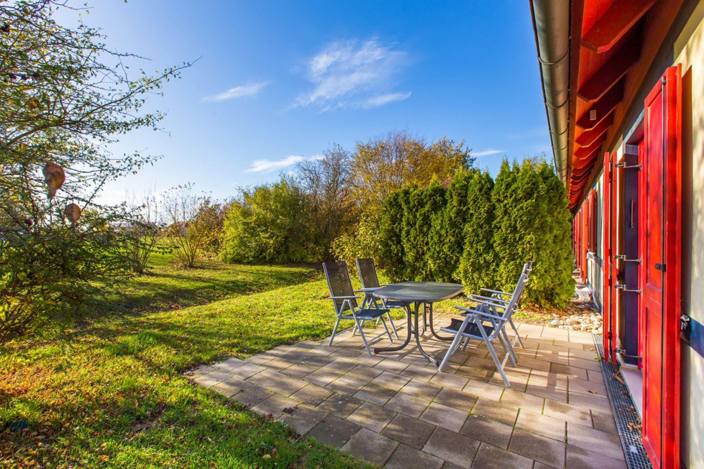 Strandnahe Ferienwohnung mit Terrasse im Feriendorf Bakenberg, ideal für Familien und Hundebesitzer.