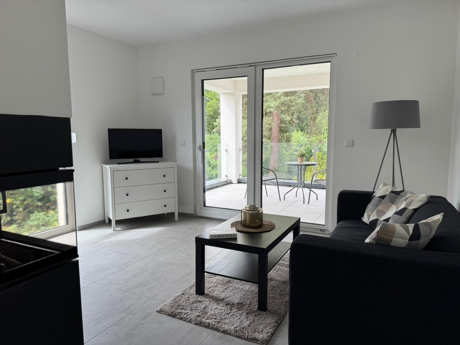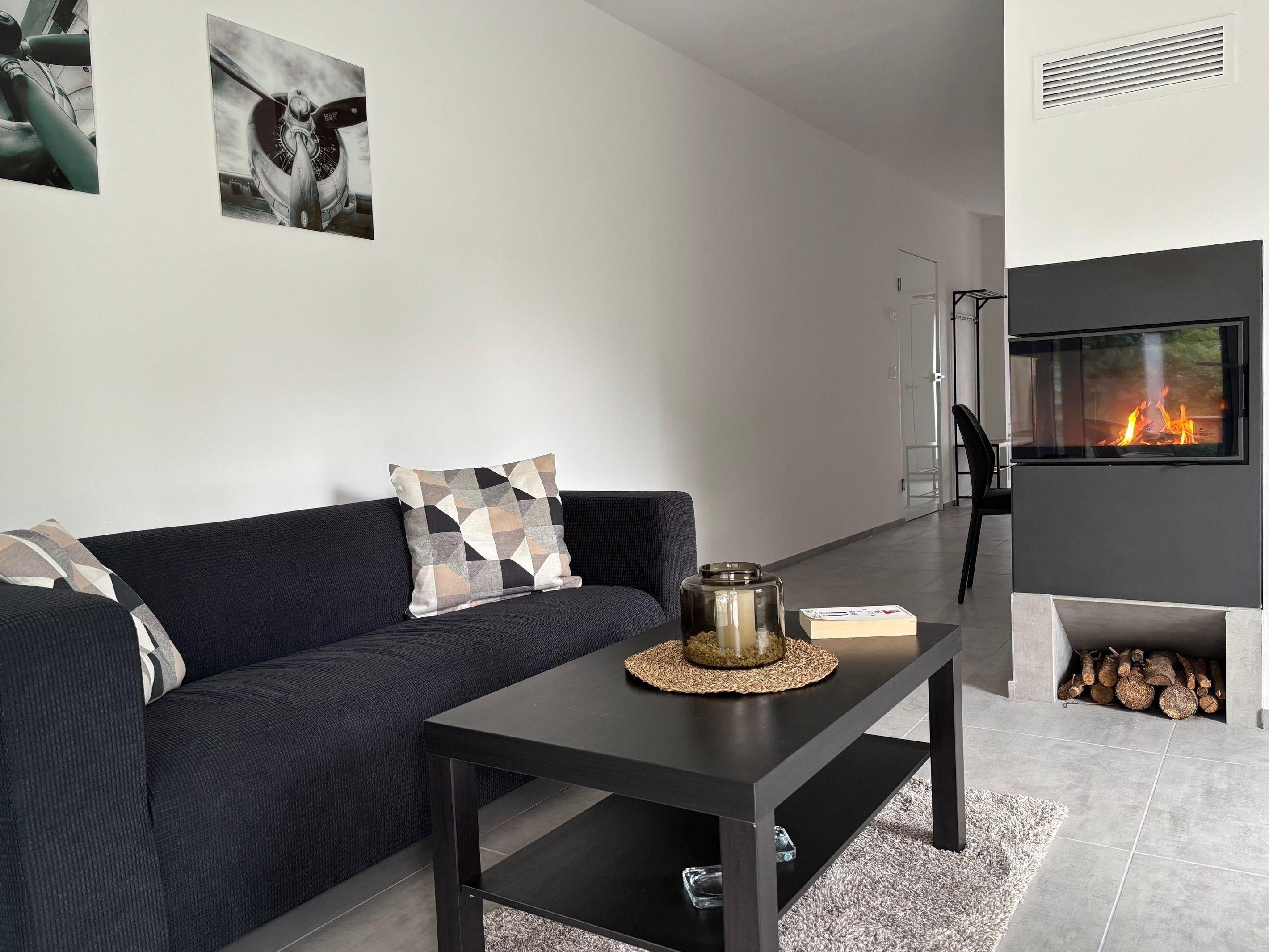 Ein stilvoller Essbereich, eine komfortable Schlafcouch mit TV sowie ein Echtholzkamin schaffen eine behagliche Atmosphäre und machen die Wohnung zum perfekten Rückzugsort – auch in den kühleren Monaten.