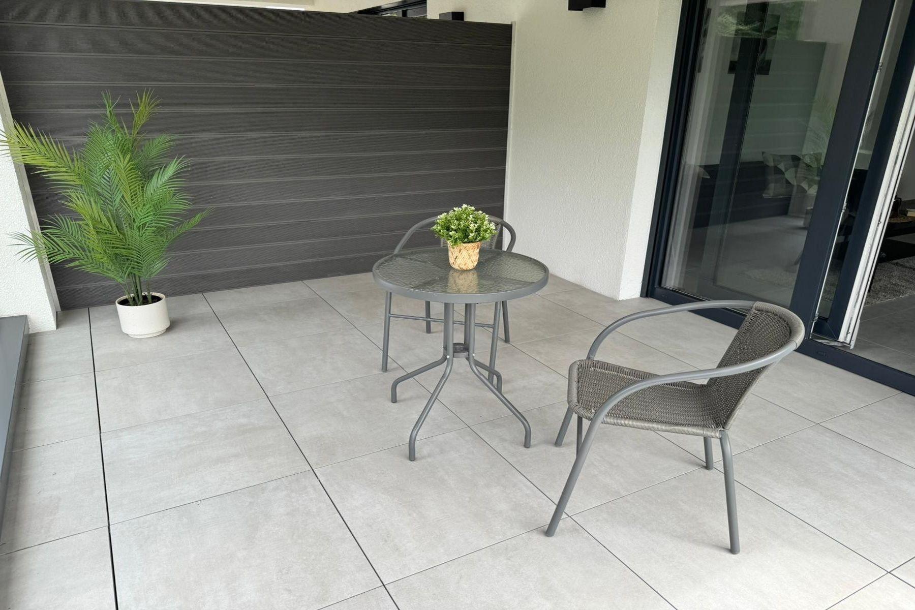 Die große, private Terrasse lädt zum Verweilen ein – ob bei einem Frühstück an der frischen Luft oder einem Glas Wein am Abend.