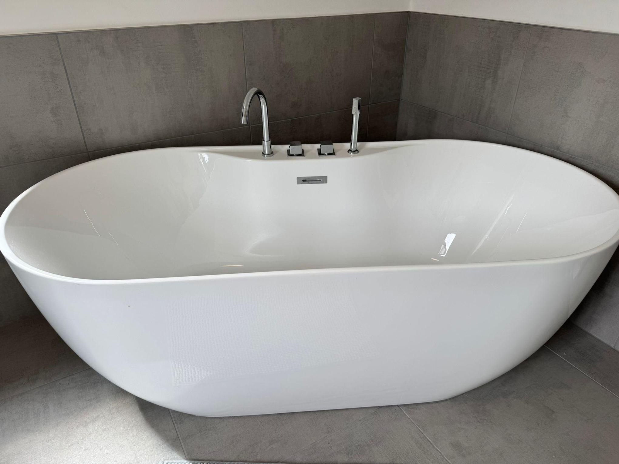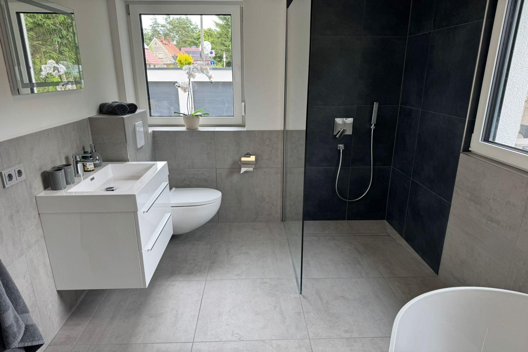 Im modernen Badezimmer erwarten Sie eine bodengleiche Dusche sowie eine freistehende Badewanne – perfekt zum Entspannen nach einem erlebnisreichen Tag.