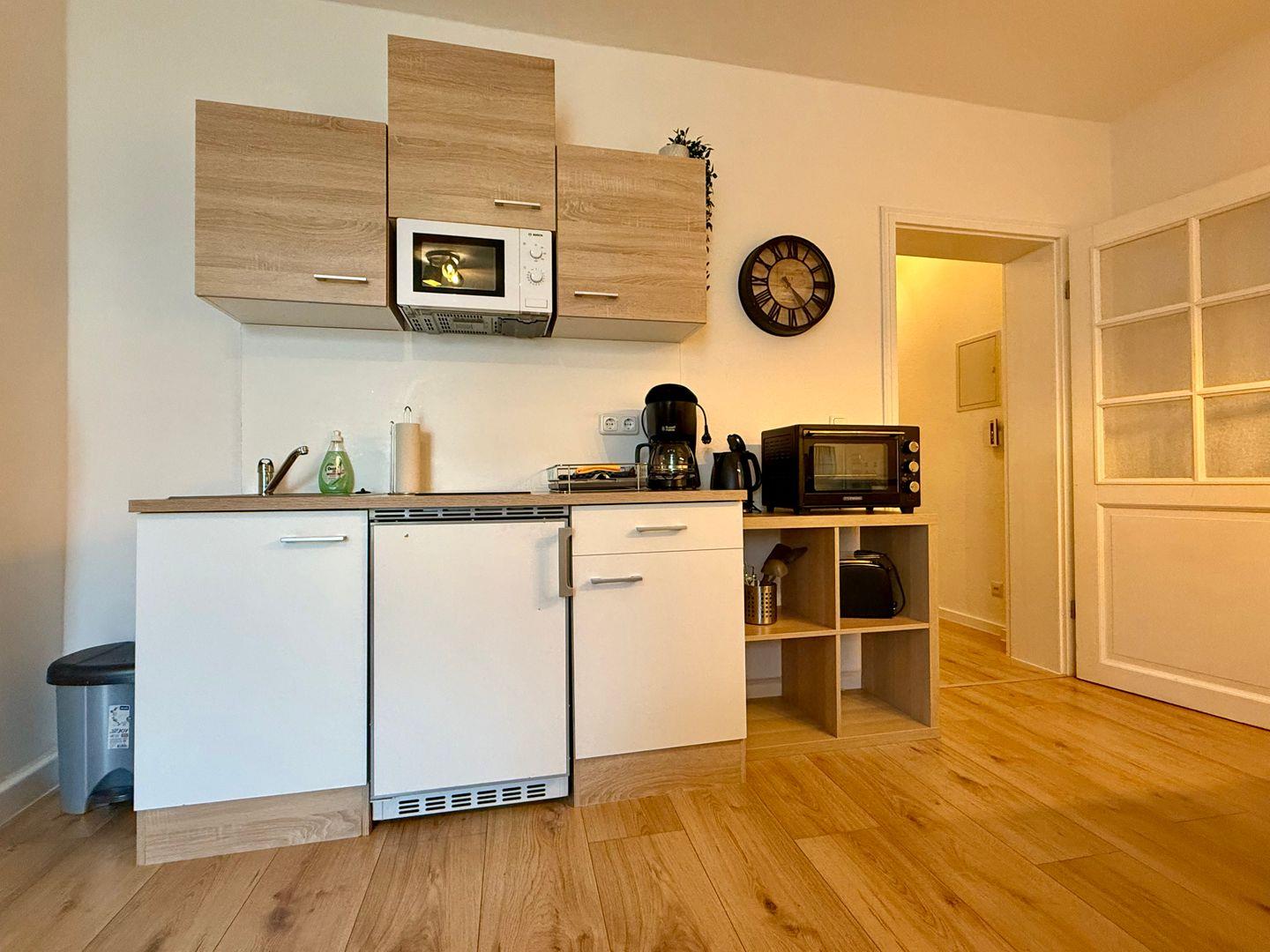 Upon entering, you'll find an open-plan kitchen that flows seamlessly into the living area, creating an inviting space for relaxation and socializing. The kitchen is fully equipped with essential utensils, a refrigerator with a freezer compartment, a two-plate cooktop, a microwave, a toaster, and a coffee machine, making it easy to prepare homemade meals. An adjacent dining area provides space for intimate meals together, ensuring you feel right at home during your stay.