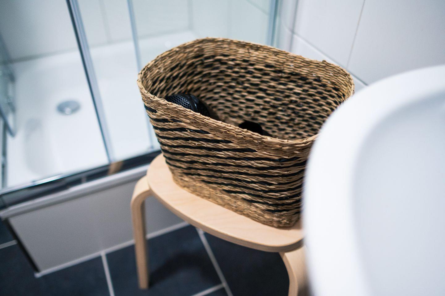 The bathroom is well-appointed, featuring a shower with a bathtub combination, a washbasin, and a toilet. Fresh towels and linens are included in your booking, along with a starter pack of toiletries and cleaning supplies, ensuring a hassle-free arrival.