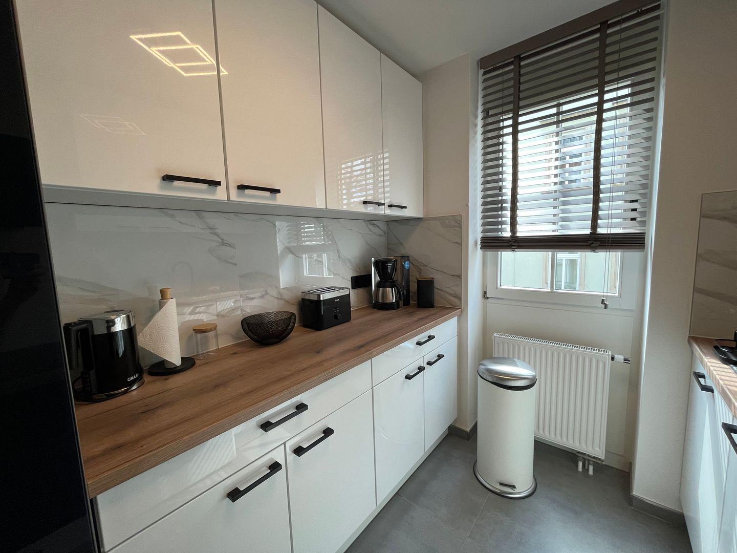 Die voll ausgestattete Küche lässt keine Wünsche offen. Hier finden Sie alle notwendigen Küchenutensilien, eine Spülmaschine, Kaffeemaschine, Wasserkocher und vieles mehr, um Ihre kulinarischen Ideen zum Leben zu erwecken. Genießen Sie Ihre selbst zubereiteten Mahlzeiten am Esstisch oder im Sommer auf dem überdachten Balkon, der zu entspannenden Stunden im Freien einlädt. Die Terrasse bietet zudem einen perfekten Ort, um den Tag bei einem Glas Wein oder einer Tasse Kaffee ausklingen zu lassen.
