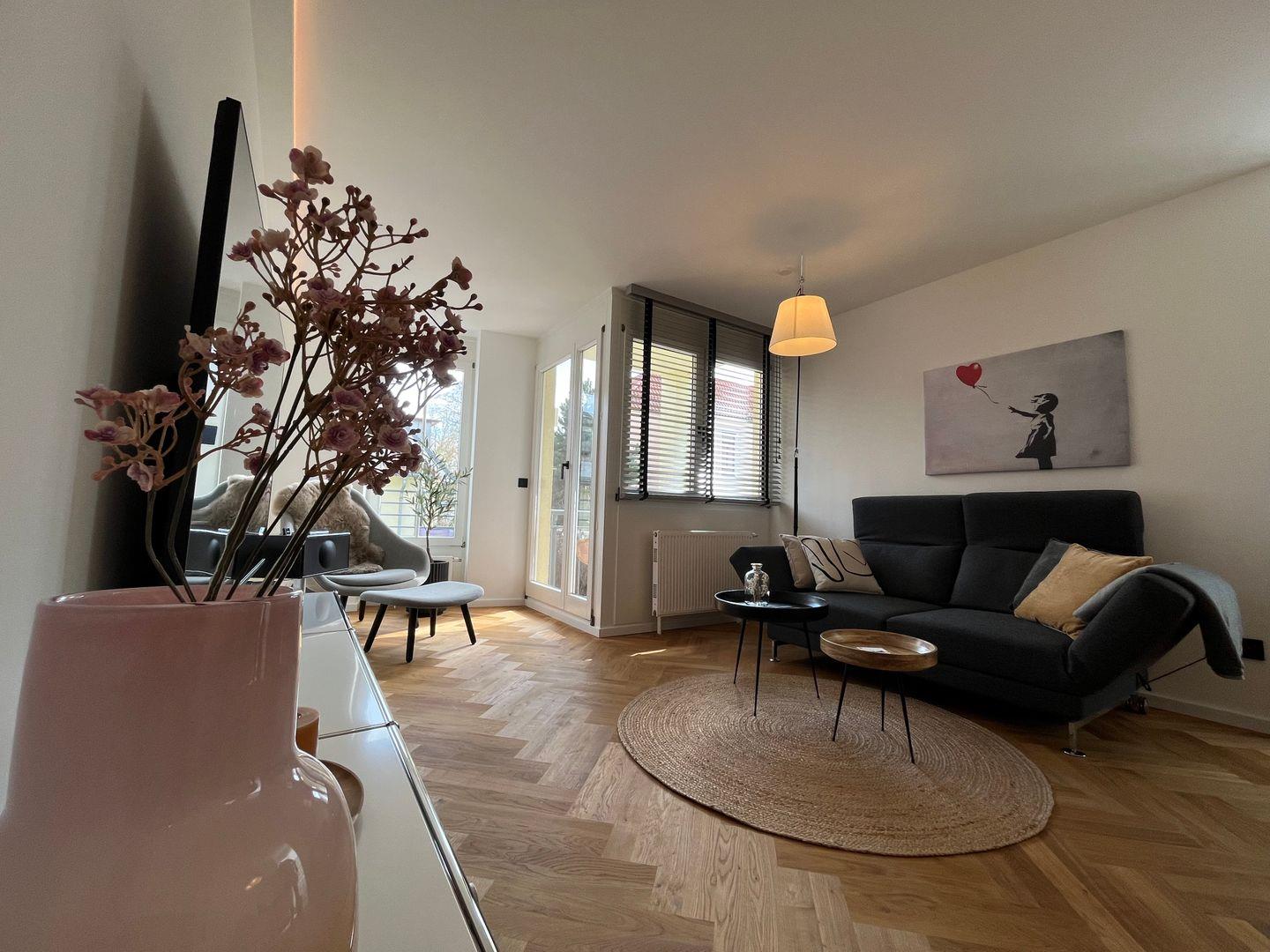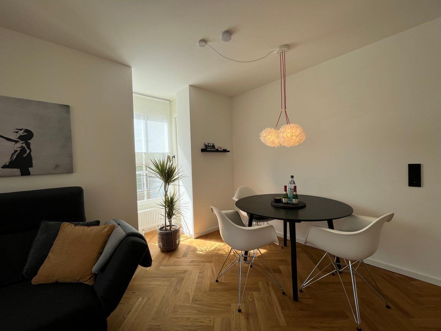Die hellen und freundlichen Räumlichkeiten sind geschmackvoll eingerichtet und strahlen eine gemütliche Atmosphäre aus. Die beiden geschmackvoll eingerichteten Schlafzimmer bieten Ihnen einen erholsamen Schlaf. Genießen Sie modernsten Komfort und entspannen Sie in der Sofaecke des lichtdurchfluteten Wohnzimmers, wo Sie mit einem guten Buch oder einem spannenden Film am digitalen TV entspannen können. Das Wohnzimmer ist mit Parkett ausgestattet und strahlt ein warmes, einladendes Ambiente aus.