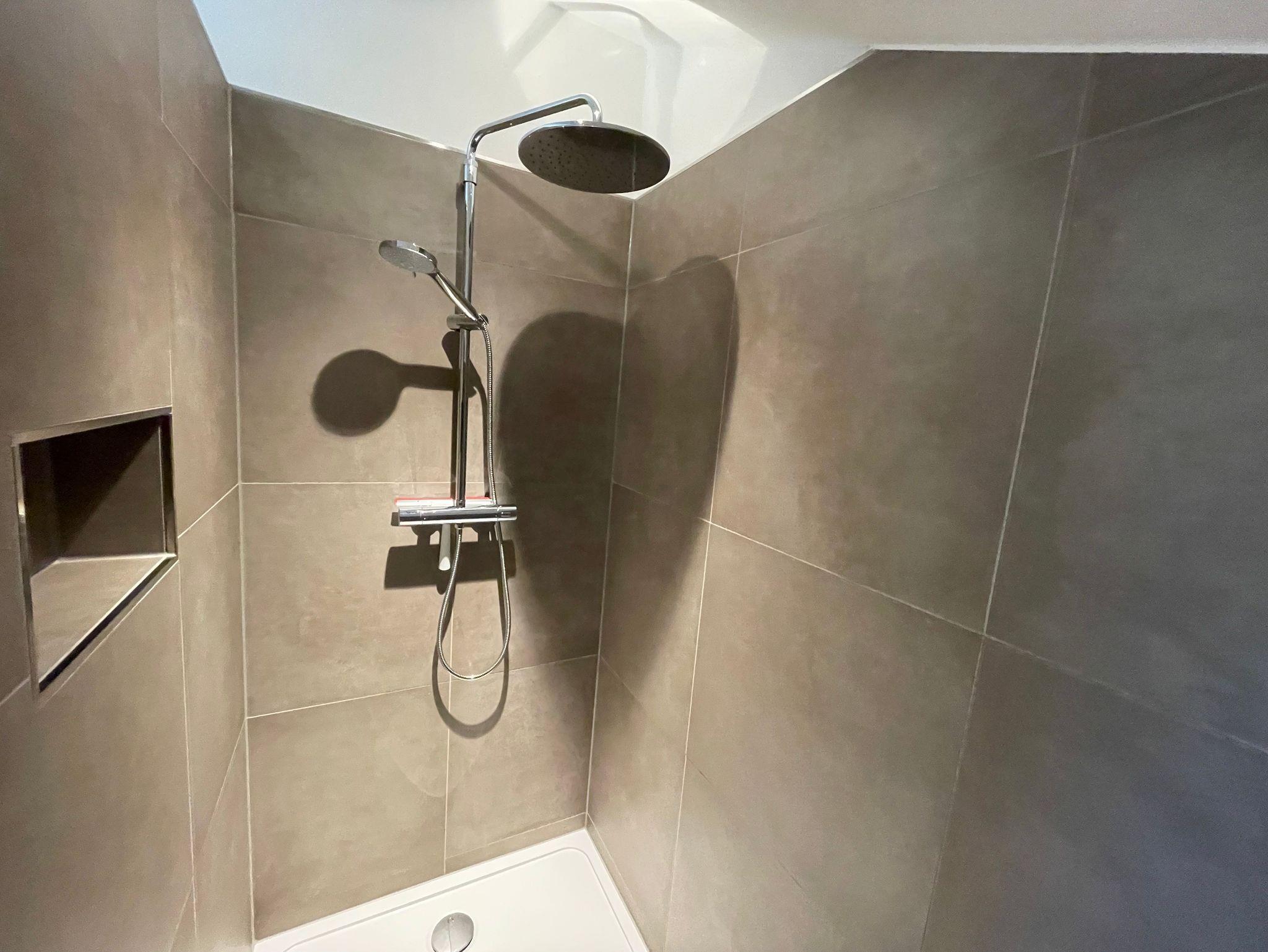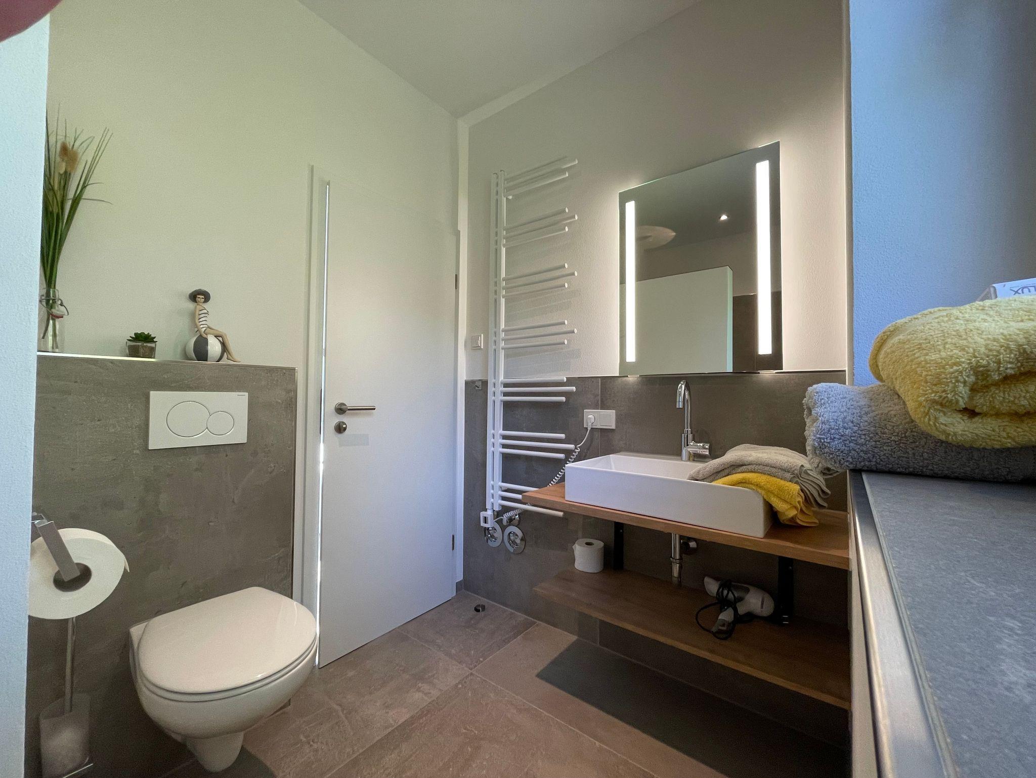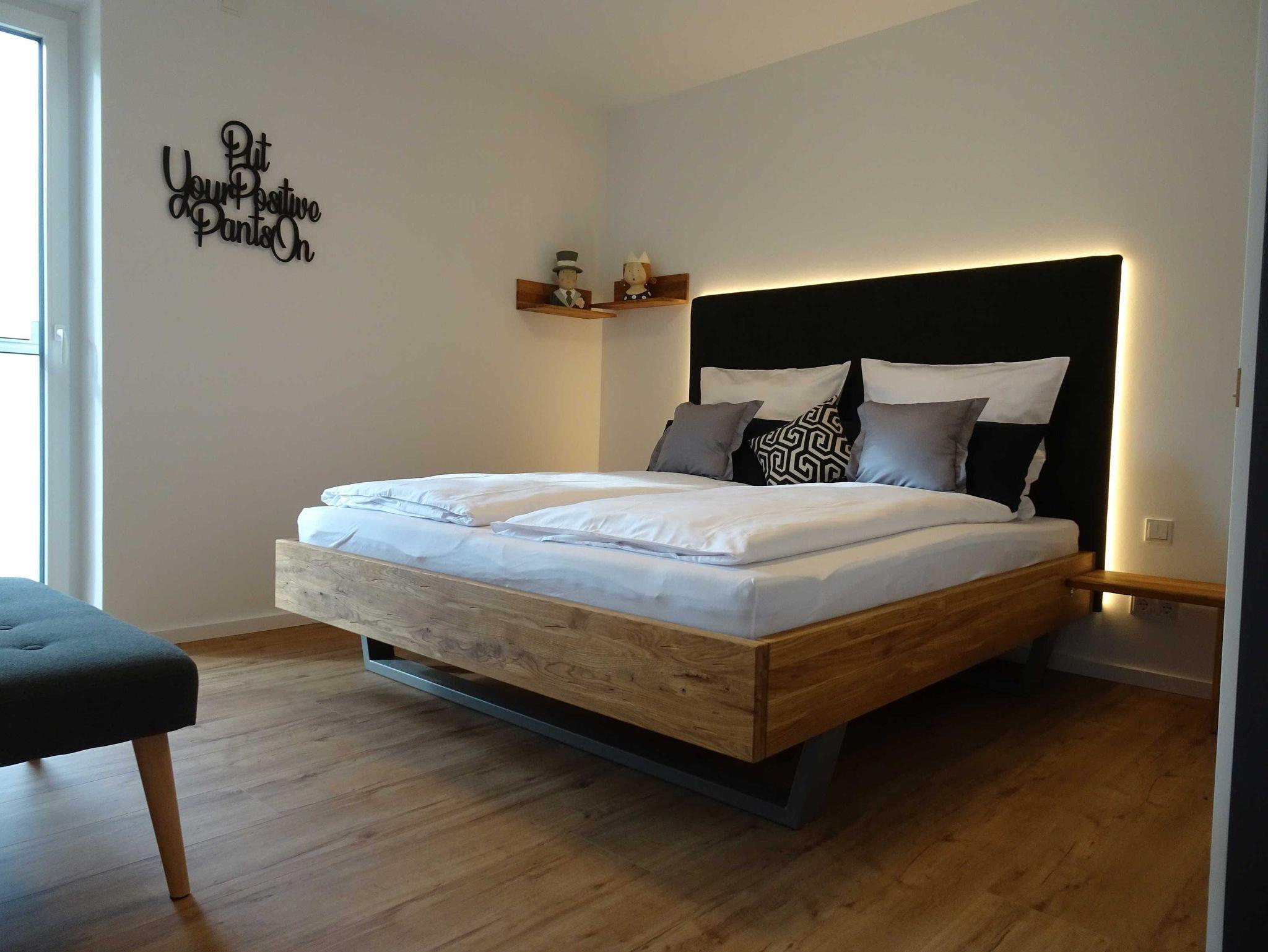 In dem hellen und ansprechend eingerichteten Bad findest du eine große Regenschauerdusche und einen Handtuchheizkörper. Im komfortabel eingerichteten Schlafzimmer mit Doppelbett kommen auch große Leute nicht zu kurz. Kuschel dich in dem 180x200cm breitem Bett unter die großen Bettdecken mit 155x220cm und genieße die Nachtruhe.
