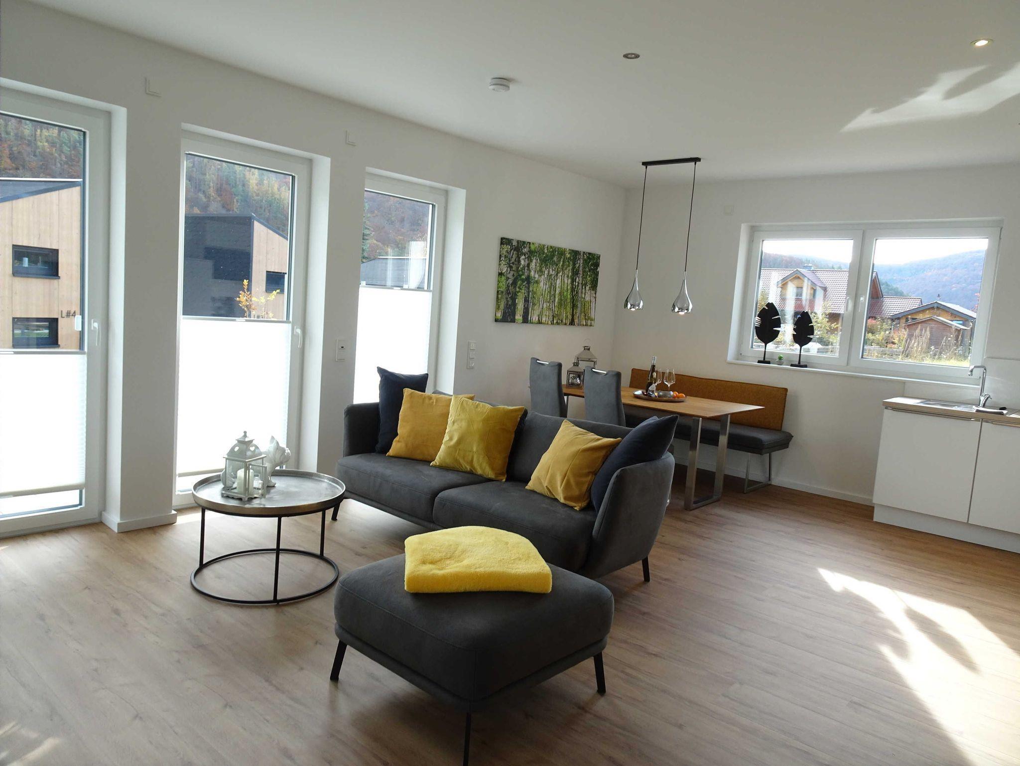 Die offene und liebevolle Gestaltung des Wohn - Essbereichs mit 55 Zoll Smart TV lädt nach einem ereignisreichen Tag zum Entspannen oder zu geselligen Abenden ein. Nur ein Schritt durch die Terrassentür und du bist auf der großen Terrasse mit Blick auf die umliegenden Wälder. Hier kannst du ungestört bei einem Gläschen Wein den Sternenhimmel beobachten und den Tag ausklingen lassen oder als erster in aller Ruhe den Morgenkaffee genießen.