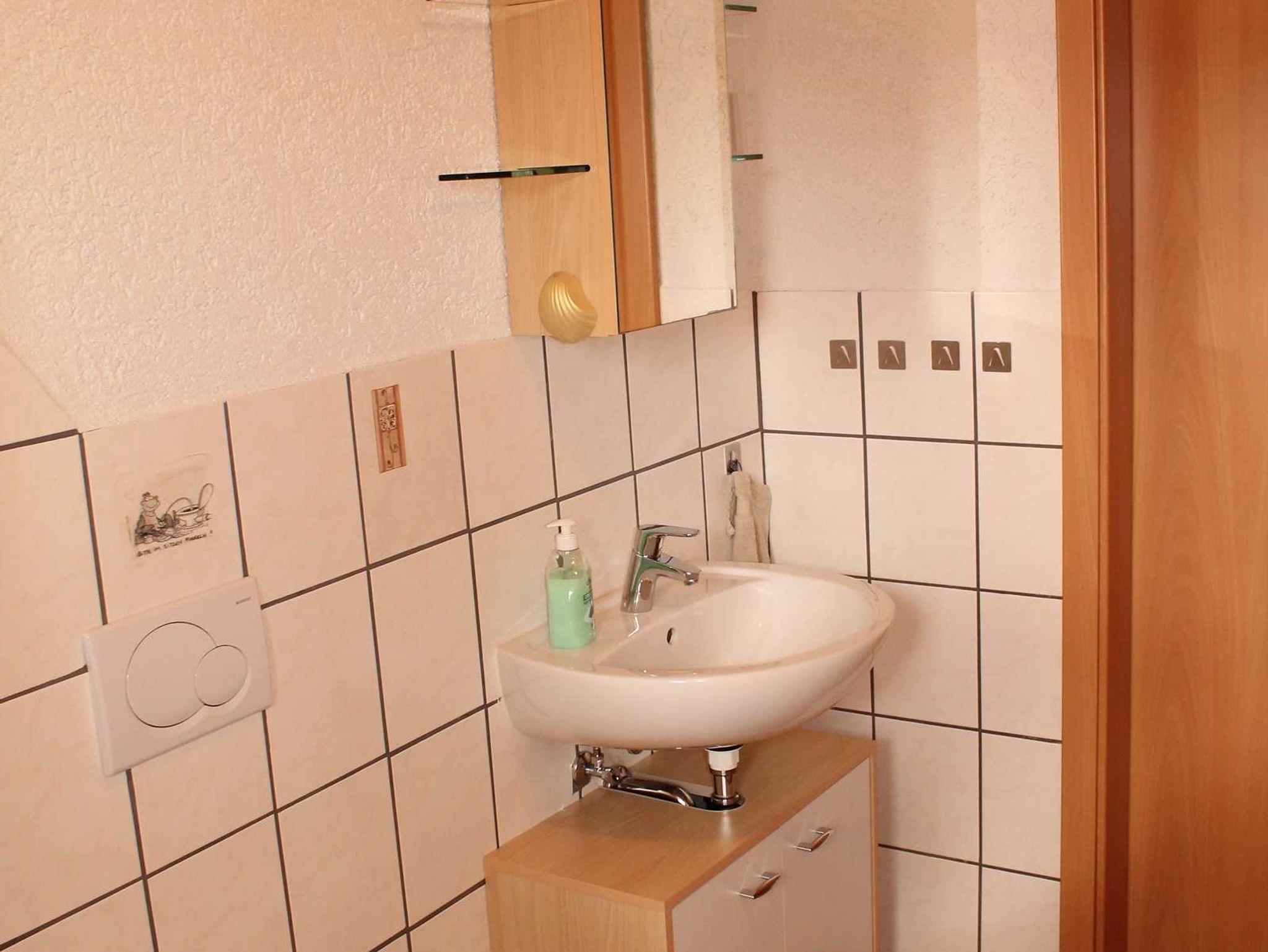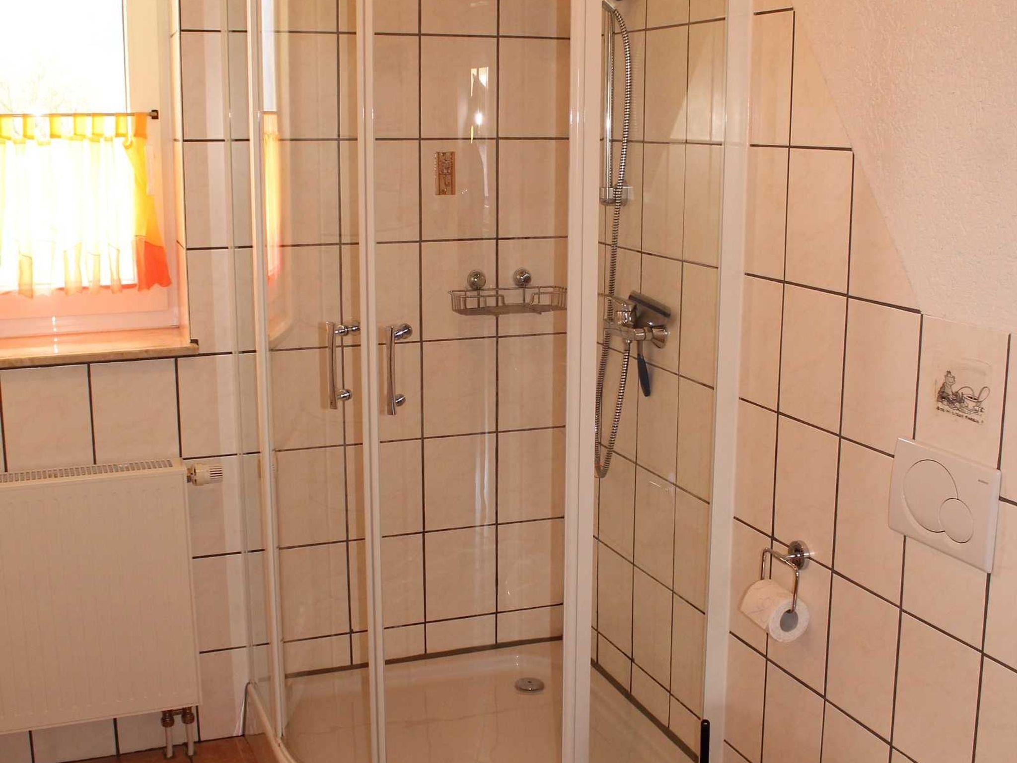 Das Bad mit Dusche, WC, Fön und Waschbecken.