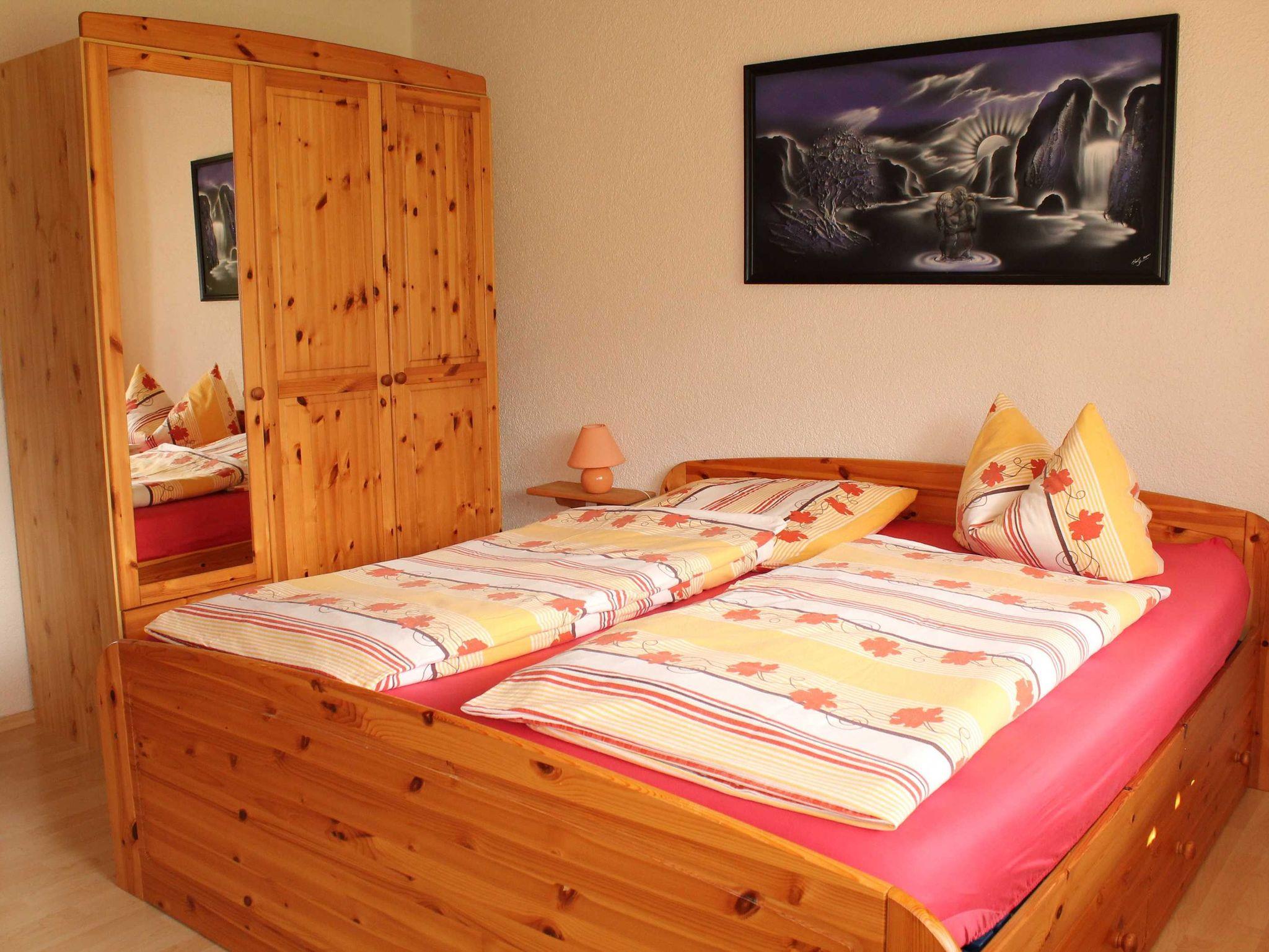 Schlafzimmer mit Doppelbett, Kleiderschrank, Radiowecker, auf Wunsch Gästebett oder Kinderbett.