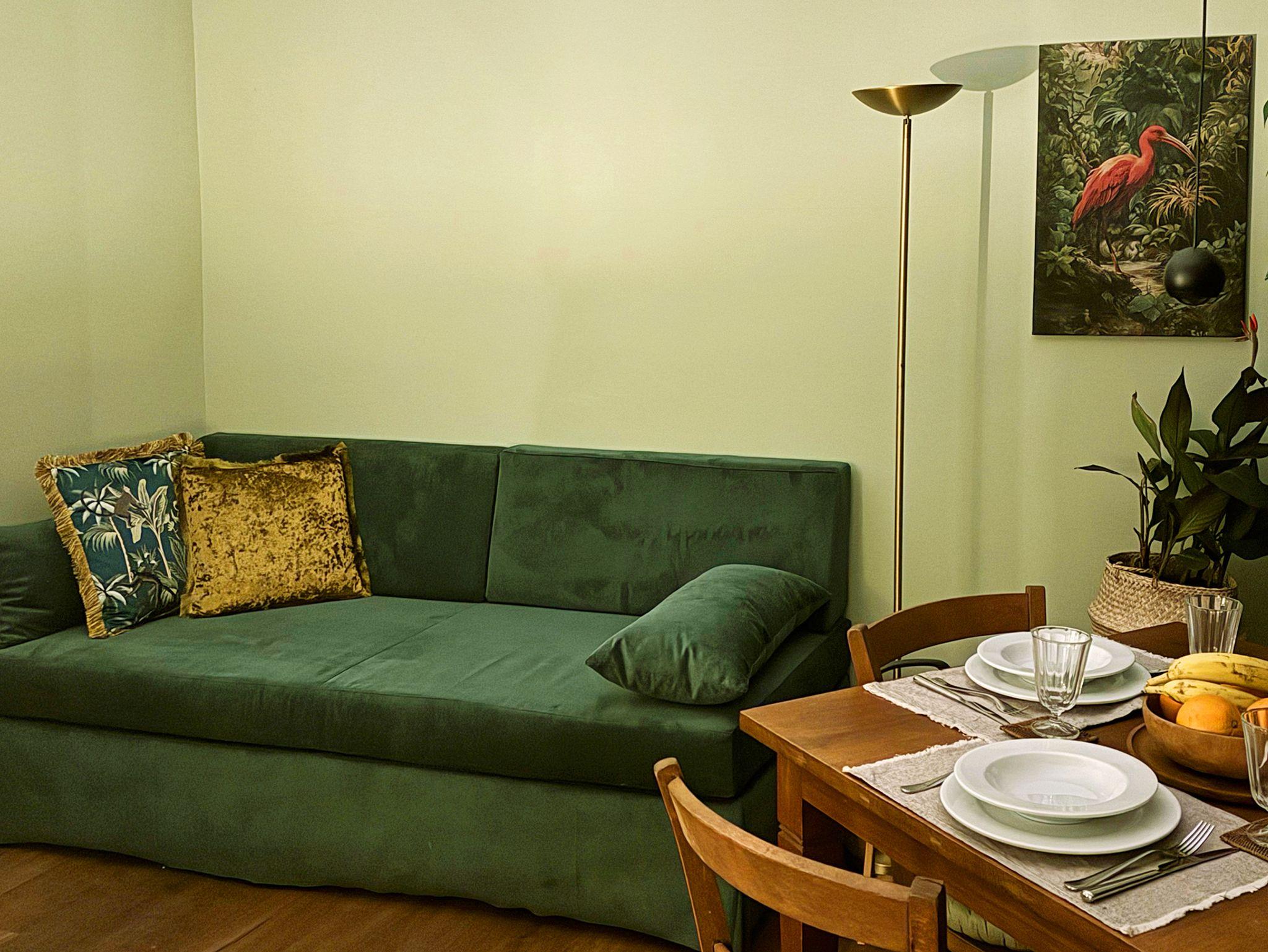 Über eine kleine Diele kommt ihr ins Wohnzimmer, in dem sich der Esstisch und das gemütliche Sofa befinden, wenn ihr eure Lieblingsserien ansehen wollt.
