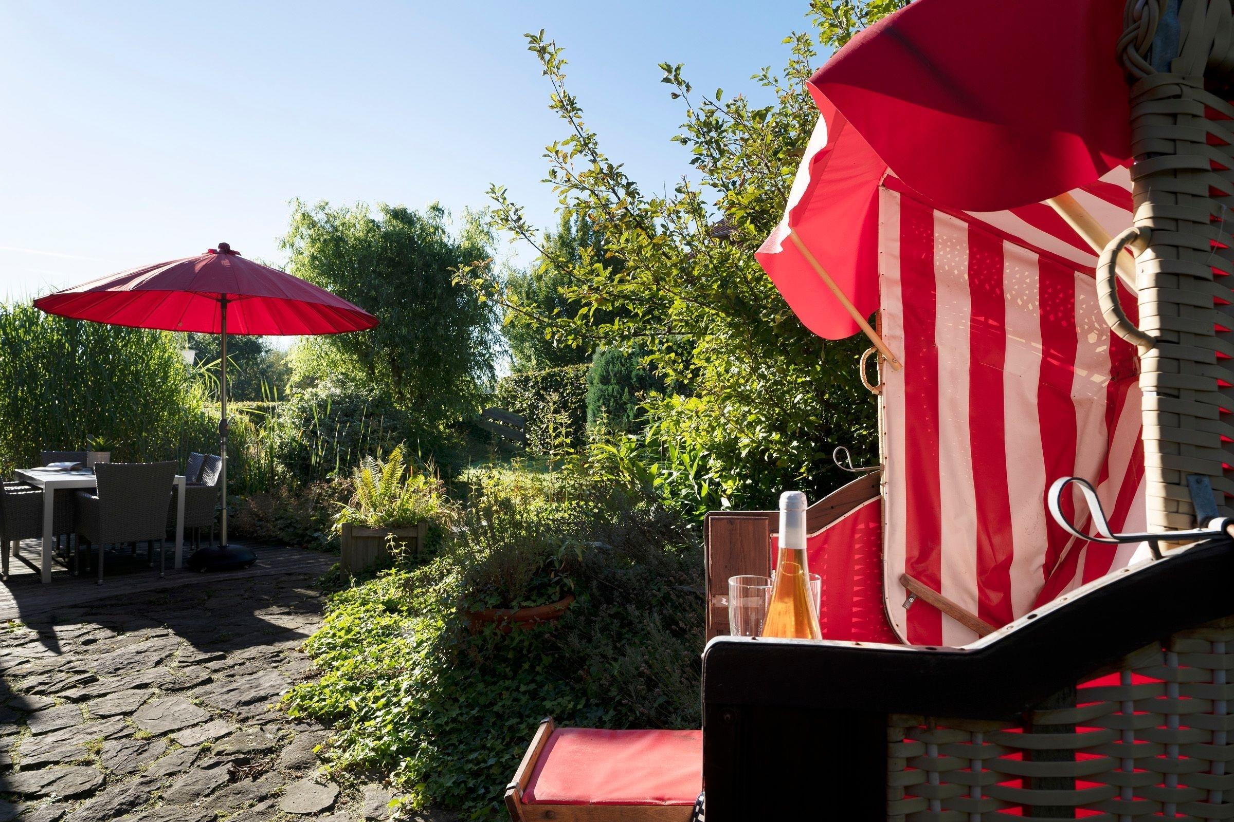 Charmantes Ferienhaus in Eutin-Fissau mit Terrasse, Garten und Strandkorb für entspannte Urlaubstage.