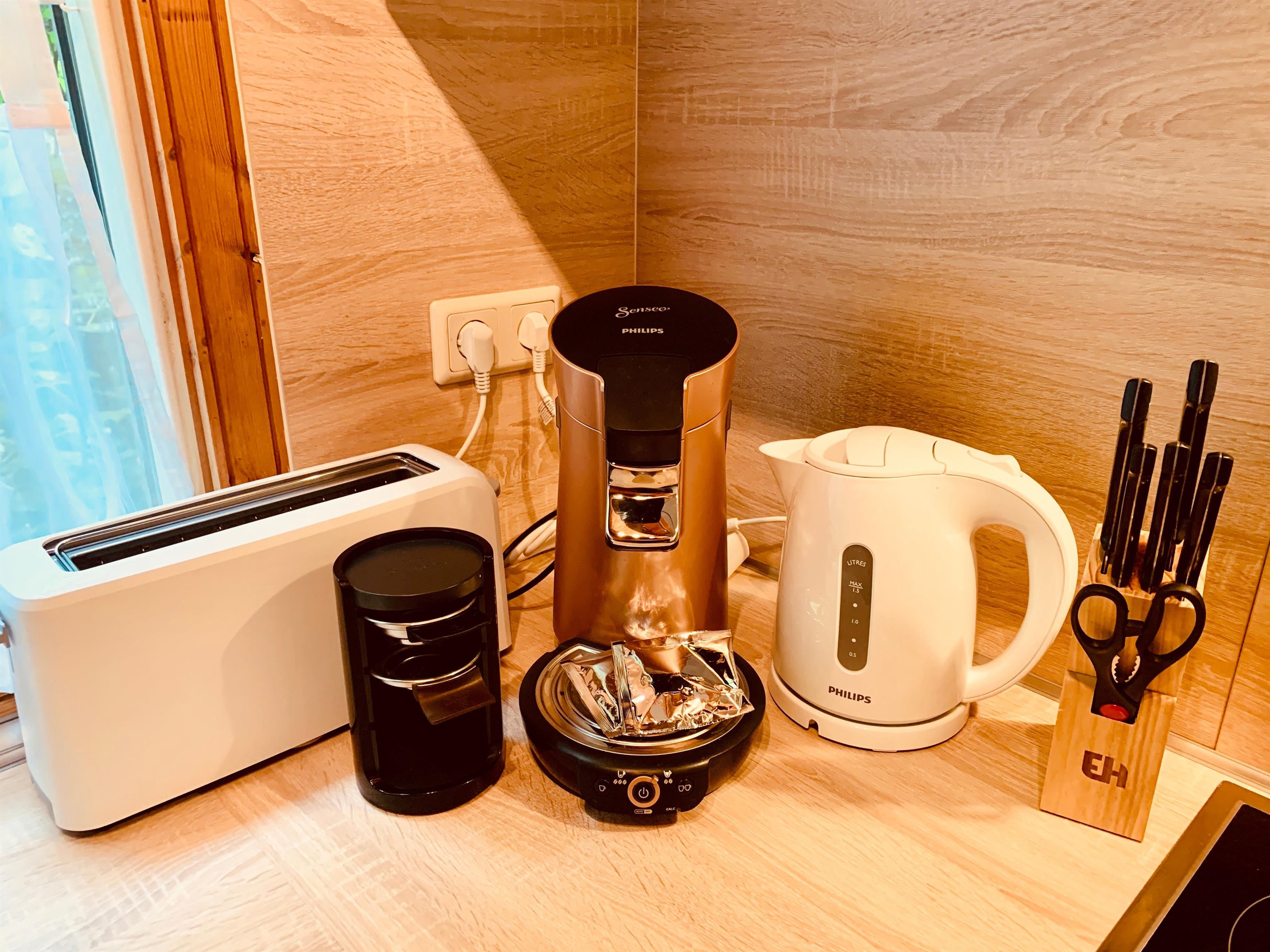 Die zum Wohnraum offene und neue Küche verfügt u.a. über einen Backofen und Ceranfeld, einen Kühlschrank mit Gefrierfach, Mikrowelle, Toaster, Wasserkocher und viele weitere wichtige Utensilien.