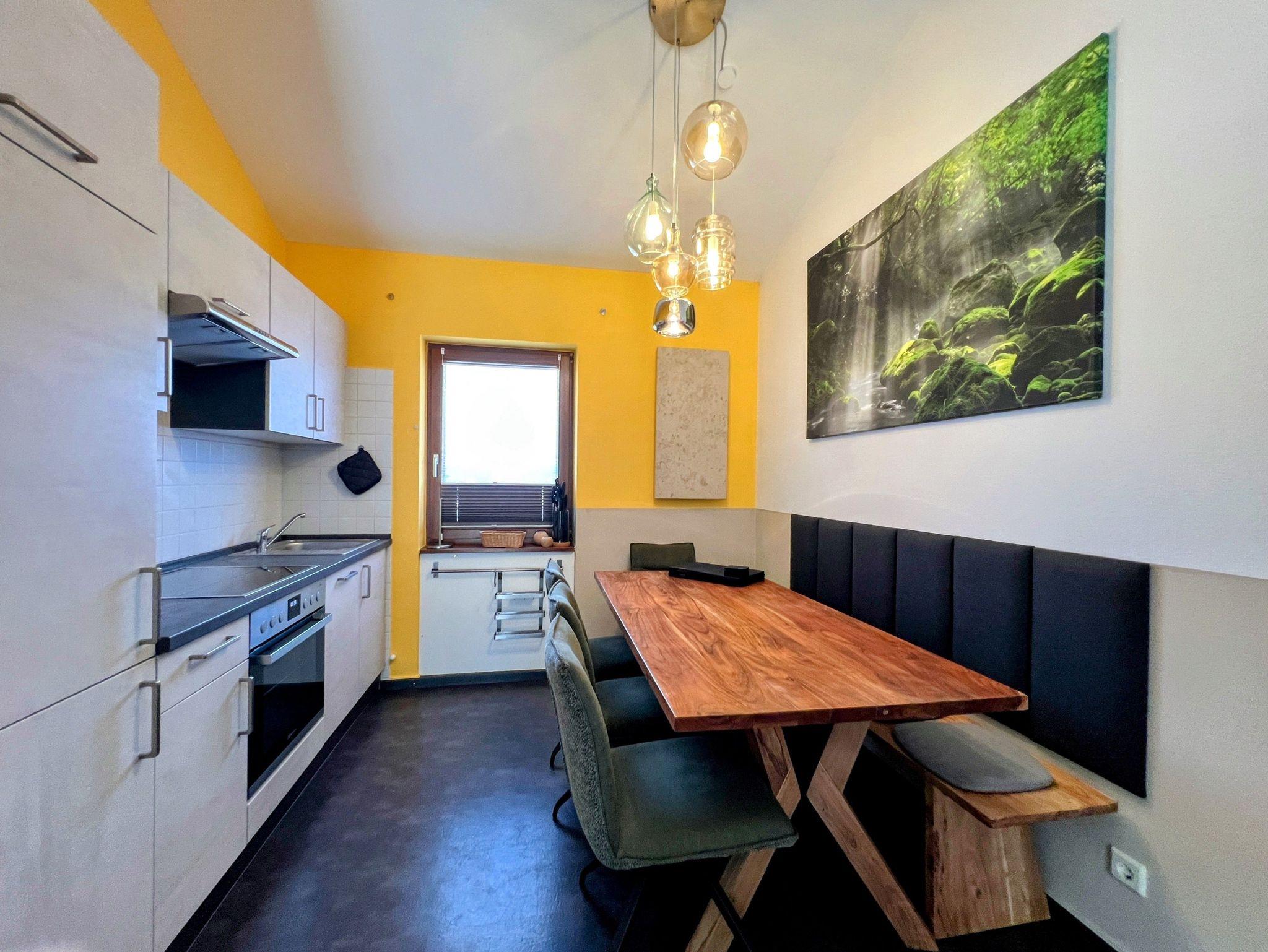 Die voll ausgestattete Küche bietet u. a. Geschirrspüler, Backofen, Mikrowelle, Kaffeemaschine, Wasserkocher, Toaster sowie Hand- und Stabmixer.