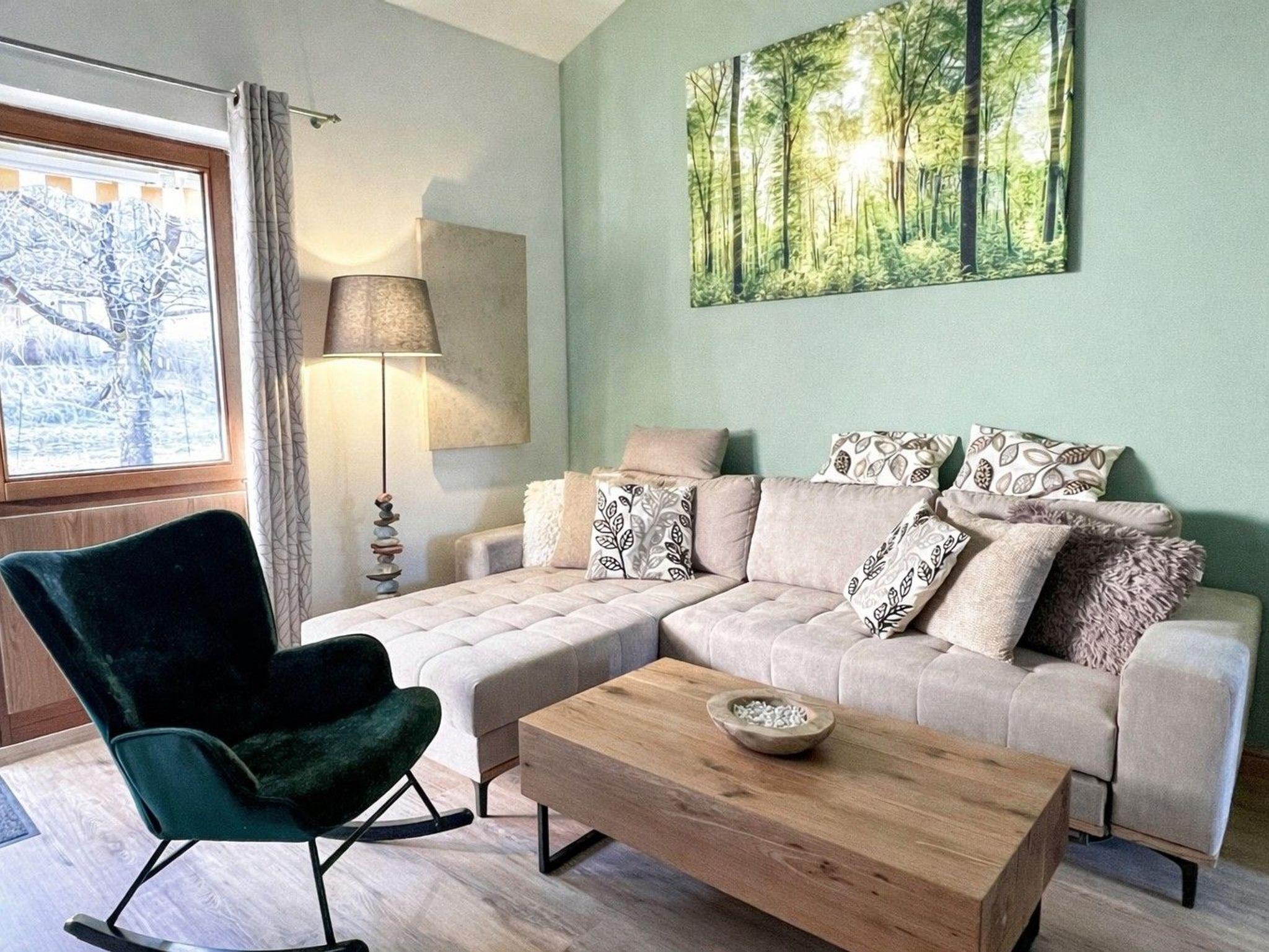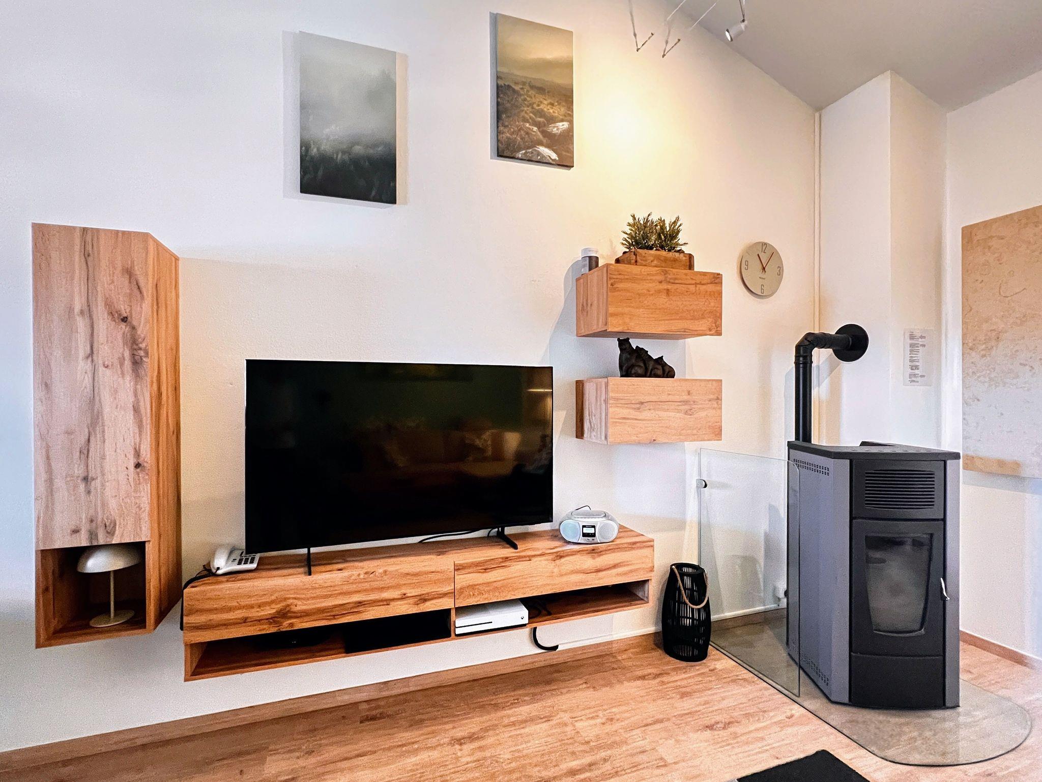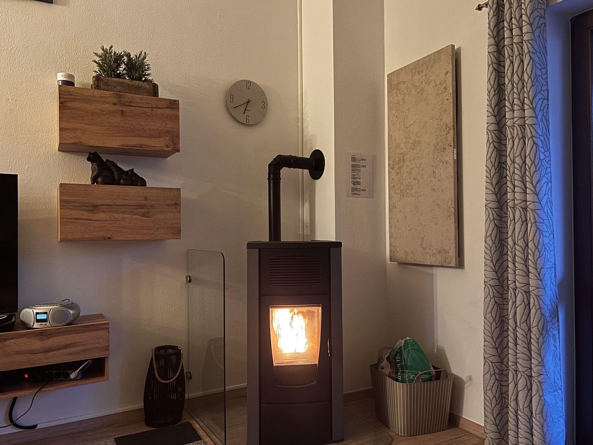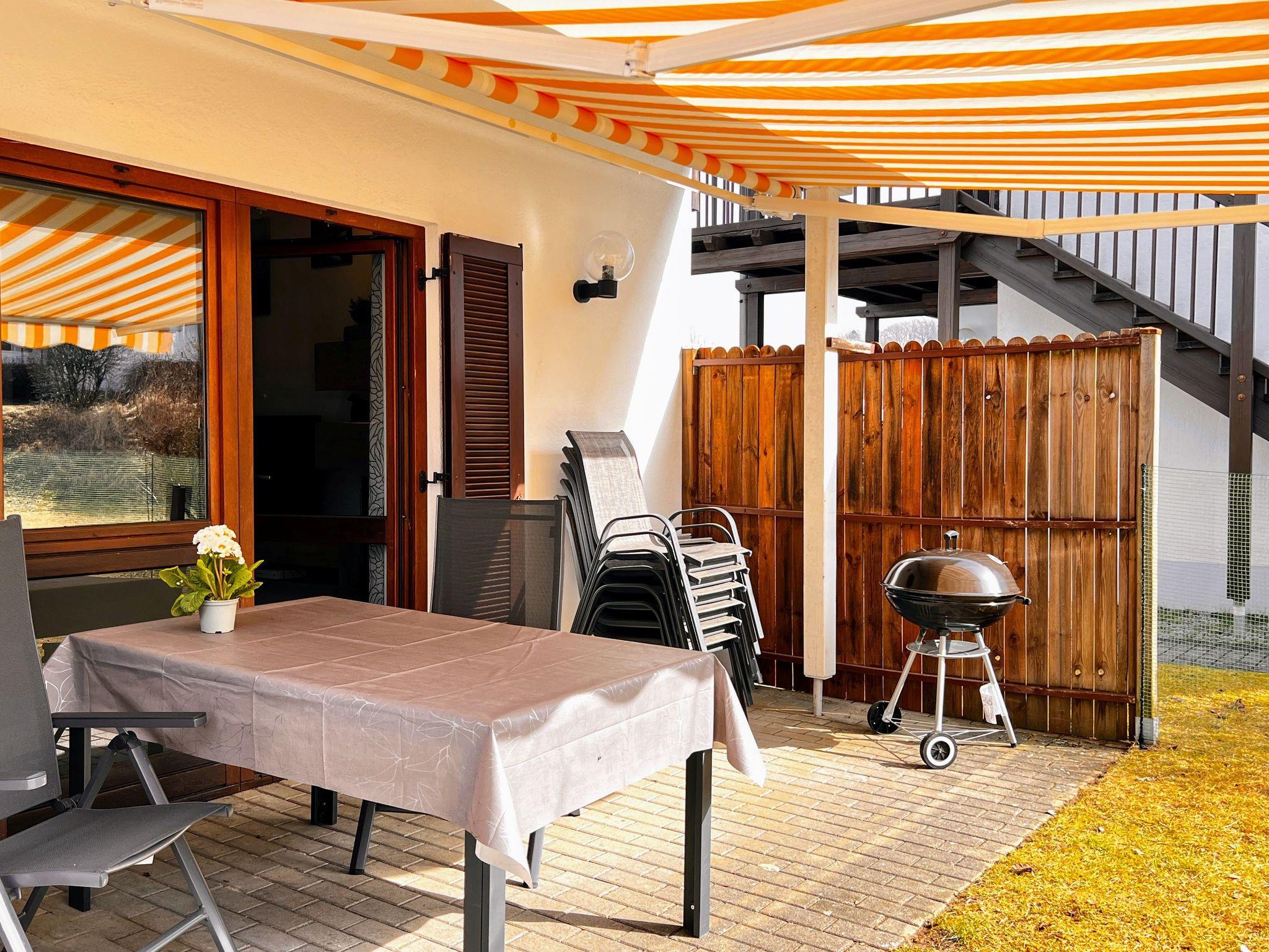 Die sonnige Terrasse mit Markise lädt zum Entspannen und Spielen ein, Grill und Sonnenschirm gehören ebenfalls zur Ausstattung. Im Wohnbereich sorgt ein Pelletofen für eine gemütliche Atmosphäre.