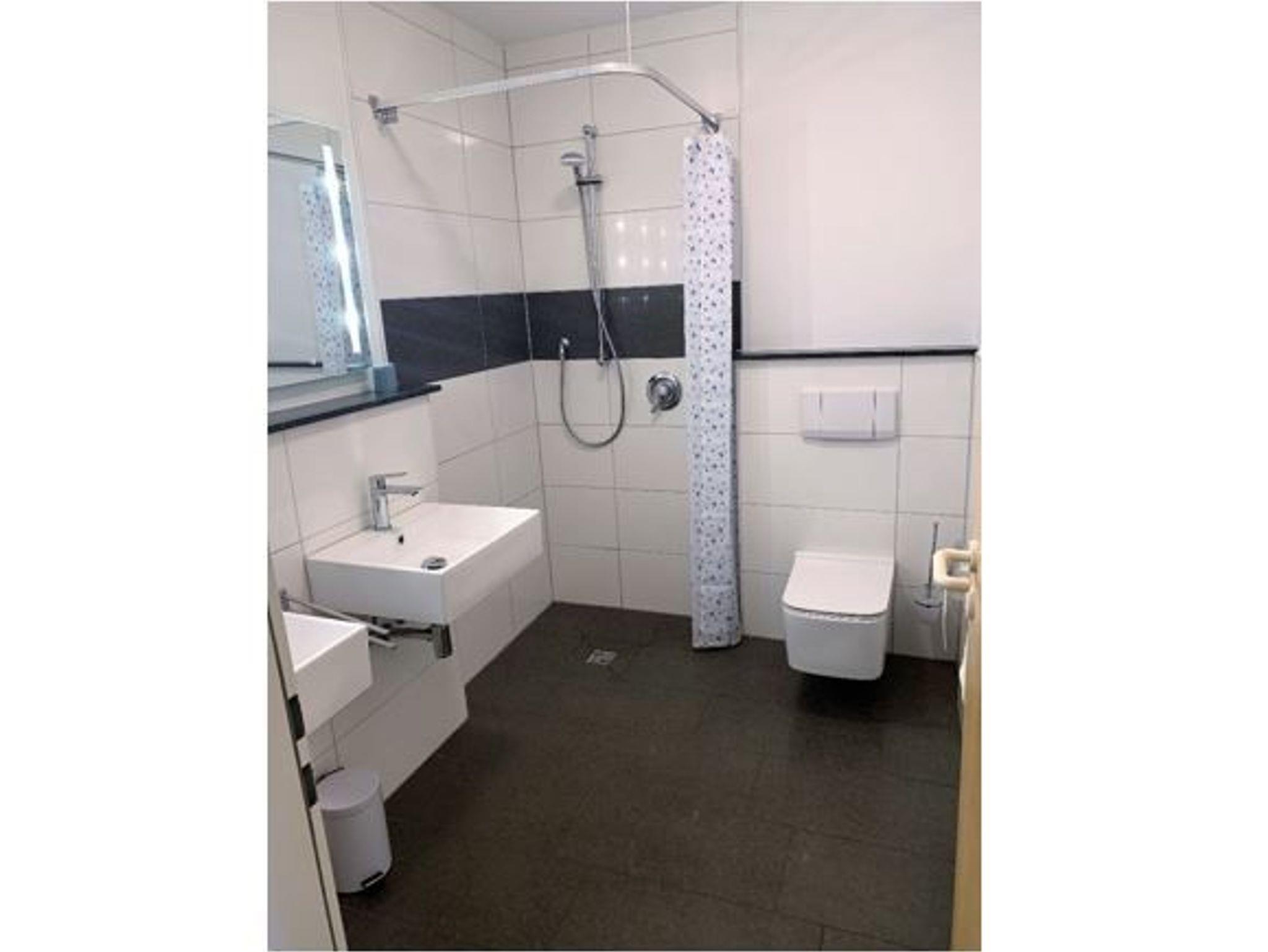 Badezimmer mit ebenerdiger Dusche, Föhn, Hocker / separates WC