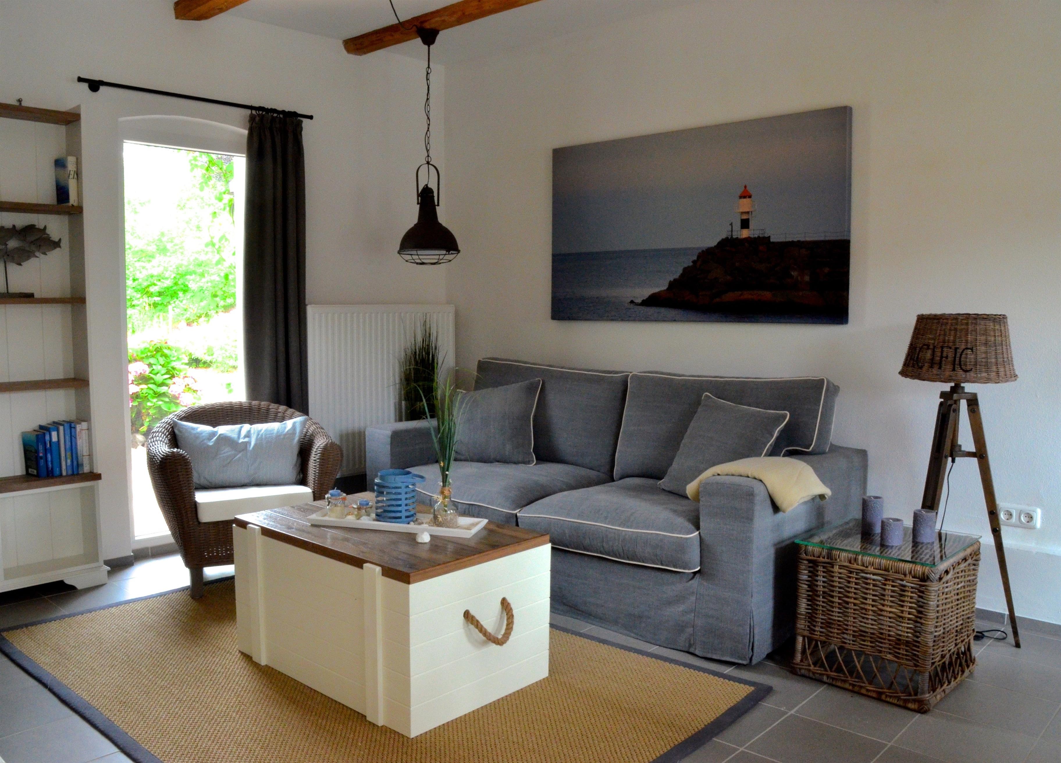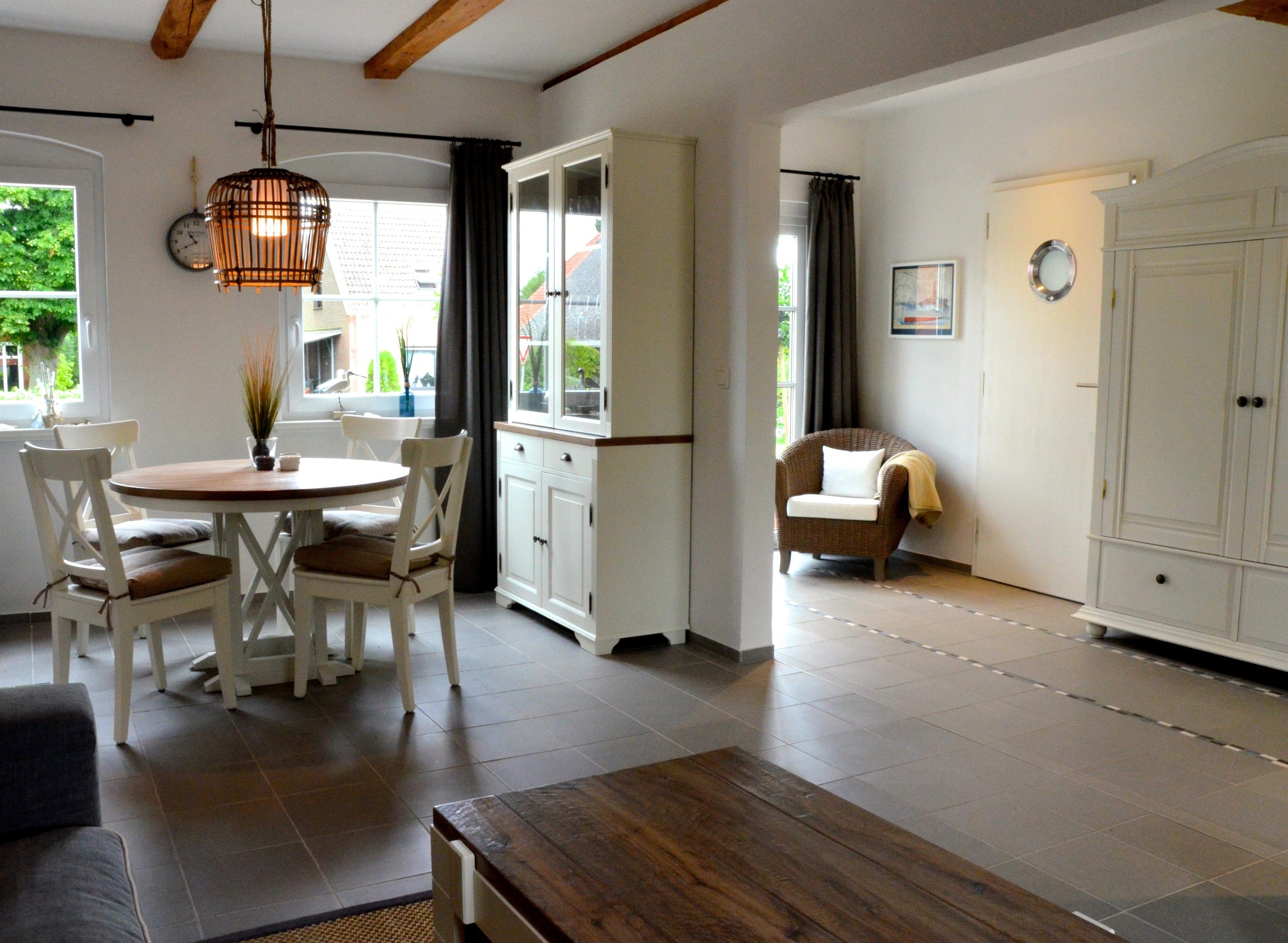 Das Wohn- und Esszimmer ist im nordisch-maritimem Flair eingerichtet.
