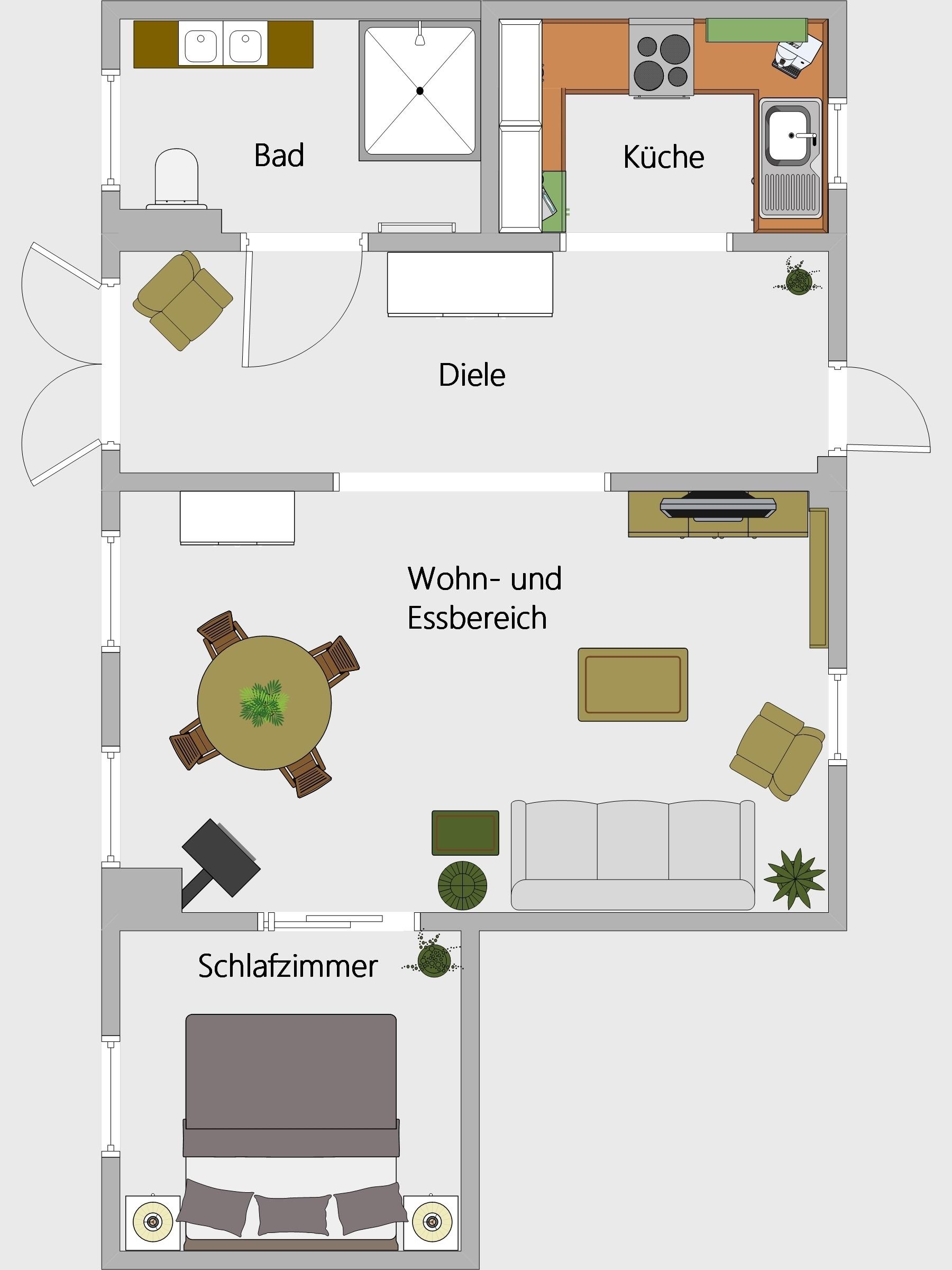 Auf ca. 65 qm finden Sie eine geräumige Wohnung für 2 - 3 Personen mit Möbeln aus unserer Tischlerei.
