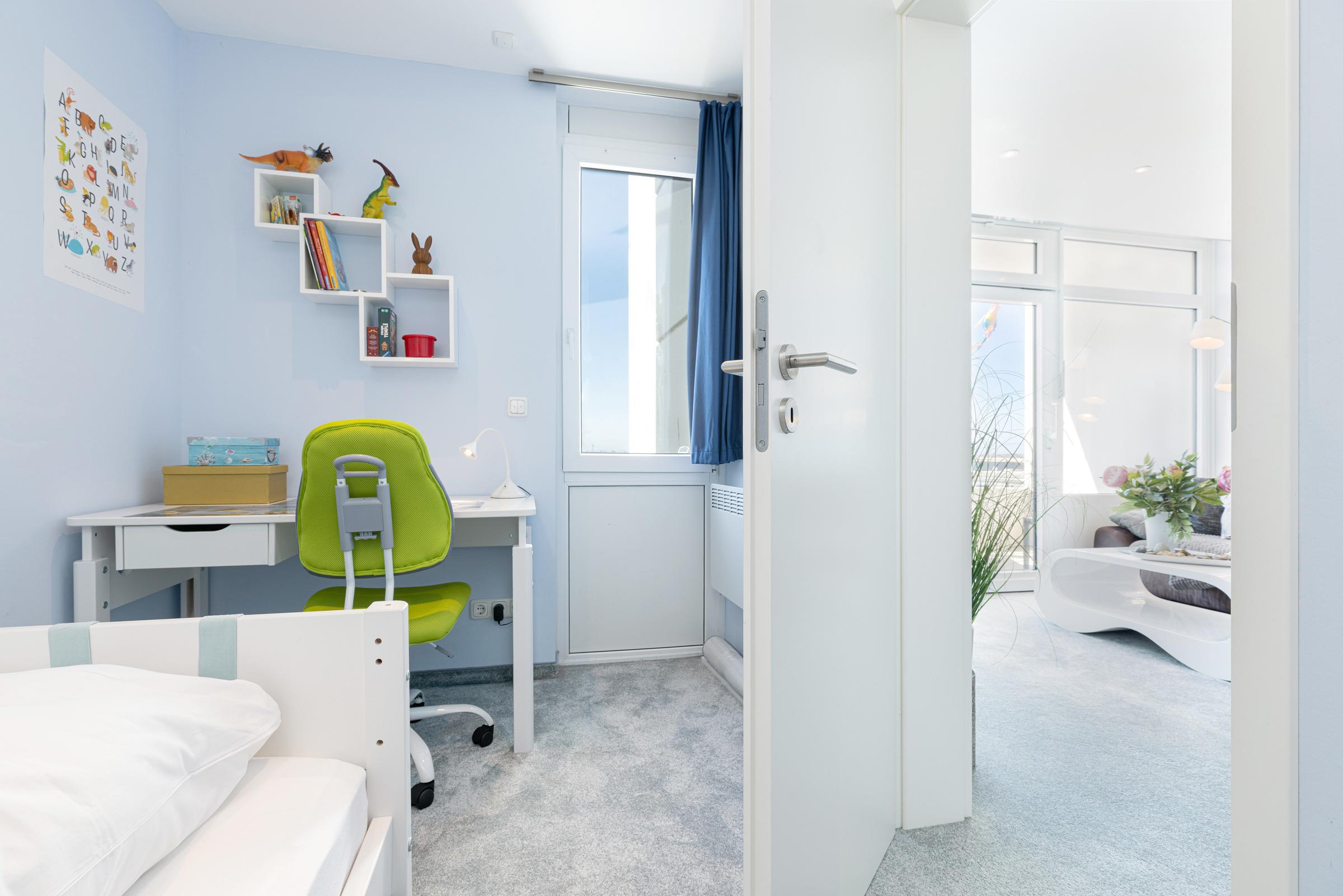Der Blick vom Balkon und aus den Zimmern heraus ist herrlich: Sie schauen über die davor liegenden Bungalowdächer hinweg direkt aufs Meer in rund 100 Metern Entfernung. Beobachten Sie die ein- und ausfahrenden Schiffe und Boote oder das gegenüberliegende Surf- und Kite-Gebiet. Im Hintergrund ist die legendäre Fehmarnsundbrücke zu sehen. Machen Sie es sich gemütlich im Wohnschlafbereich. Das Doppelbett ist ein elektronisches Schrankbett, das tagsüber charmant verschwindet. Es fährt per Knopfdruck ein und aus. Auch die gemütliche Couch hat eine Doppelbett- oder Fernsehposition-Funktion (nach vorne hin ausklappbar). Die Küche umfasst sämtliche Annehmlichkeiten: Herd mit Cerankochfeld, Backofen, Kühlschrank mit kleinem Eisfach, Mikrowelle, Spülmaschine, Waschmaschine/Trockner (Waschtrockner), Kaffeemaschine, Wasserkocher, Toaster, Sandwich Maker sowie Raclette. Genießen Sie Ihre Mahlzeiten am Esstisch oder auf dem Balkon. Im Kinderschlafzimmer befindet sich ein gemütliches Einzelbett (ca. 90x200 cm) sowie ein Schreibtisch. Im modernen Duschbad gibt es eine Fußbodenheizung und eine große Handtuchhalterheizung. Für ein angenehmes Urlaubserlebnis sorgt ein Fliegengitter vor dem Schlafzimmerfenster und der Balkontür.