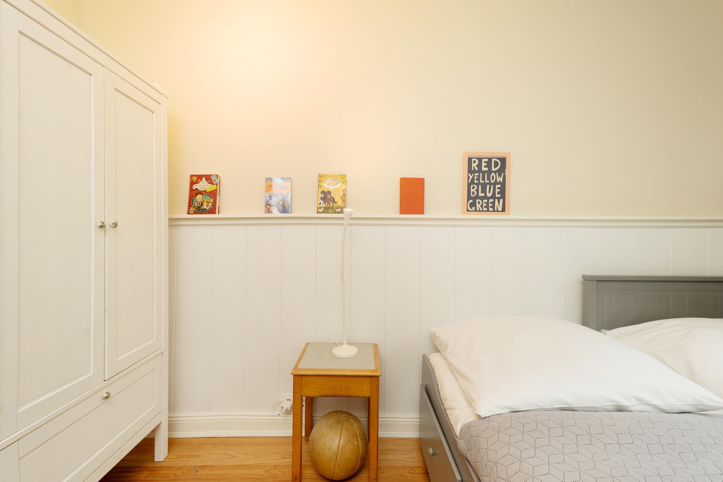 Schlafzimmer 2 (EG): 1 Einzelbett (80x200 cm, ausziehbar auf 160x200 cm), Kleiderschrank, Verdunkelung: leichte Vorhänge, Platz für ein Babybett vorhanden