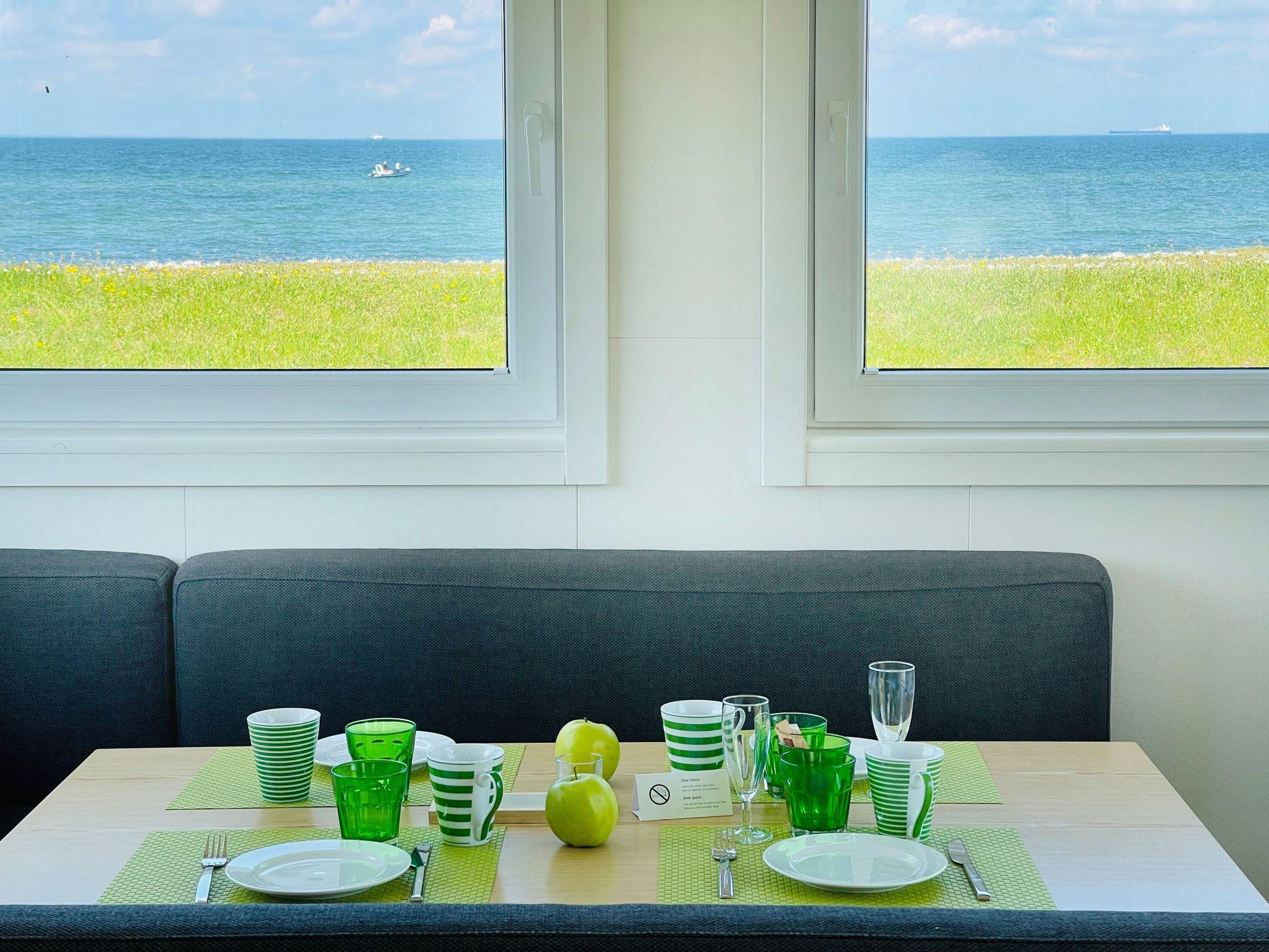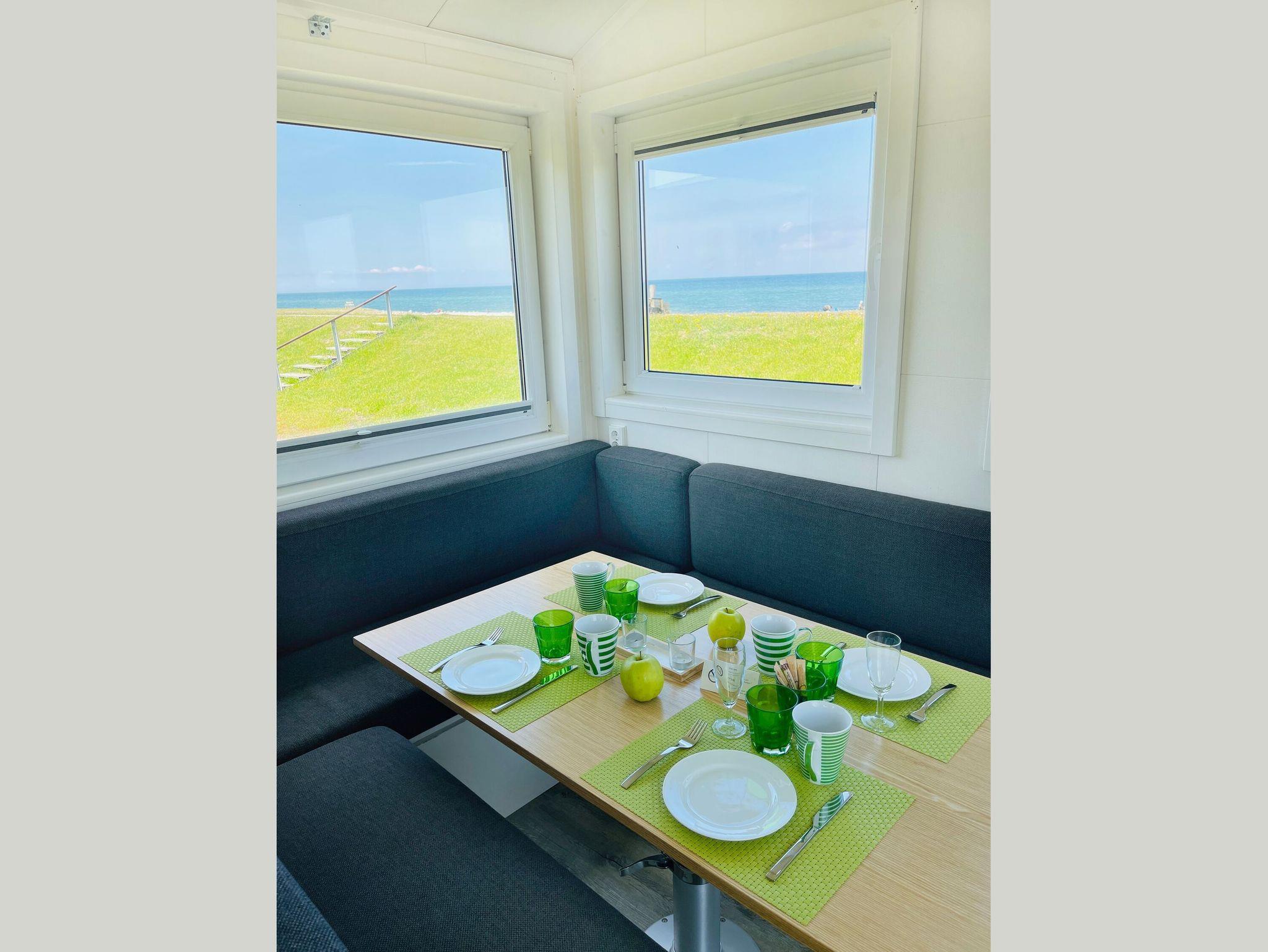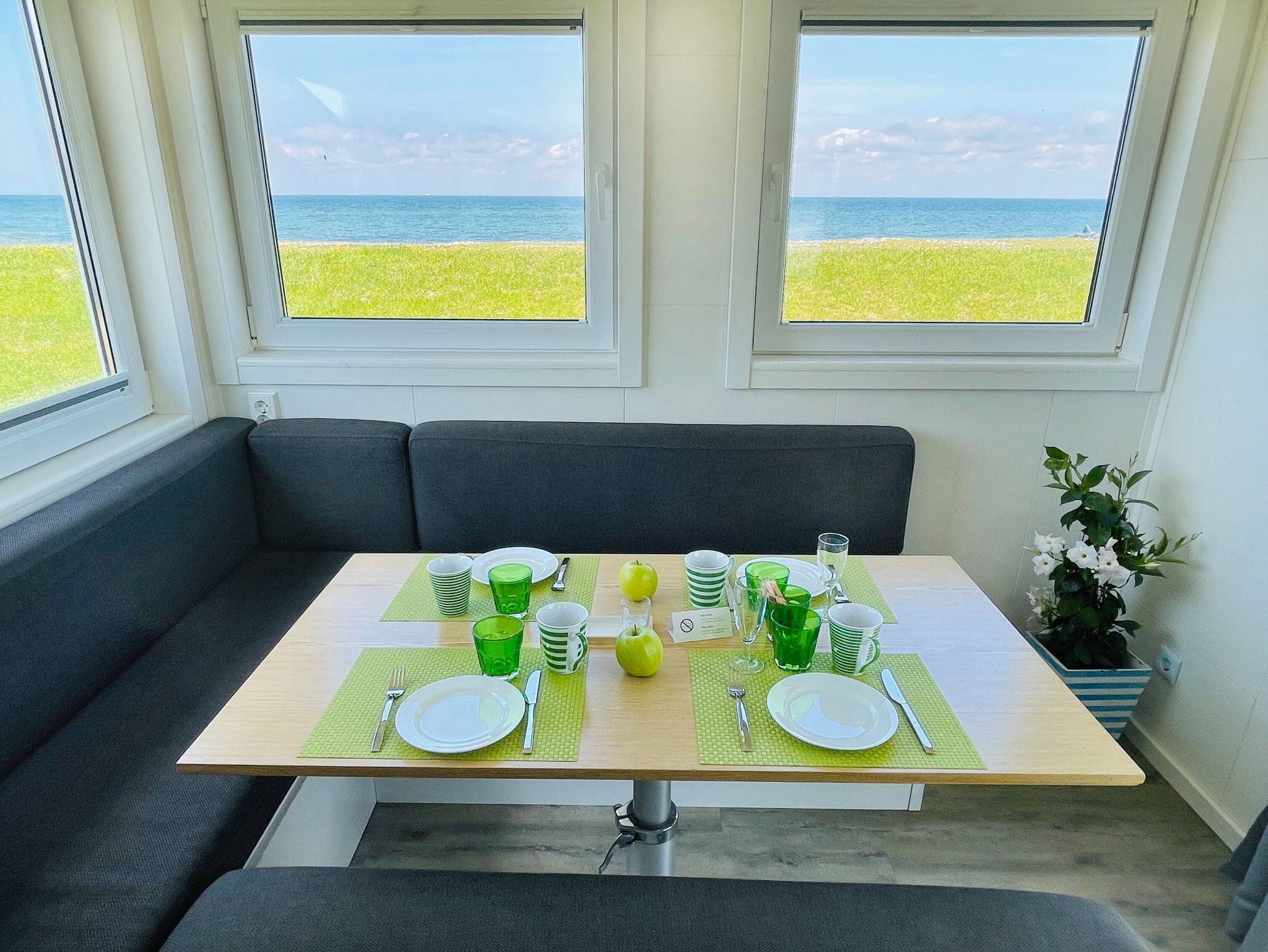 Das Tiny House James Cook auf Fehmarn bietet Meerblick, eine Terrasse und direkten Strandzugang für einen entspannten Urlaub zu zweit.