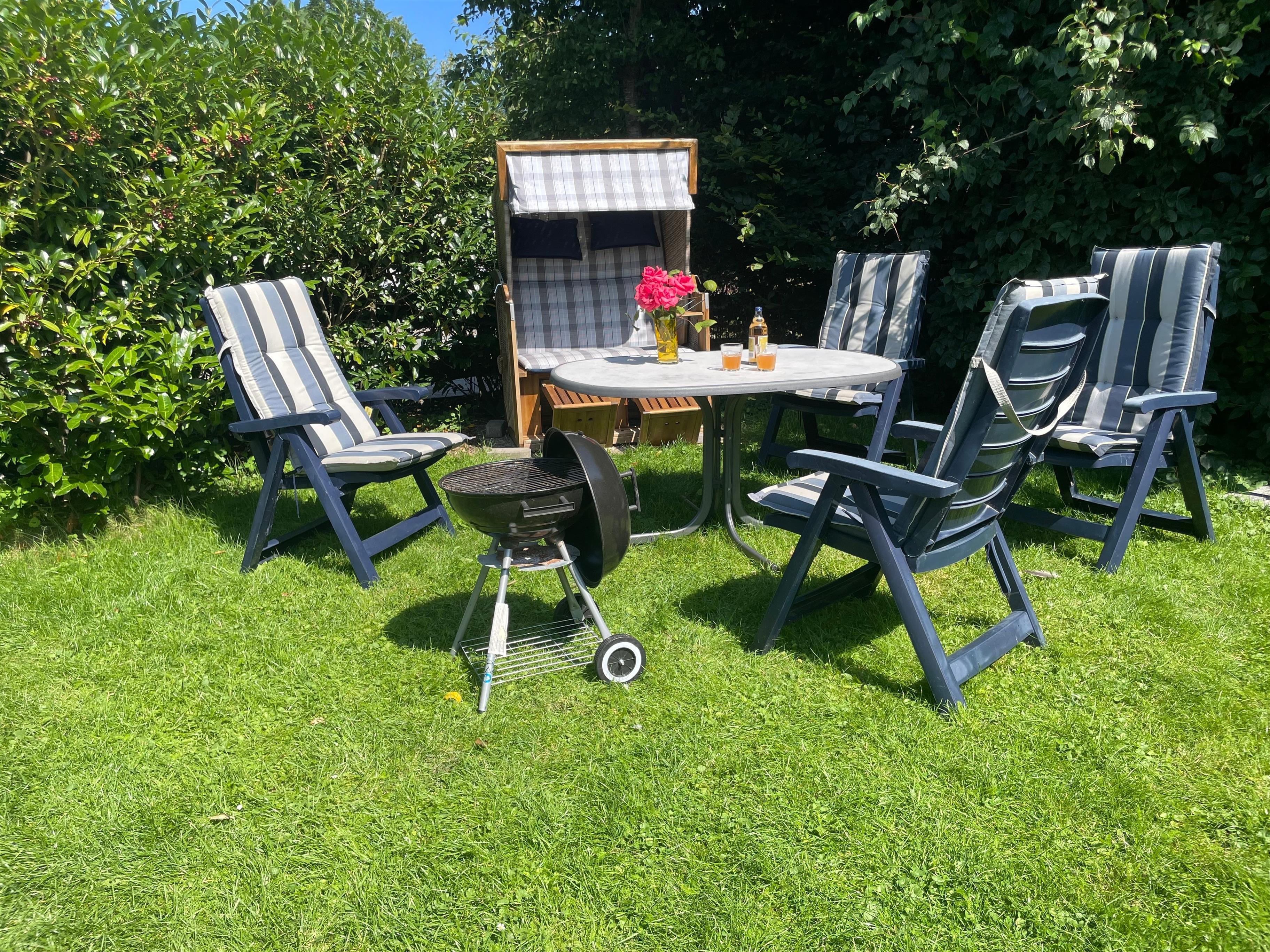 Gemütliche Ferienwohnung auf Fehmarn mit Garten, Strandkorb und Grill für entspannte Tage am Meer.